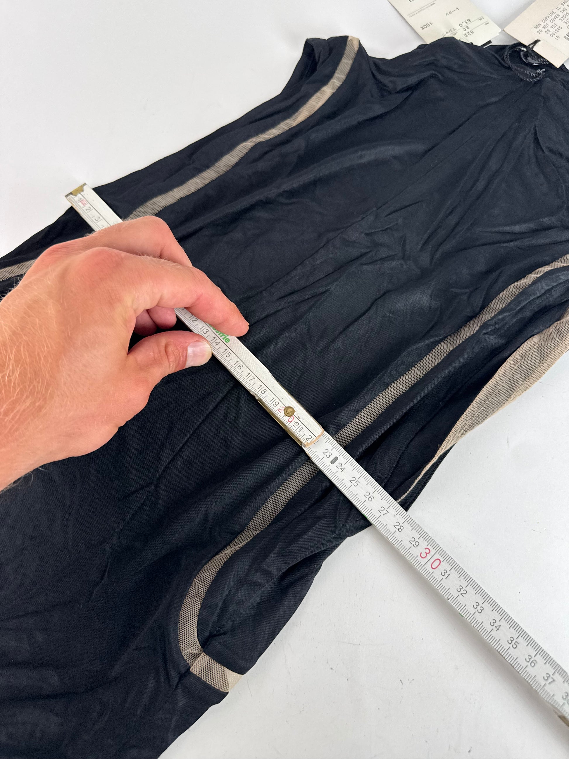 This vintage top is finely crafted of black polyester with semi-transparent vertical stripe detailing and features a classic turtleneck design. It has a back zipper closure and comes in unworn condition with original tags, though slightly creased from storage.