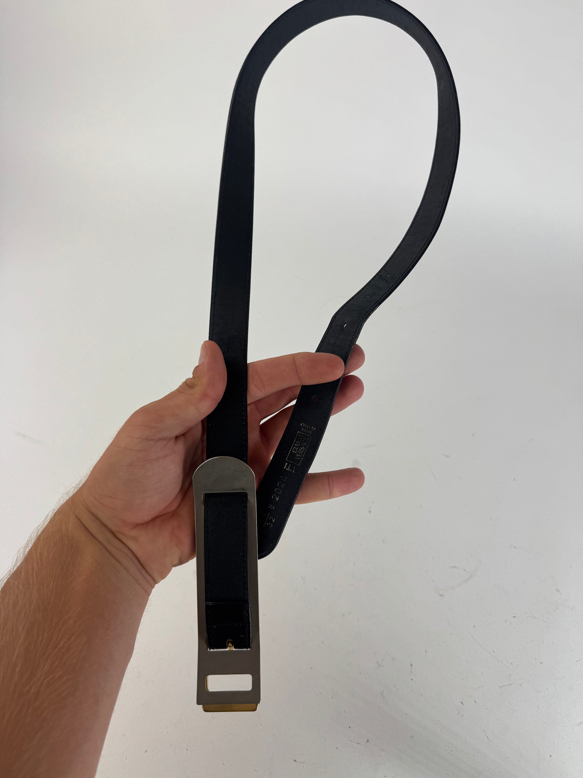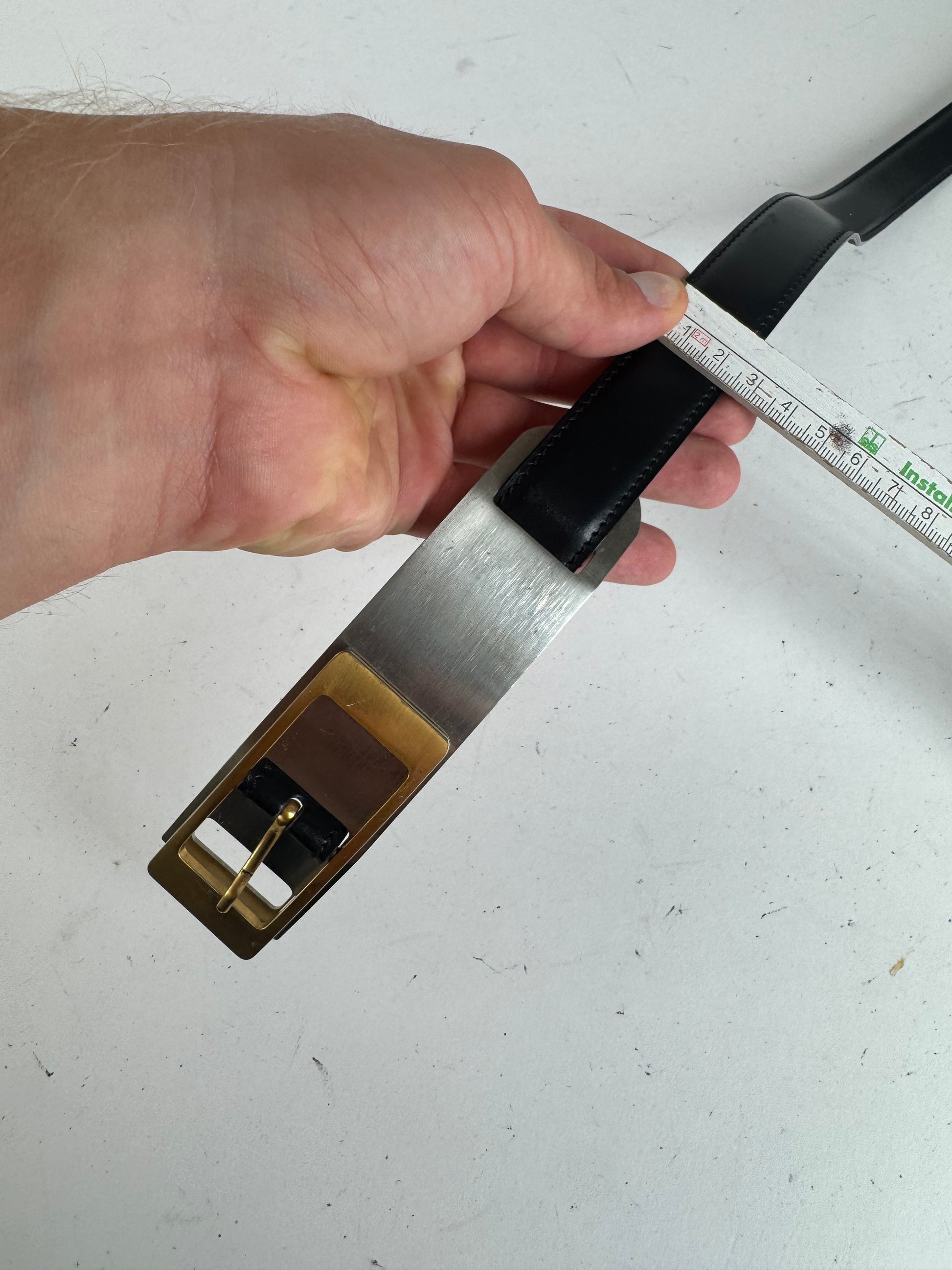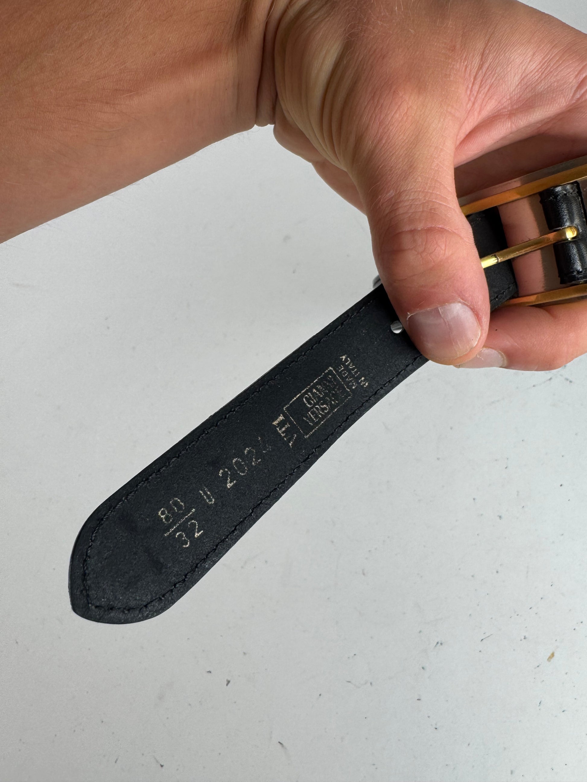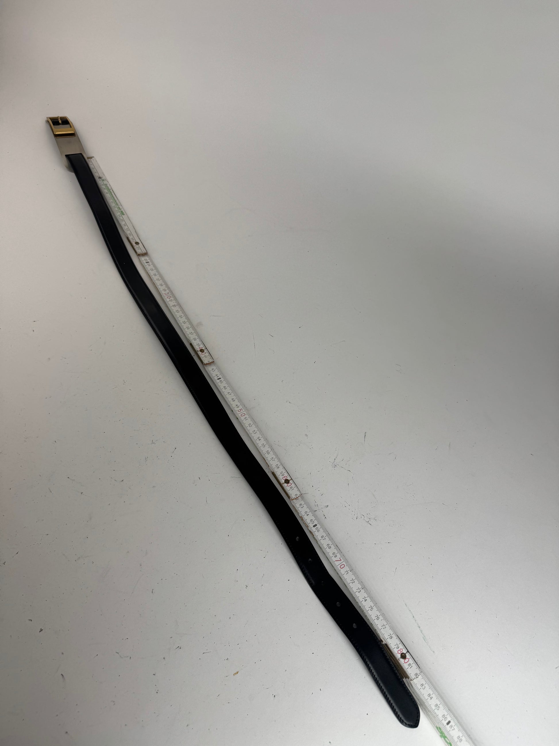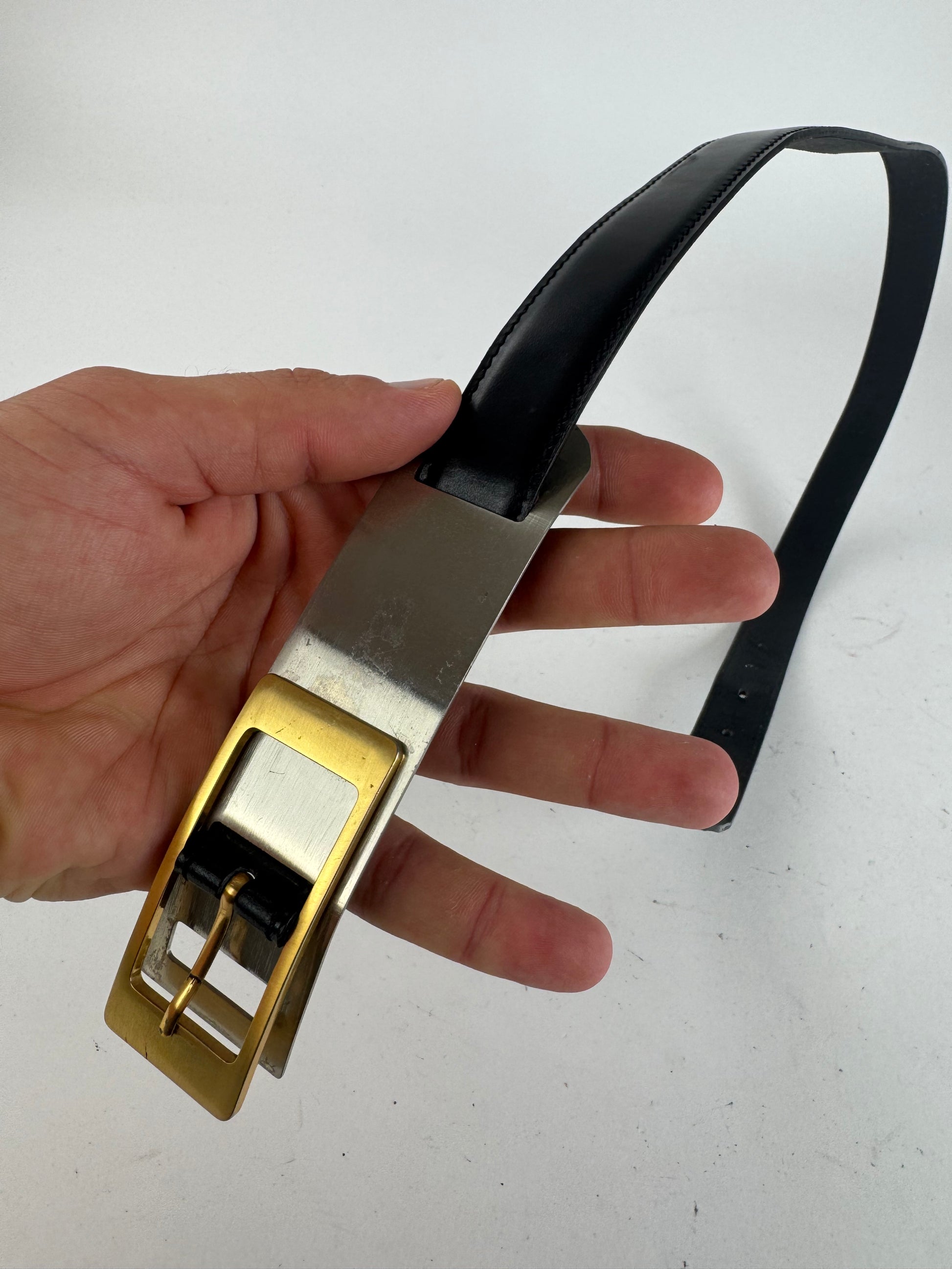 This elegant belt is finely crafted of smooth black leather from the 1990s. The piece features a mixed silver and gold-tone steel buckle.
