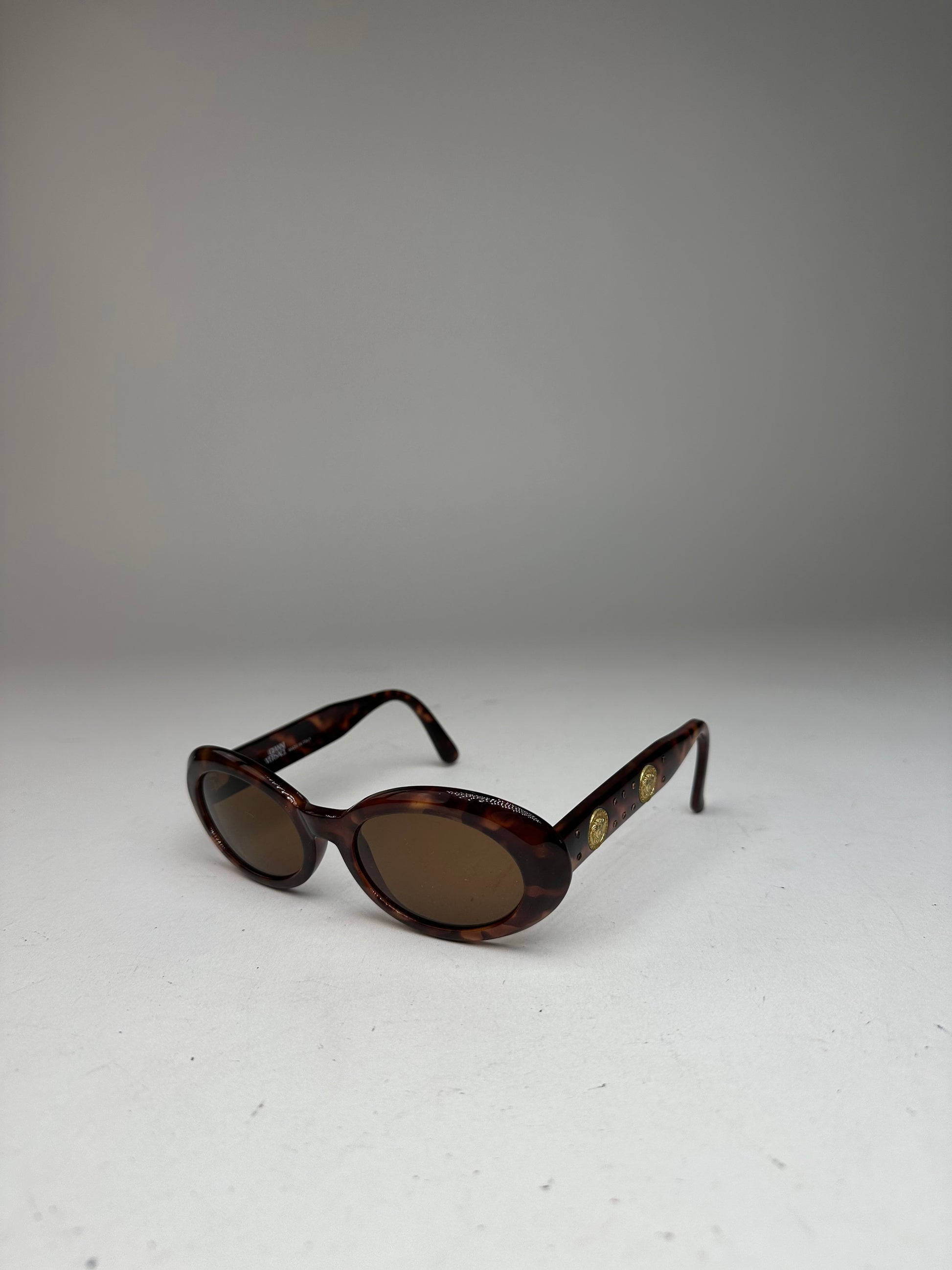 GIANNI VERSACE Vintage Sunglasses. These striking sunglasses are crafted of brown plastic in a leopard pattern and feature oval brown tinted lenses. The temples are slightly curved at the ends and adorned with two iconic Medusa appliqués in gold-tone steel. Made in Italy.