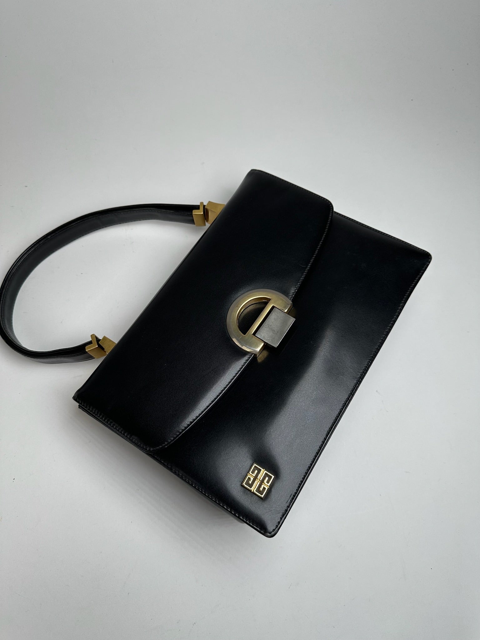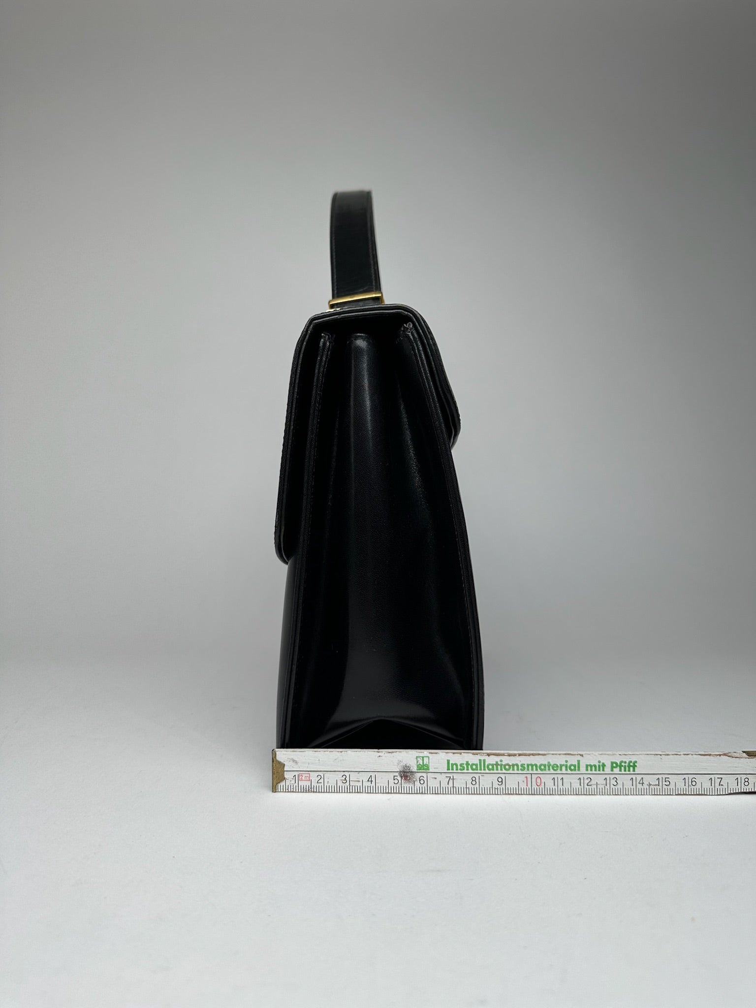 This elegant two-way handbag is finely crafted from smooth black leather. The bag features both a shoulder strap and top handles for versatile carrying options. It is accented with gold-toned hardware and secured with a magnetic closure. The spacious interior is divided into three compartments, offering excellent organization.