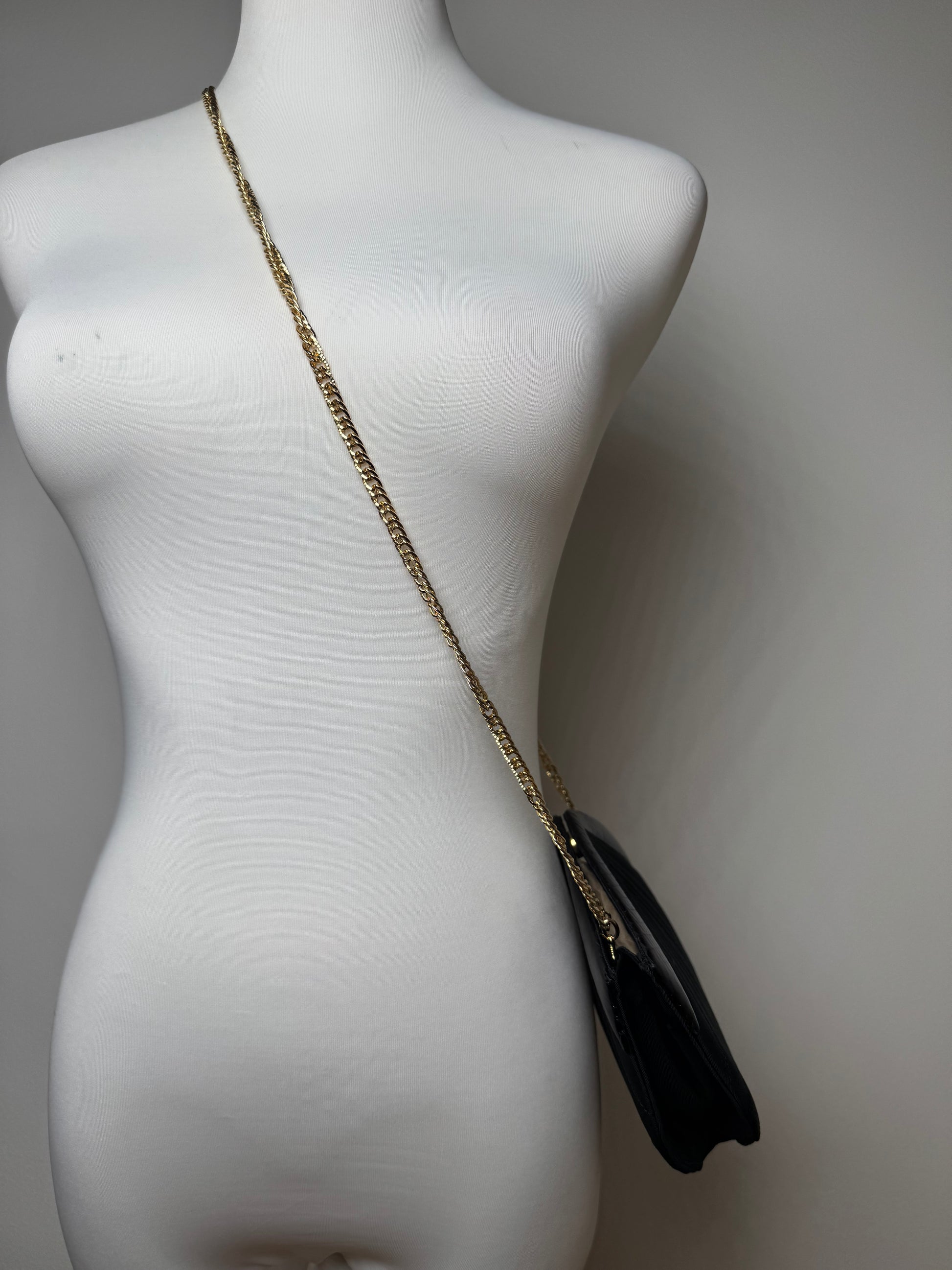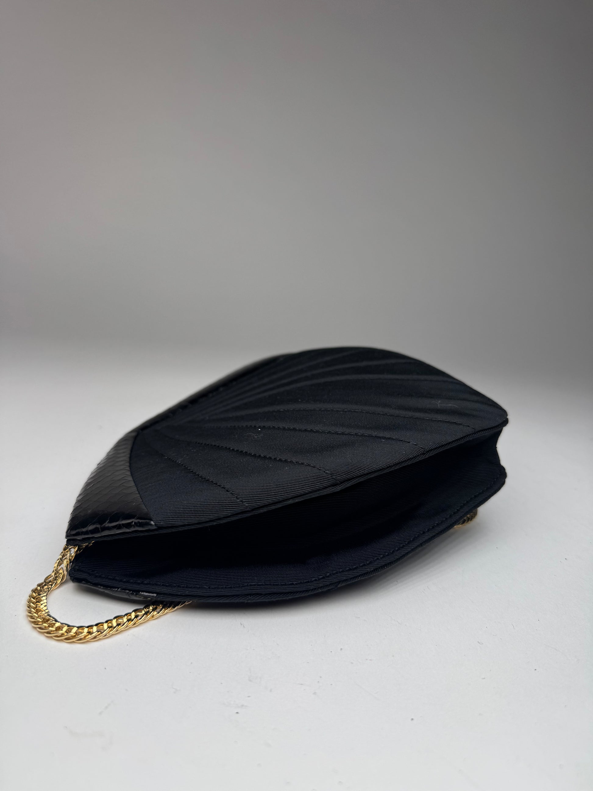 GIVENCHY Vintage Crossbody Bag. This elegant vintage crossbody bag from Givenchy is crafted from a combination of black canvas and black leather with a luxurious snakeskin texture. The structured design is complemented by a gold-toned steel chain strap, adding a refined and sophisticated touch. The interior is lined with black canvas, ensuring durability and a sleek finish. Made in Japan, this timeless piece embodies Givenchy’s signature craftsmanship.