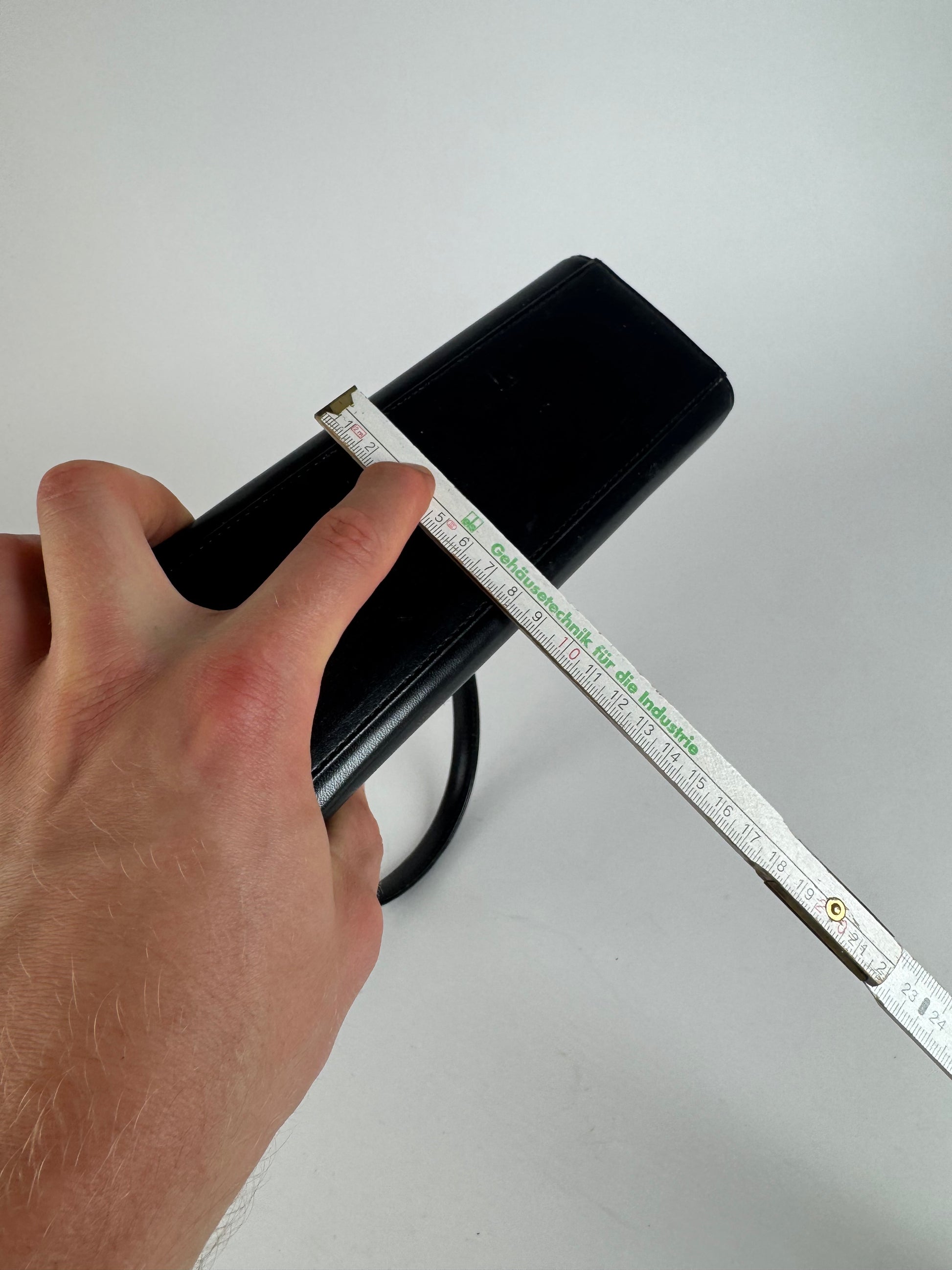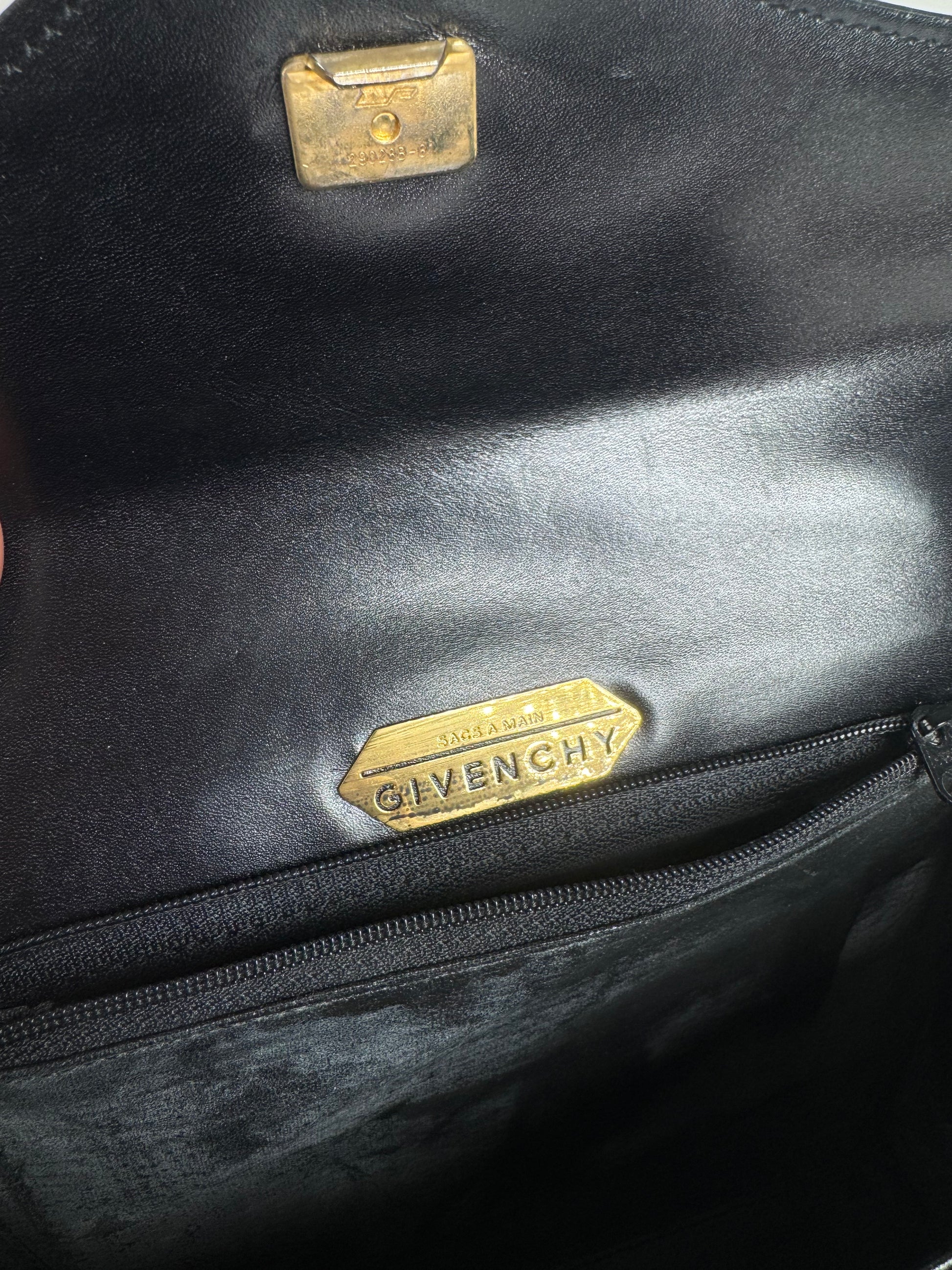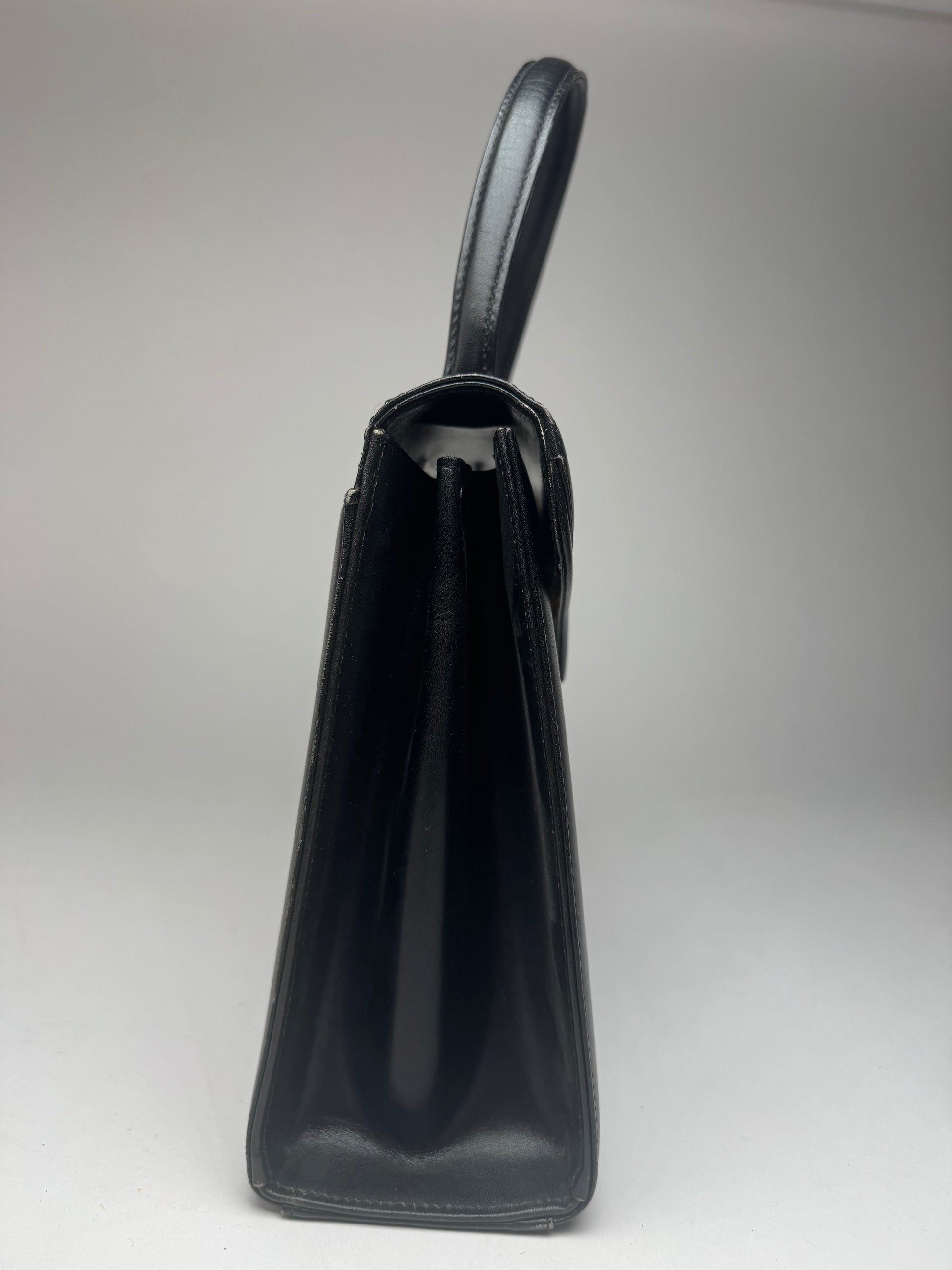 This elegant vintage handbag is finely crafted from smooth black leather. It features a short handle and gold-toned hardware, adding a touch of sophistication. The bag is secured with a magnetic closure and designed with two interior compartments for practical organization. The interior is lined with black canvas, showing some signs of staining.
