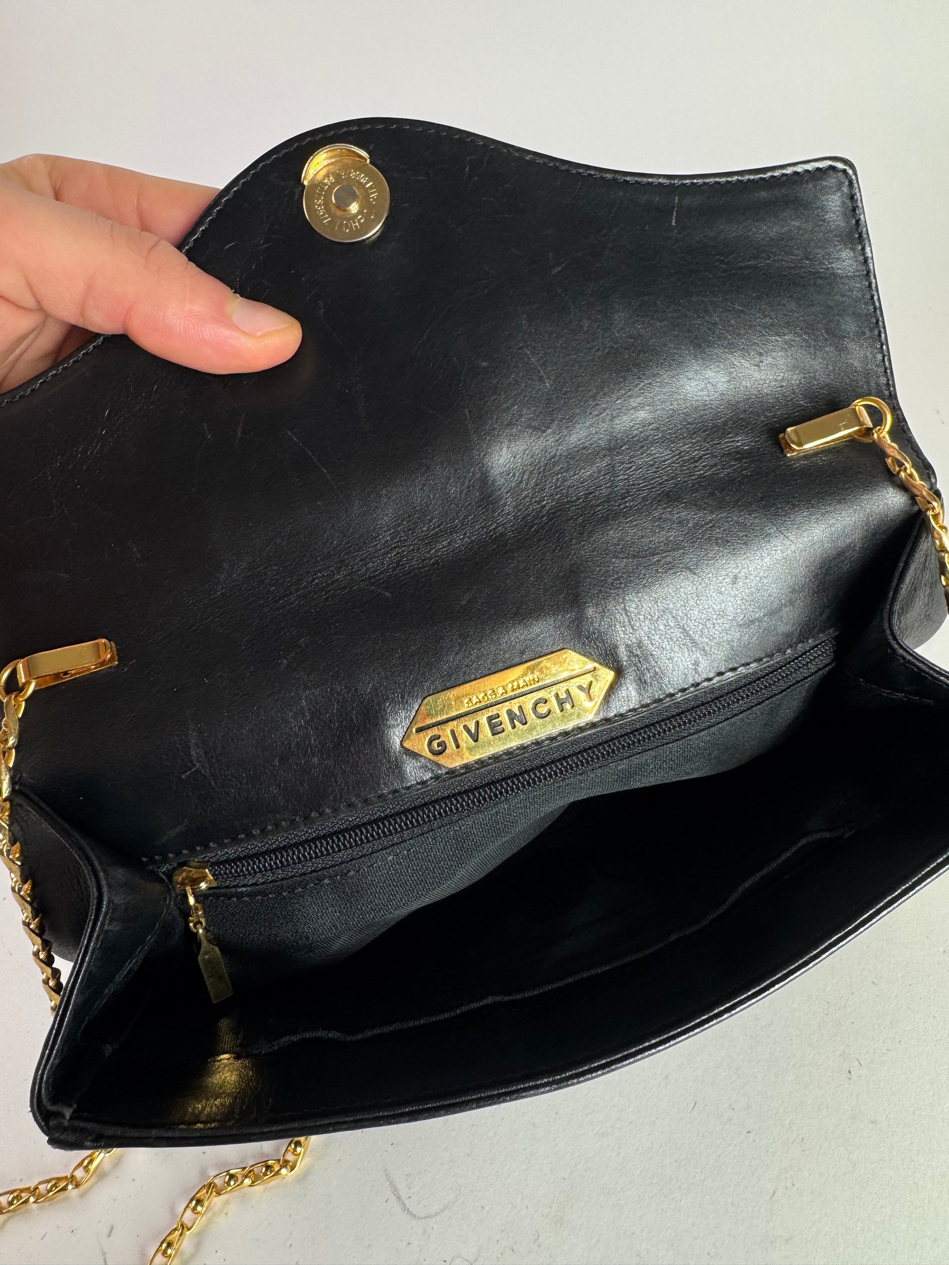 This elegant vintage handbag is finely crafted of smooth black leather. The shoulder bag features a gold-tone steel chain strap, a magnetic closure, and a polished gold Givenchy logo on the front. The flap opens to a black canvas interior.