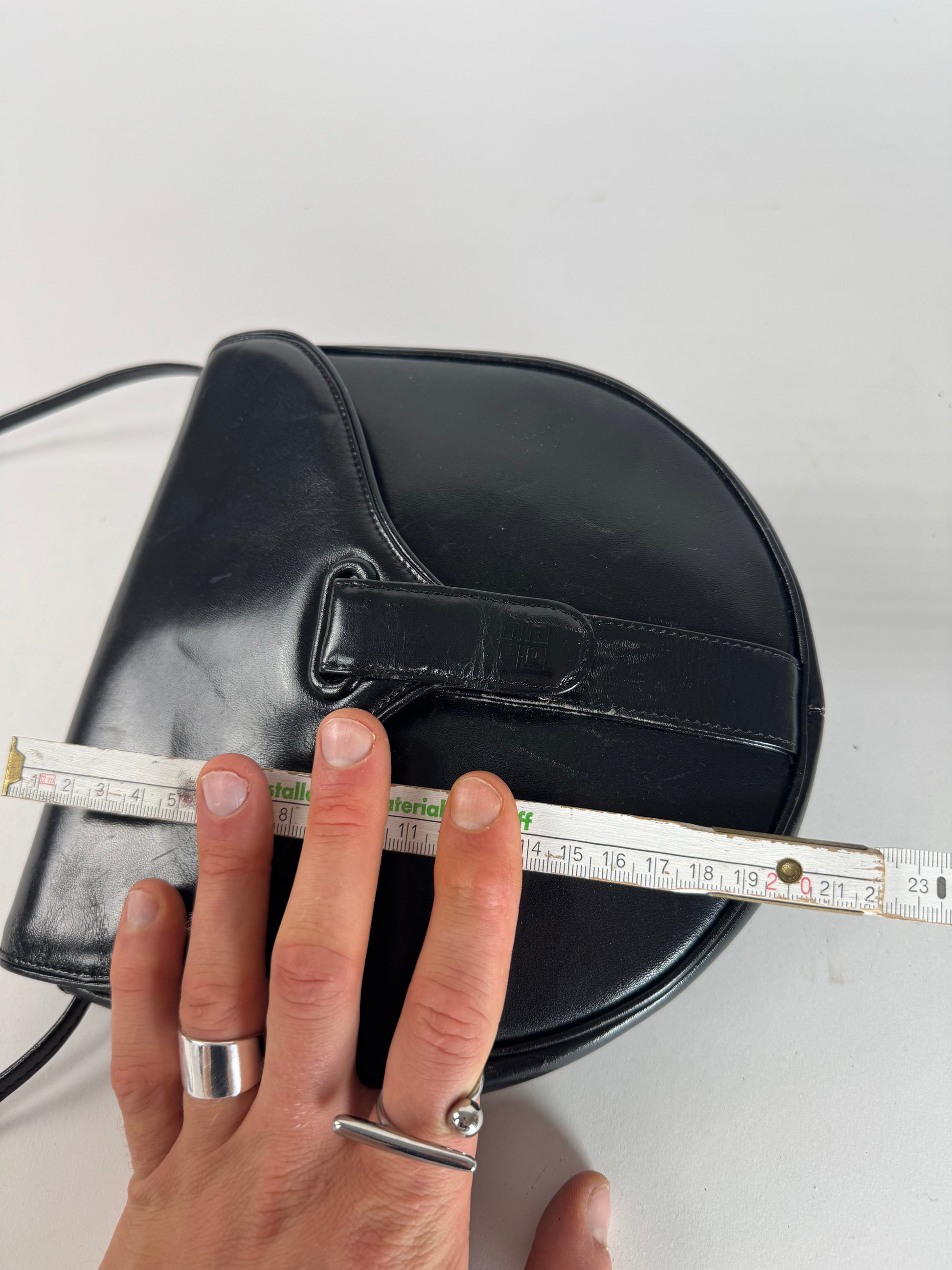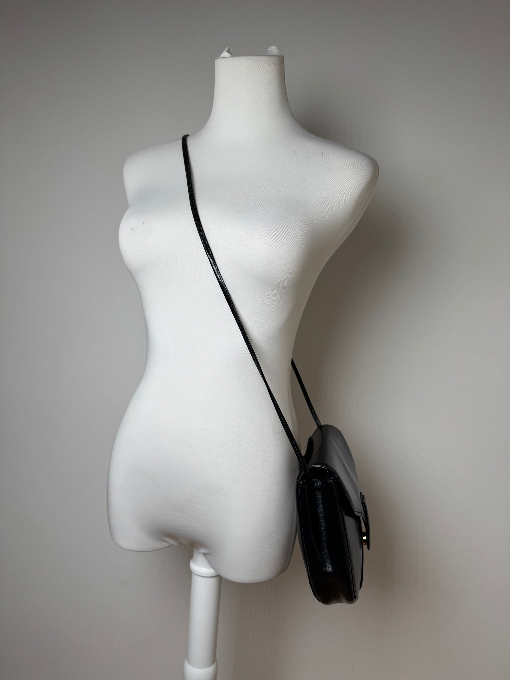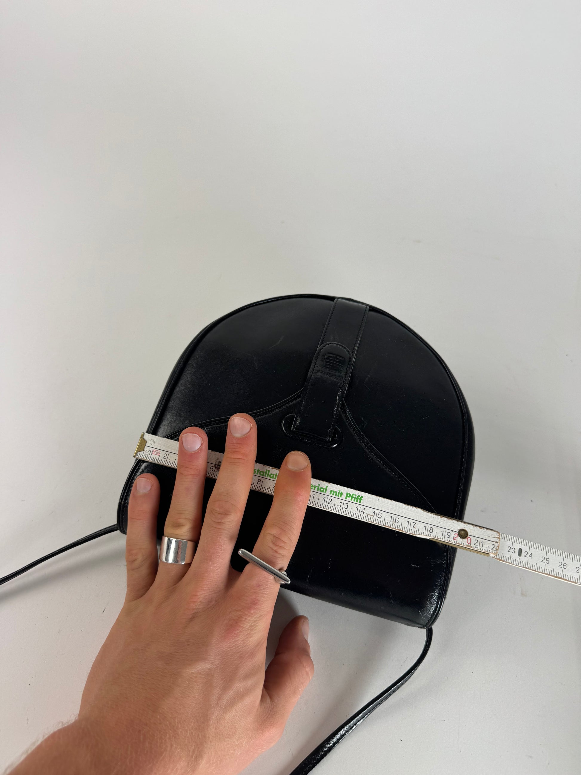 GIVENCHY Vintage 4G Bag. This sophisticated vintage 4G bag from Givenchy is crafted from sleek black leather, offering a timeless and elegant design. The structured silhouette features a magnetic closure for secure yet easy access. The interior is lined with black canvas and provides a practical and refined finish. The bag is unisex and made in Japan, showcasing Givenchy’s signature craftsmanship. Gold-toned hardware adds a luxurious touch.
