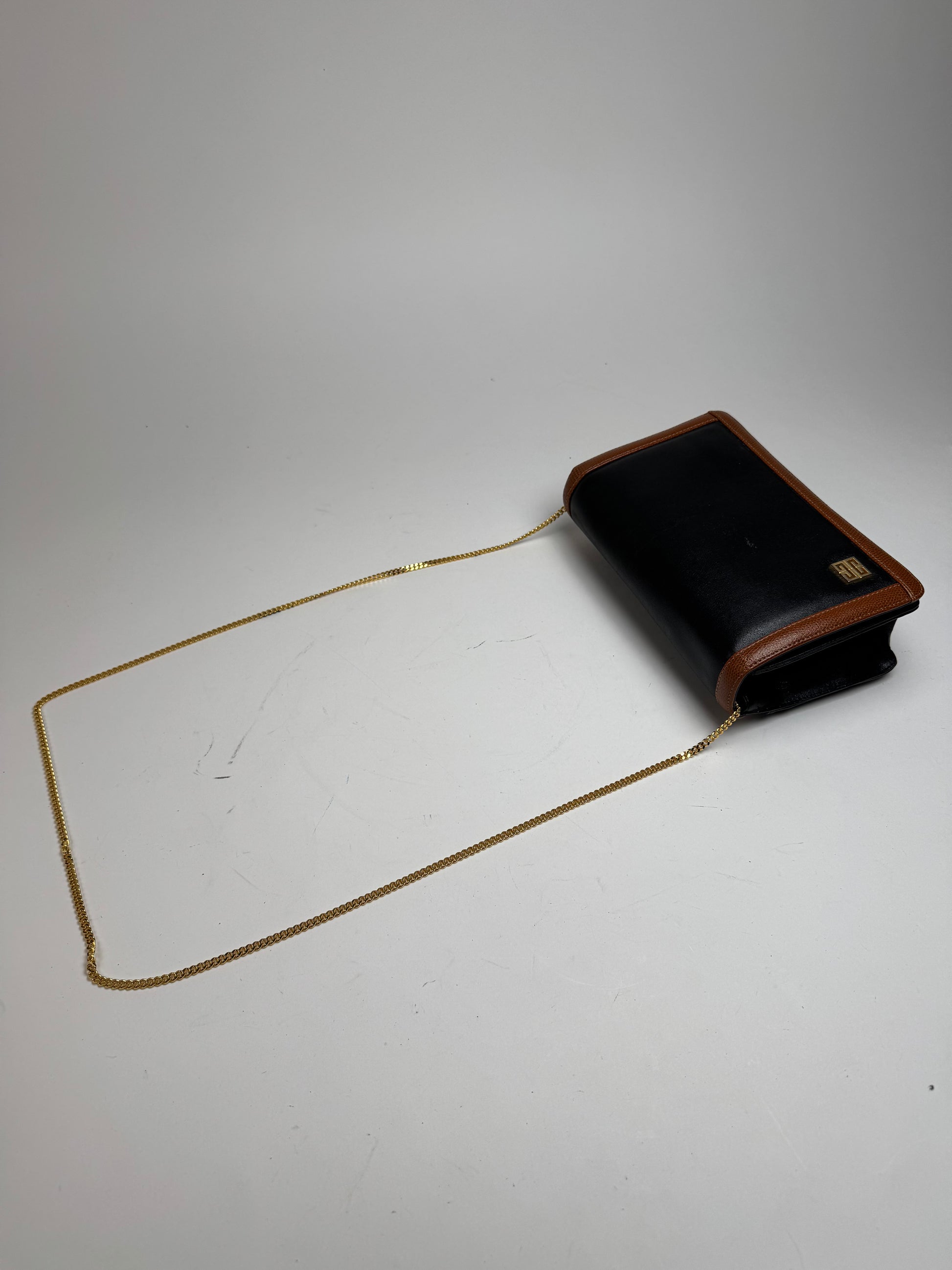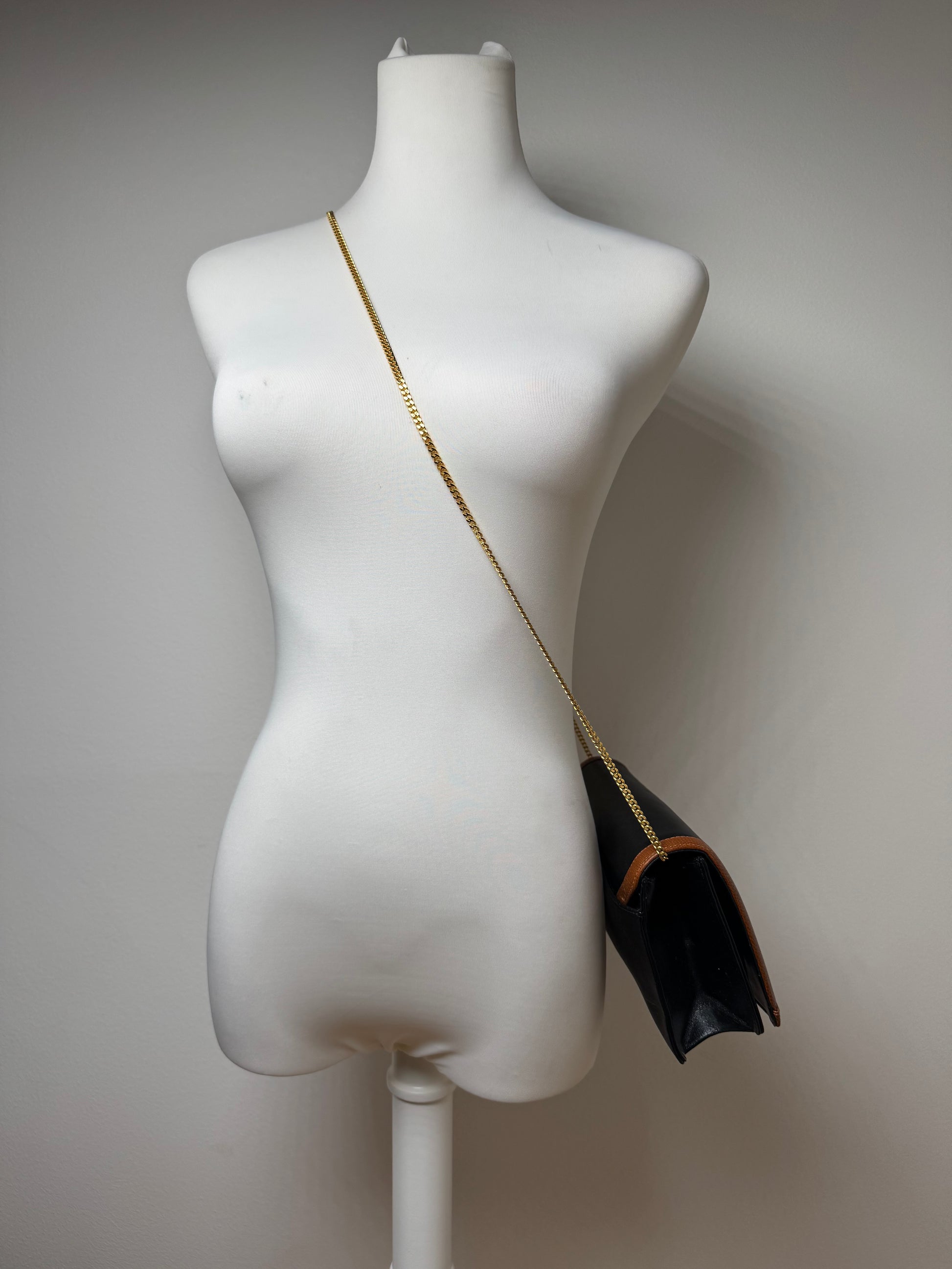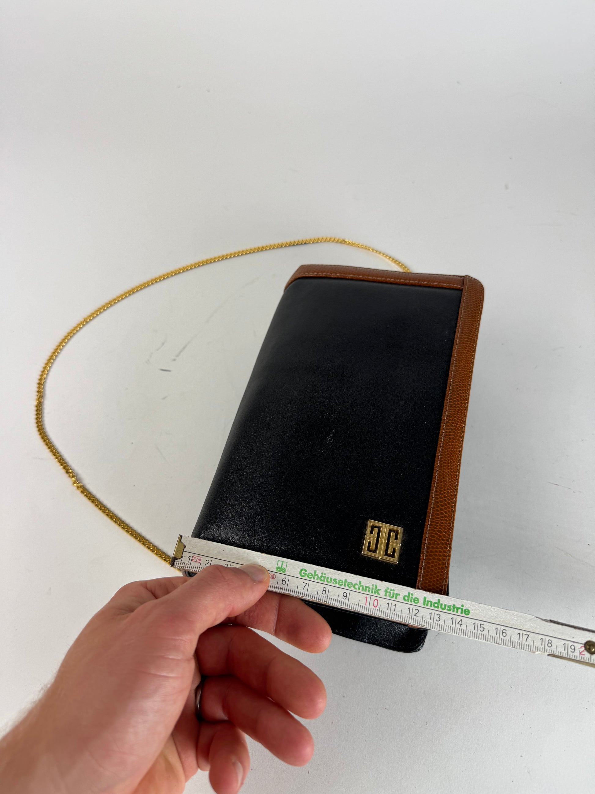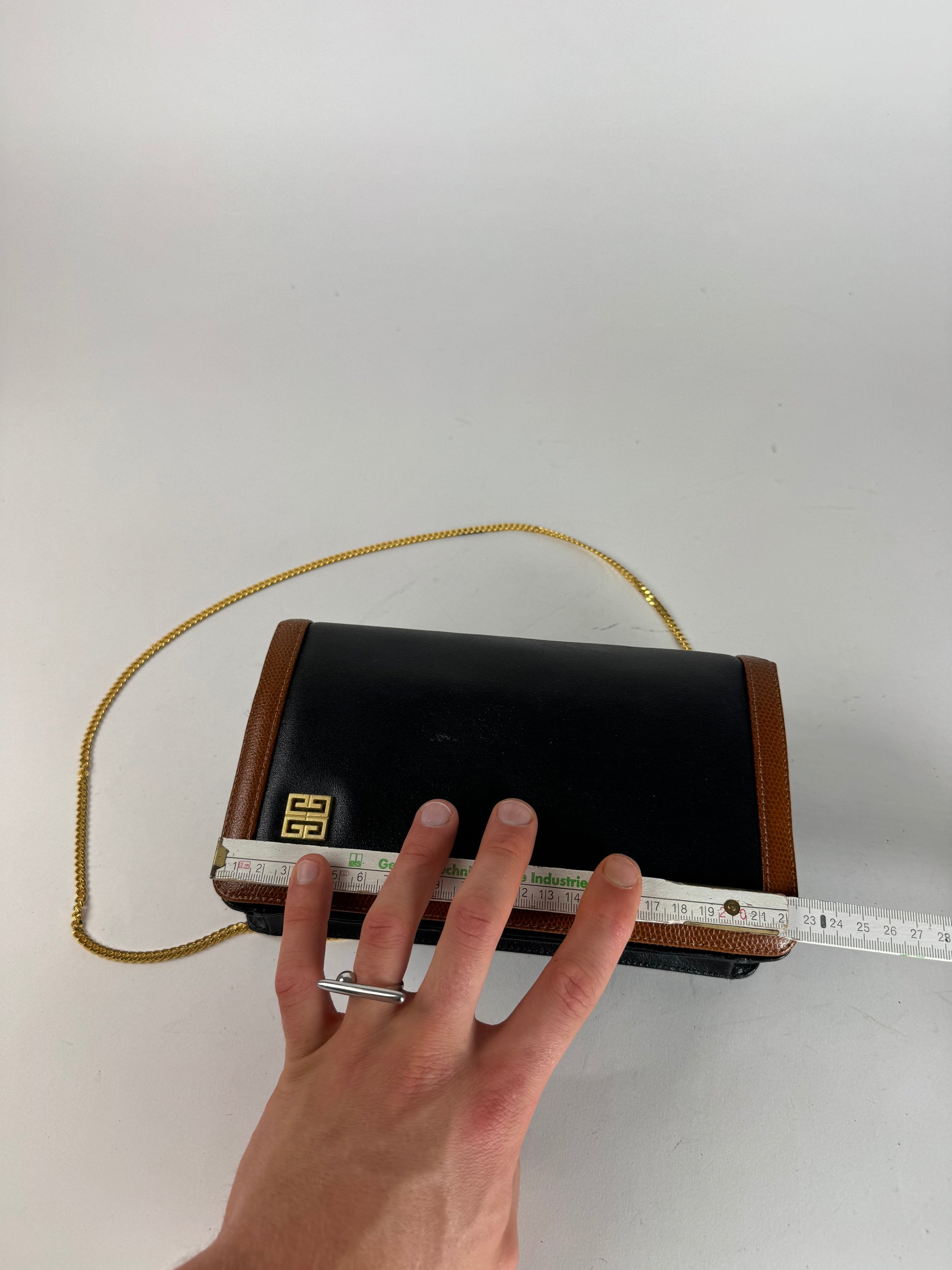 This vintage handbag is finely crafted from black leather and brown snake-embossed leather, featuring gold-tone stainless steel hardware. The strap consists of a gold-tone chain, adding a sophisticated touch. The interior is lined with black leather. Despite stains, peeling, and some material damage, the overall condition remains good. A timeless unisex piece from Givenchy’s 4G collection.