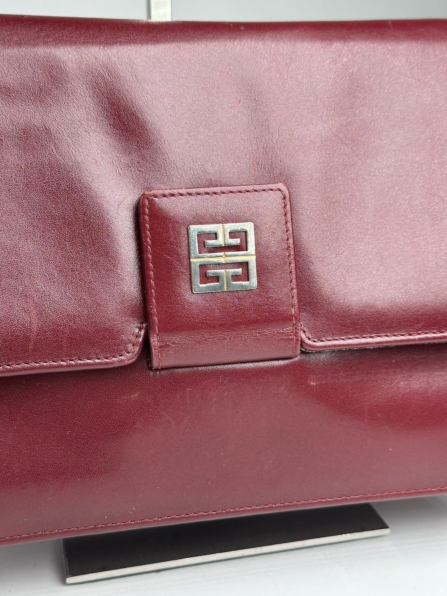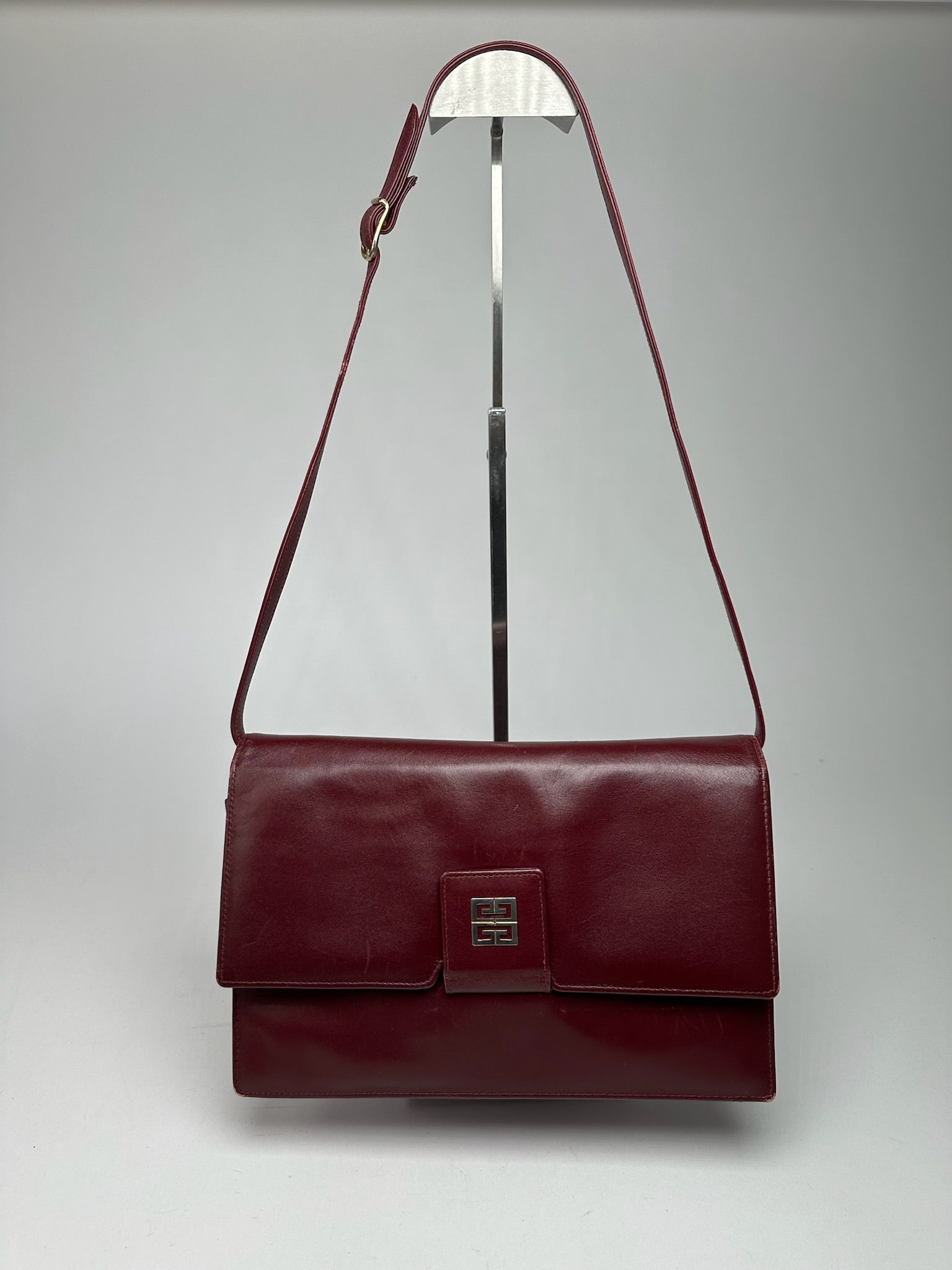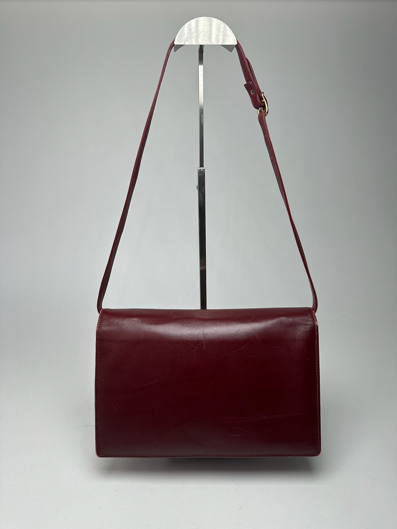 This chic handbag is crafted from deep burgundy leather and features gold-toned steel hardware. The design includes a length-adjustable shoulder strap, offering versatile styling options. Made in Spain.