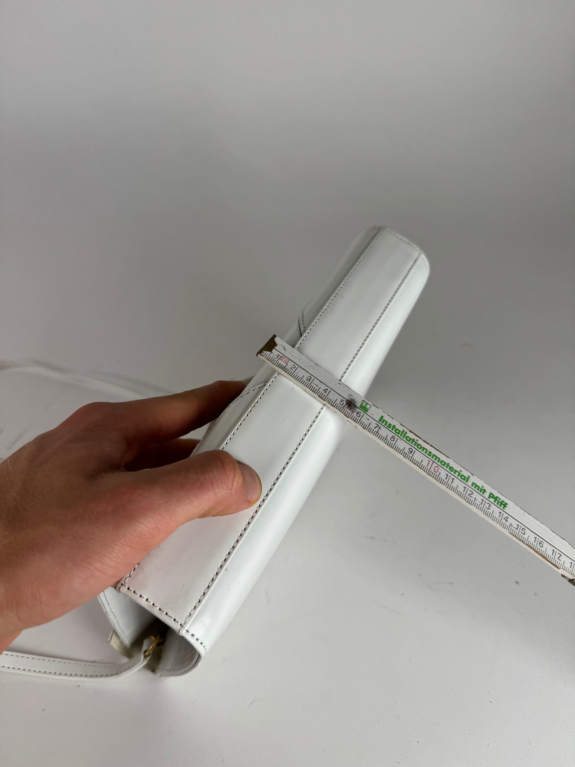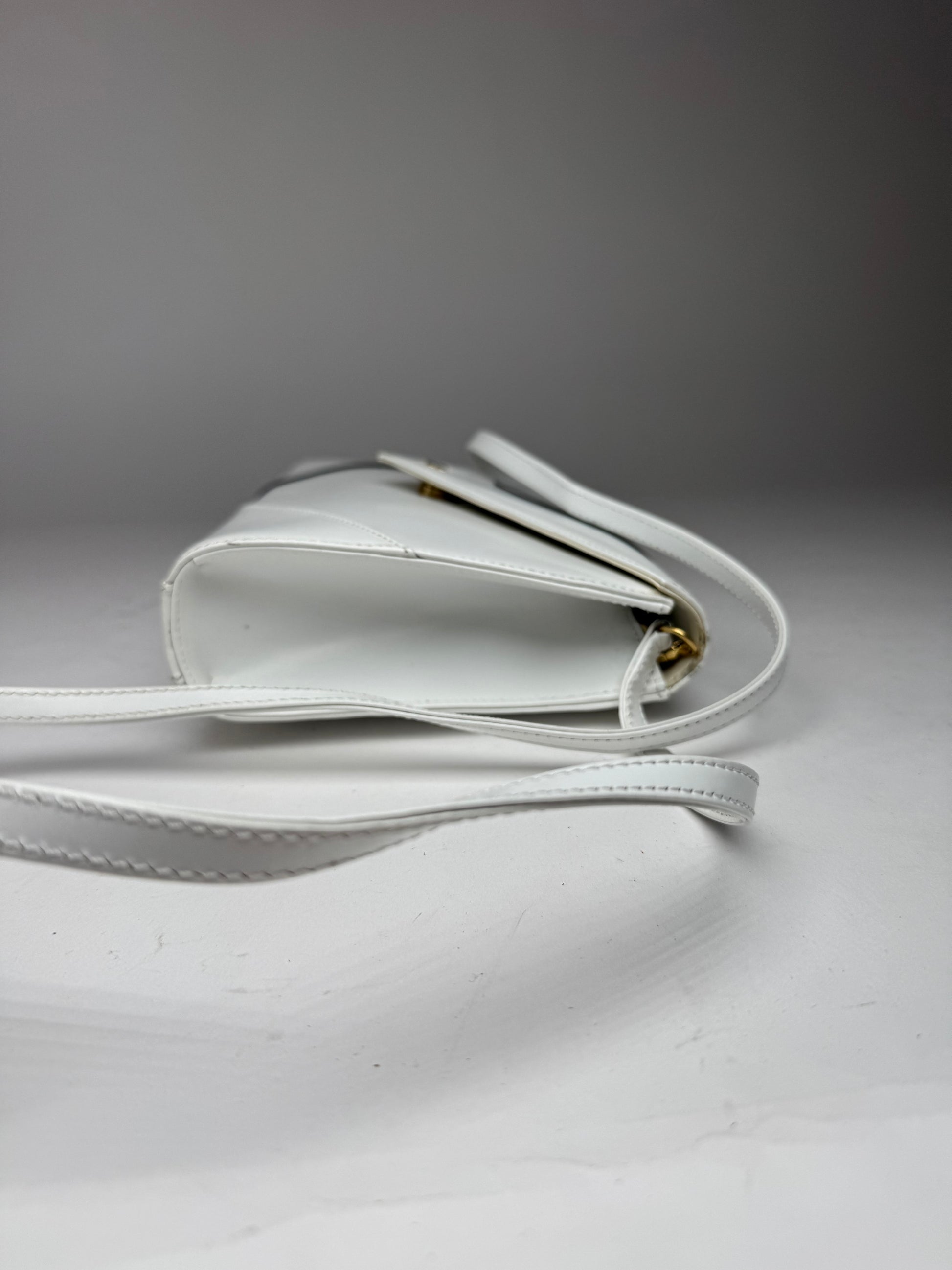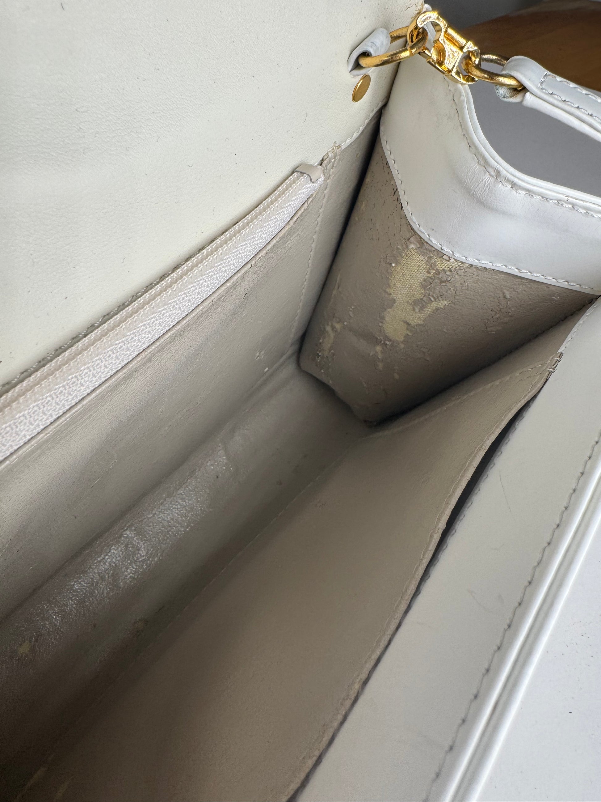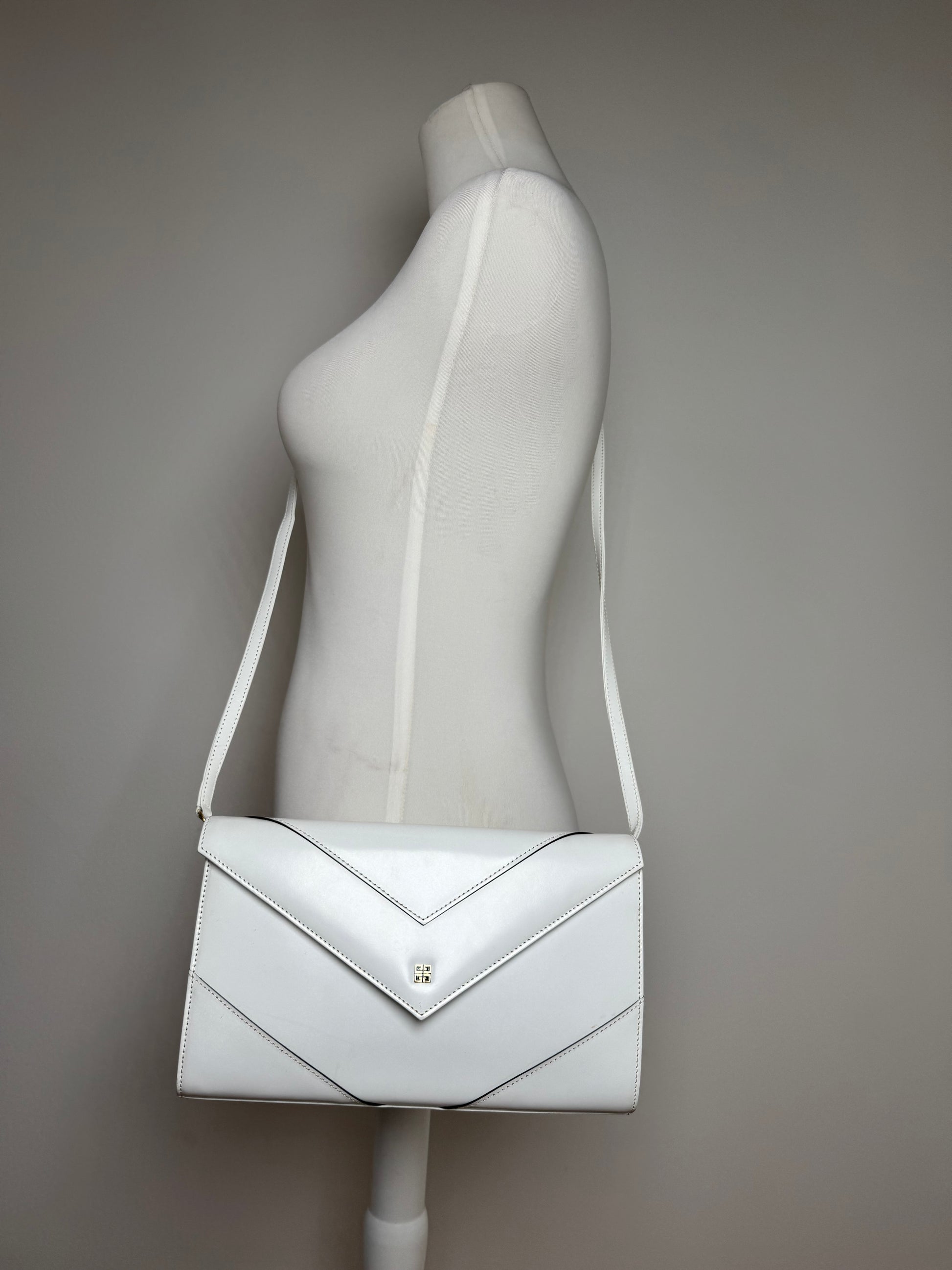 This vintage shoulder bag is finely crafted from white leather, featuring gold-tone hardware for a sophisticated touch. It comes with a shoulder strap for comfortable wear. Despite scratches and some material damage on the interior, the overall condition remains very good. A timeless unisex piece from Givenchy’s 4G collection.