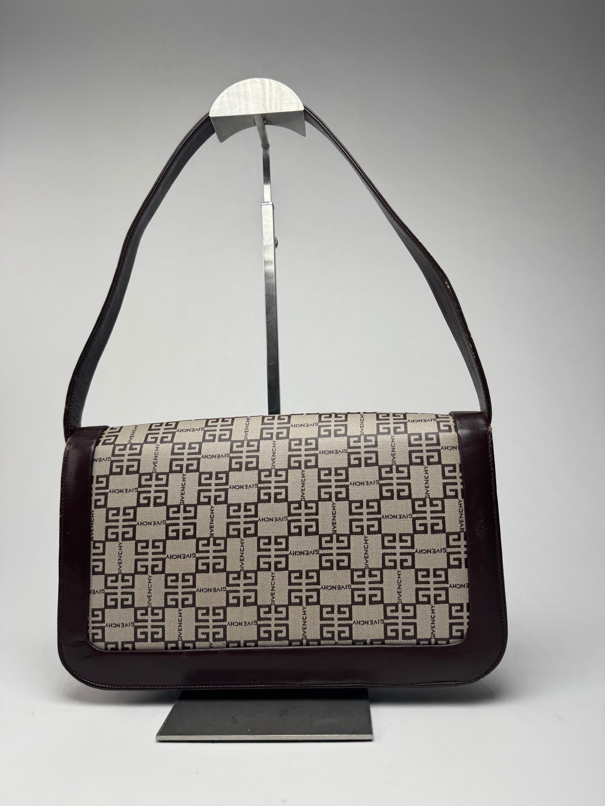 GIVENCHY Vintage 4G Bag. This vintage handbag is crafted from brown and gray leather featuring the iconic Givenchy monogram. The gold-tone steel hardware adds a refined touch. The interior is lined with brown leather, ensuring a luxurious finish. Despite minor scratches, the bag remains in very good condition. Made in Spain.