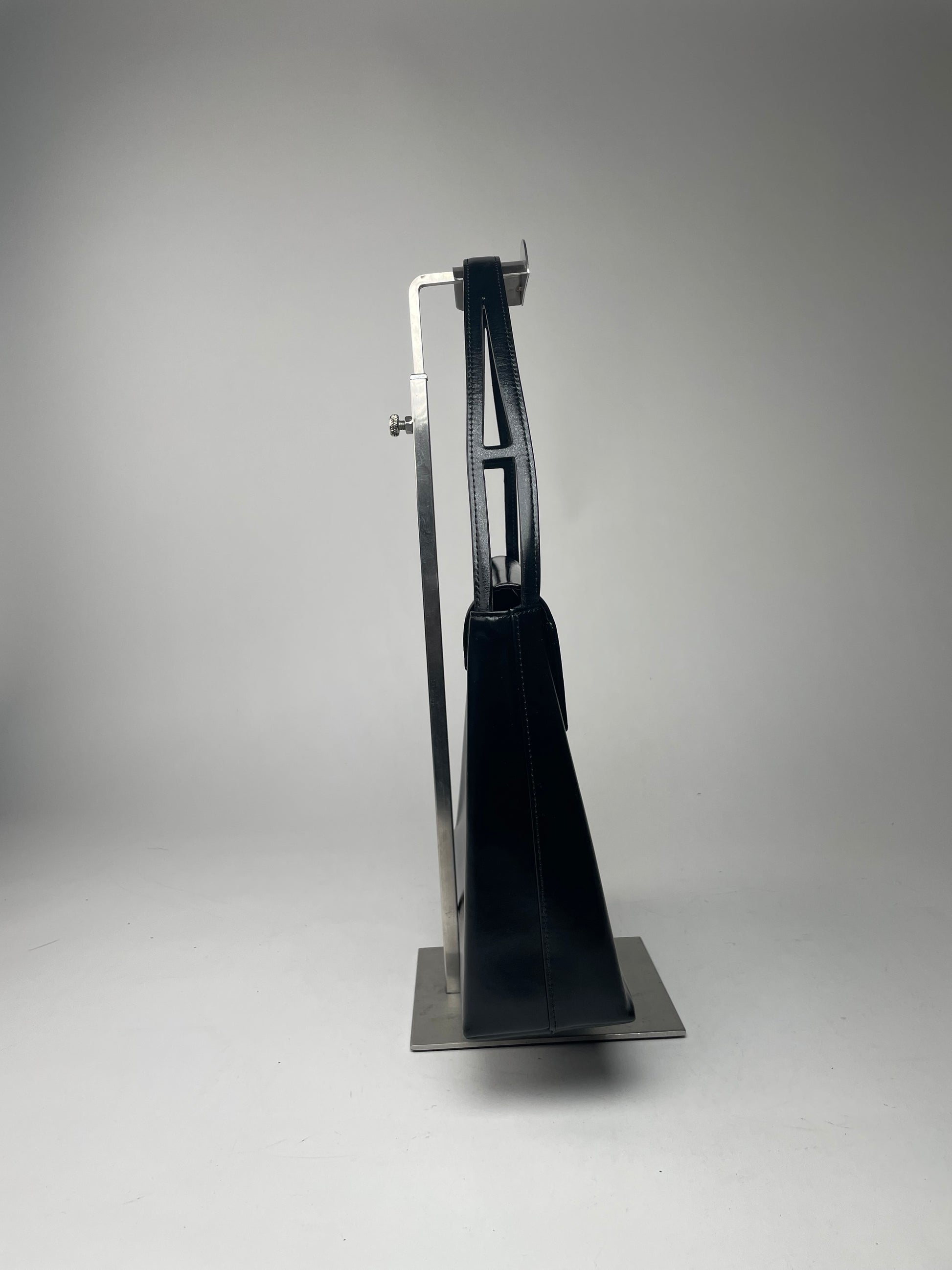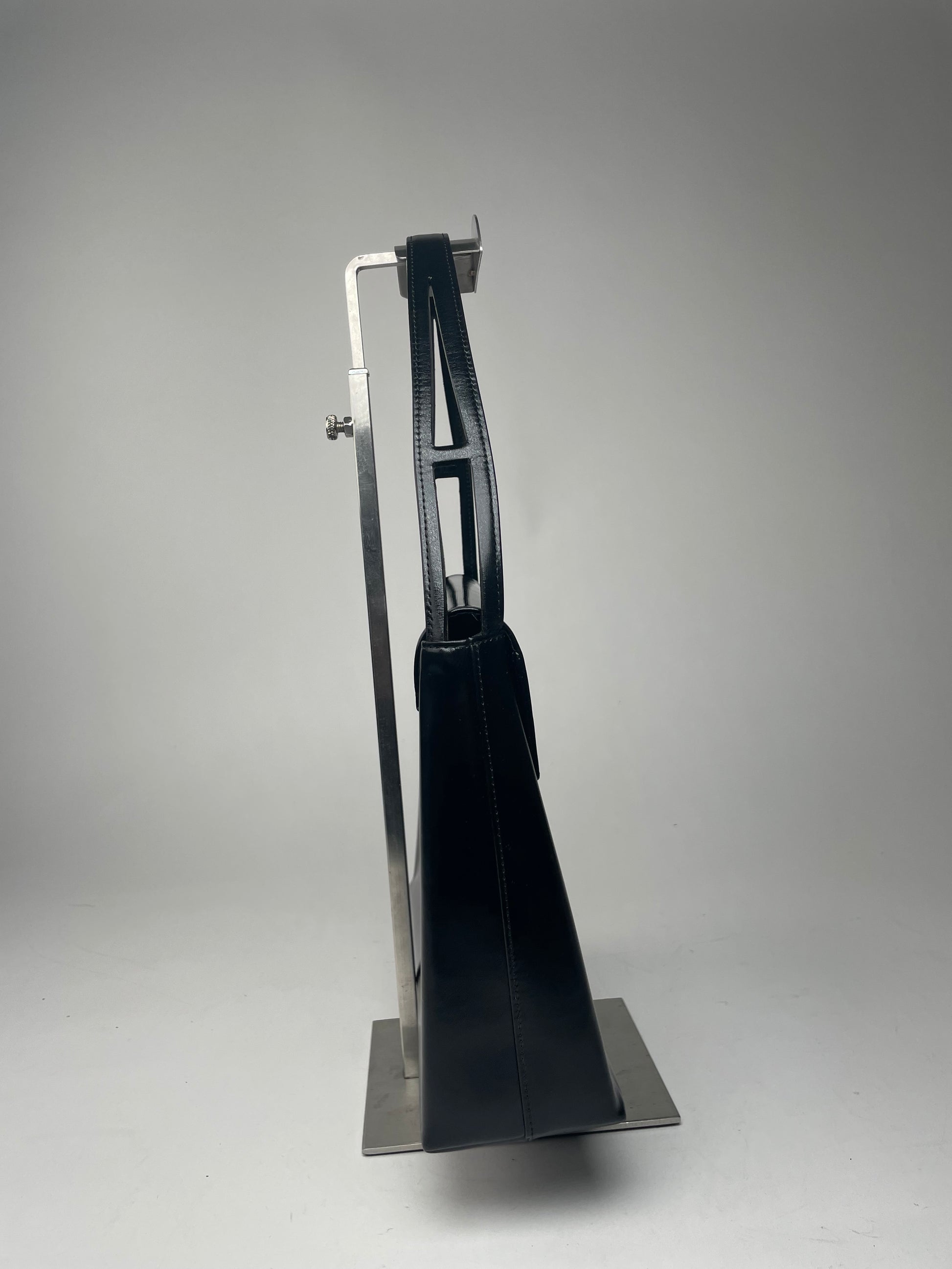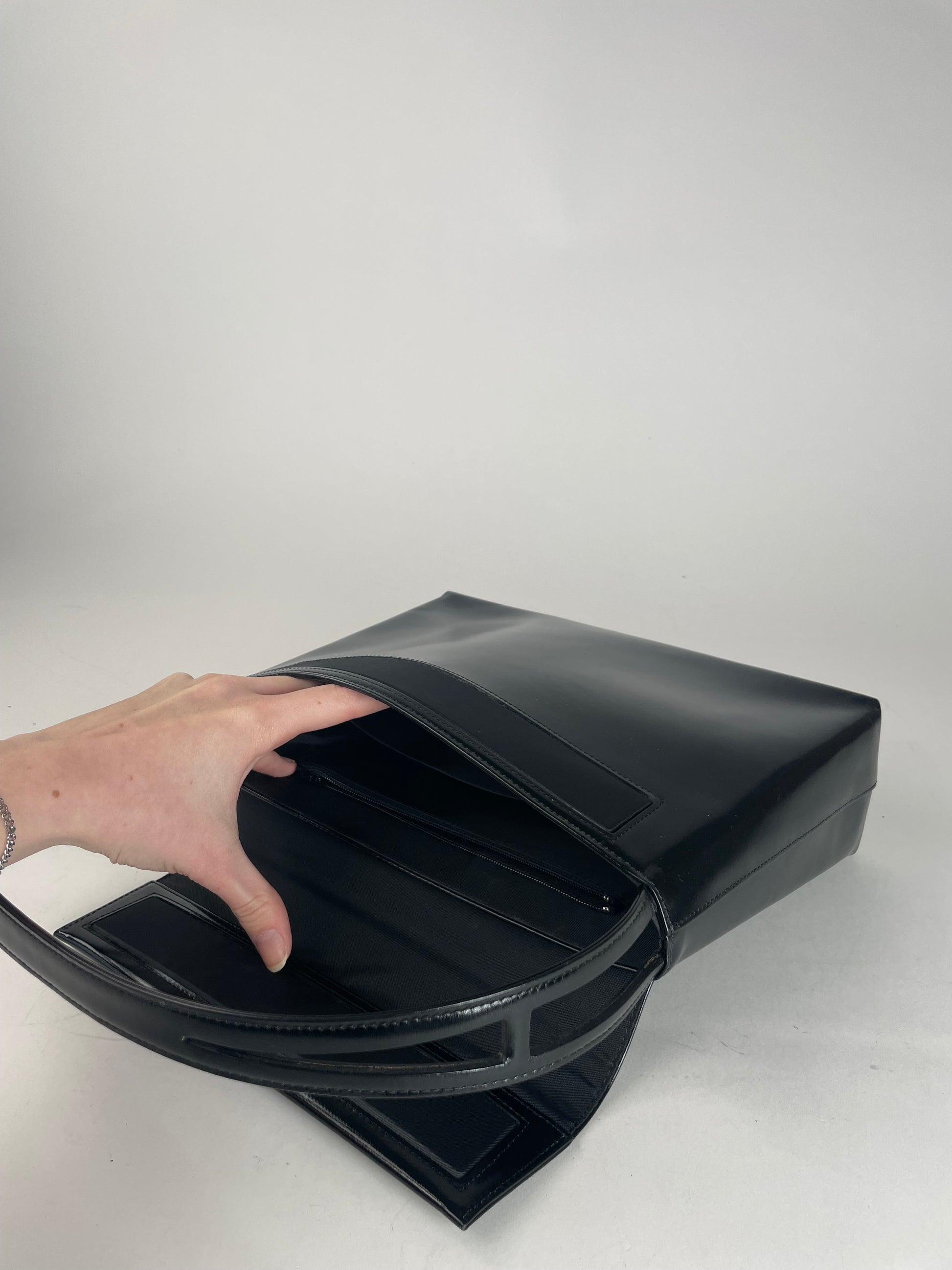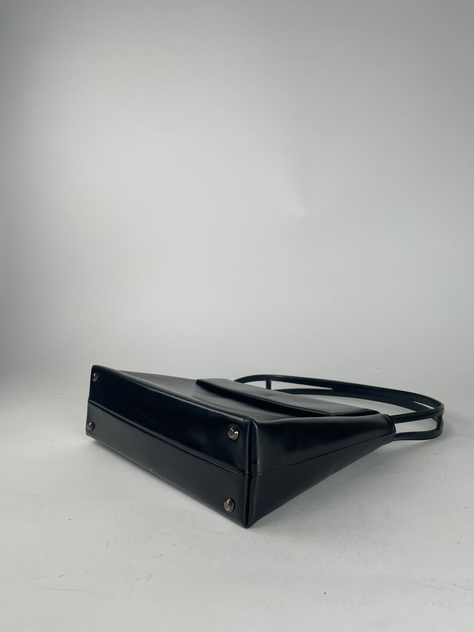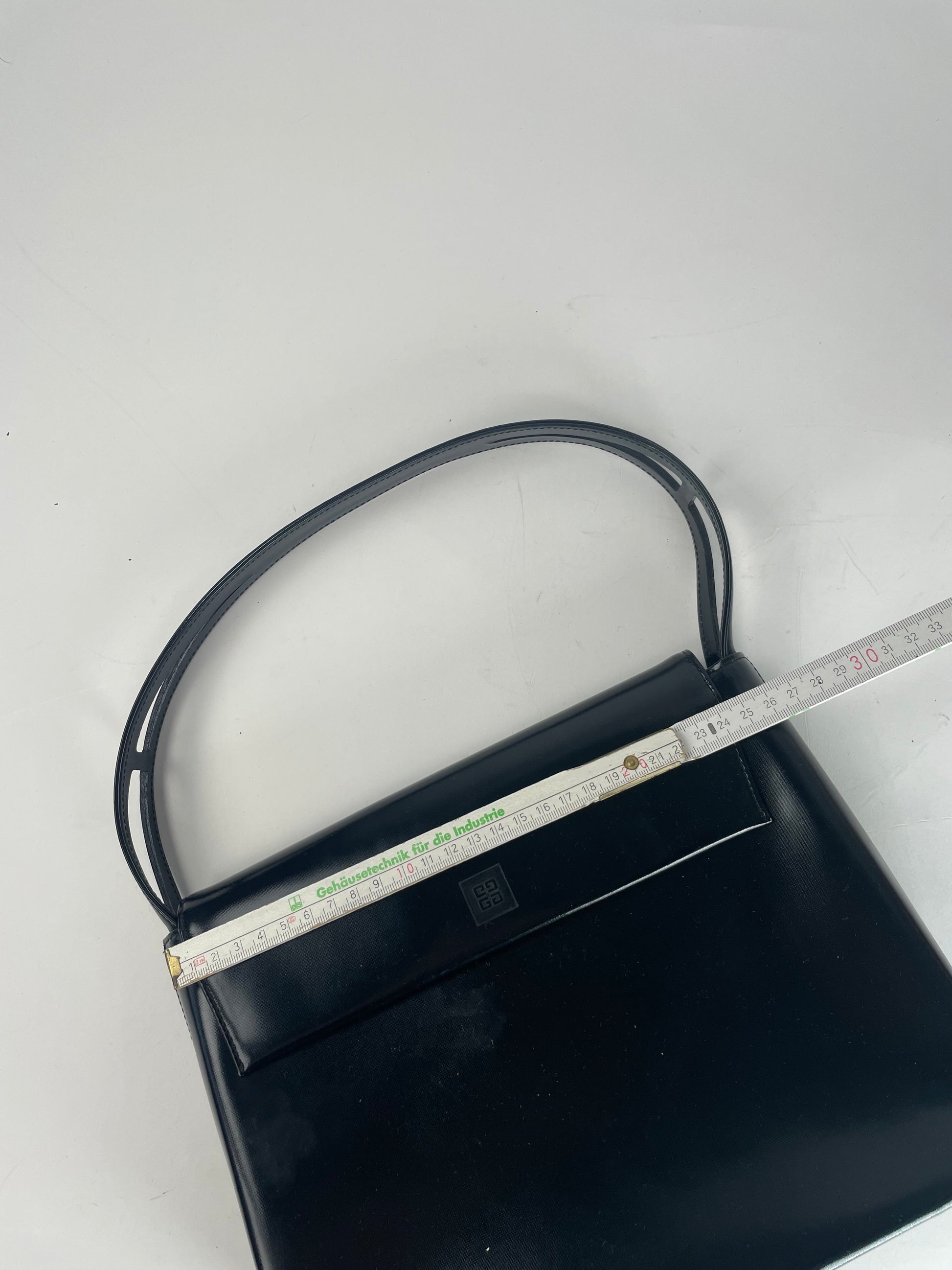 GIVENCHY Vintage 4G Handbag. This vintage Givenchy 4G handbag is crafted from black patent leather, offering a sleek and elegant look. It features a magnetic closure for convenience and a black polyester-lined interior. The silver-tone steel hardware adds a refined touch. Despite minor scratches, the bag remains in very good condition.