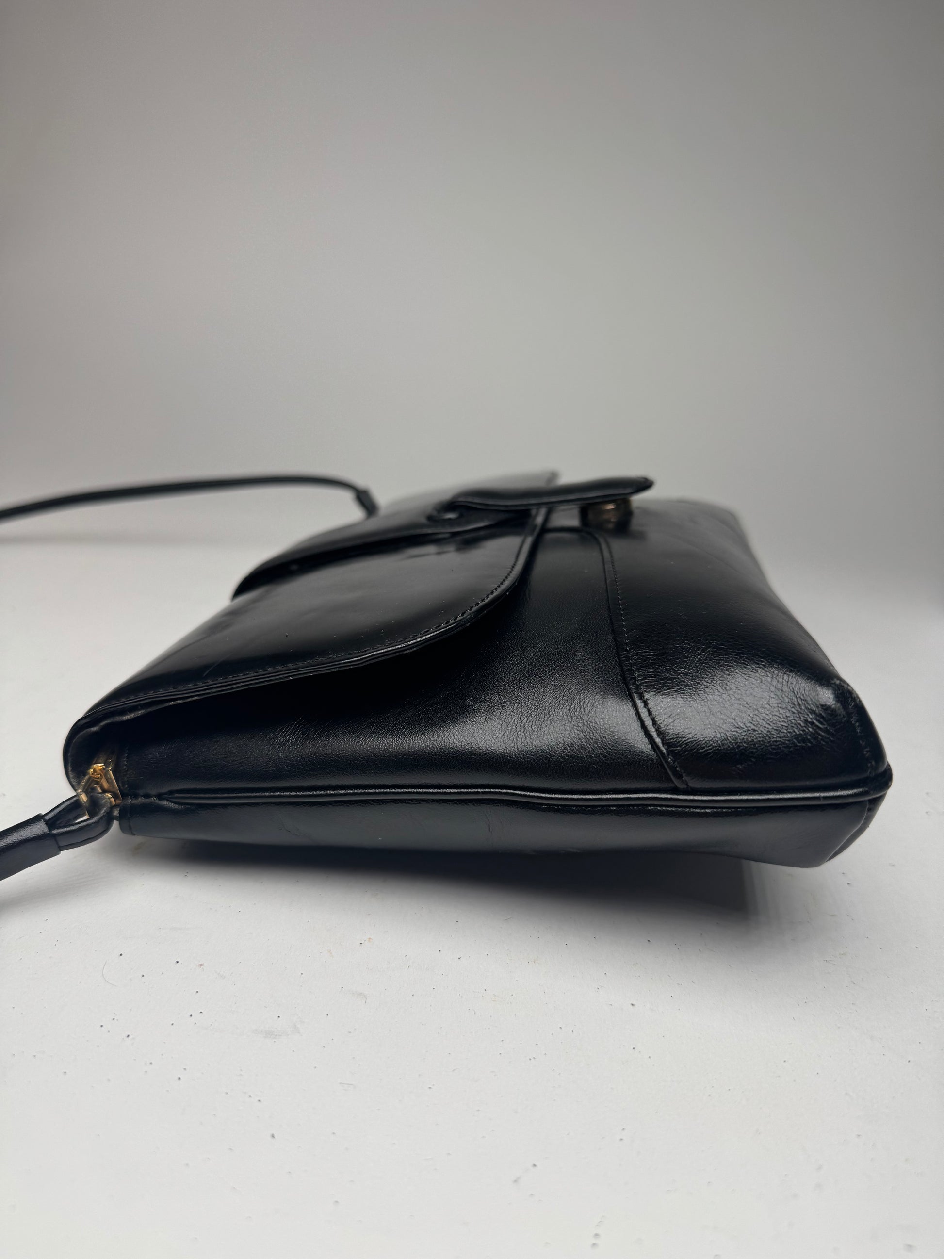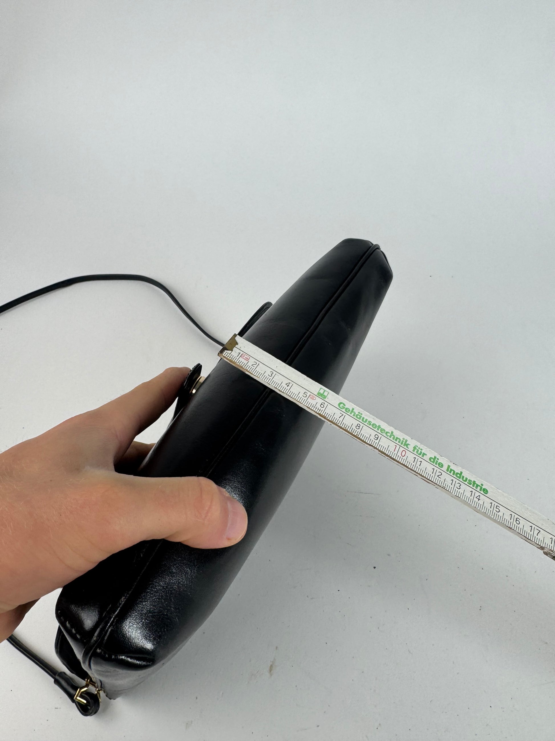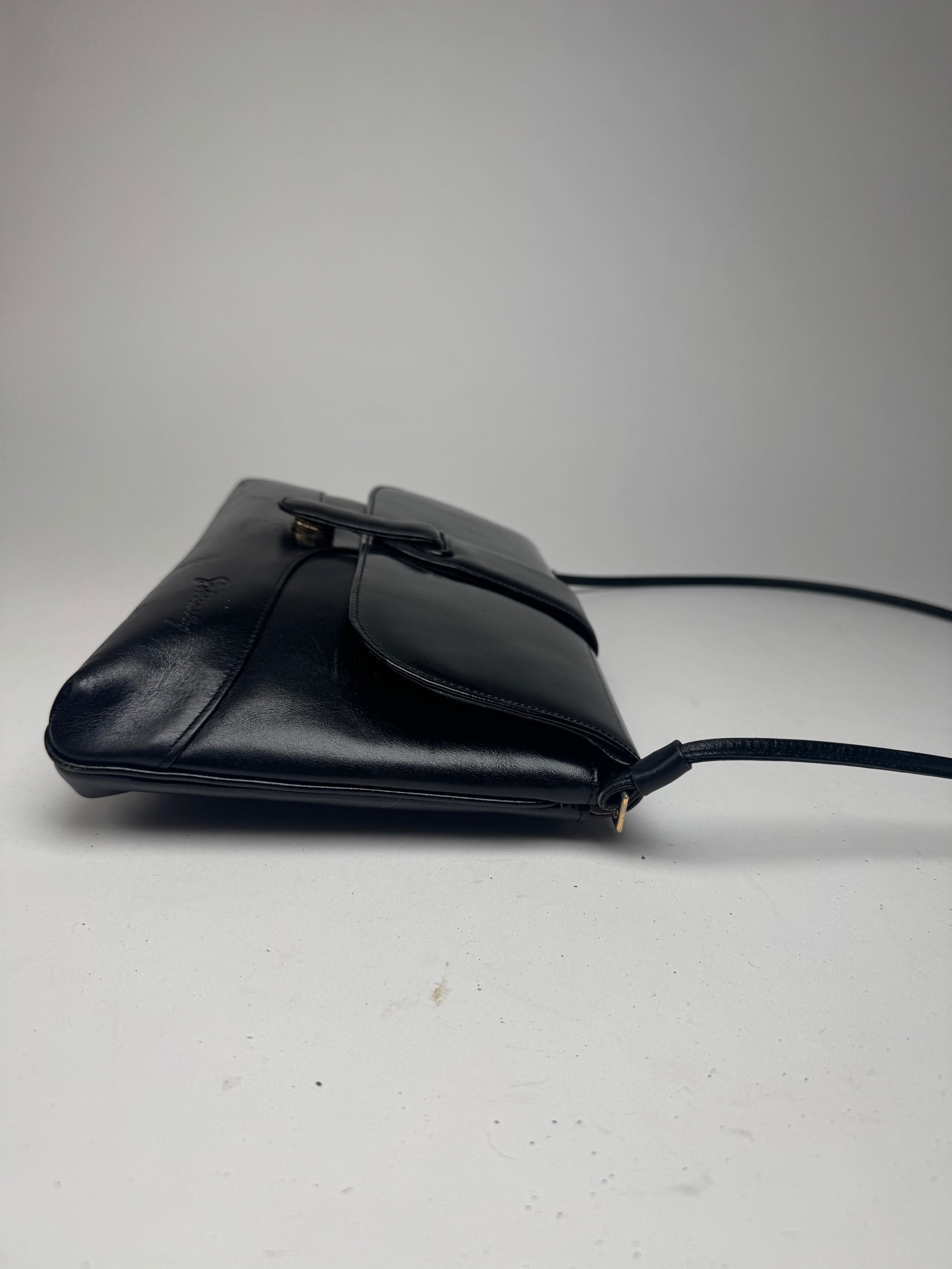 This elegant vintage handbag is finely crafted from smooth black leather. It features gold-toned steel hardware and a magnetic closure for secure access. The bag's sleek design is complemented by its practical size, making it perfect for everyday use. Proudly made in Japan.