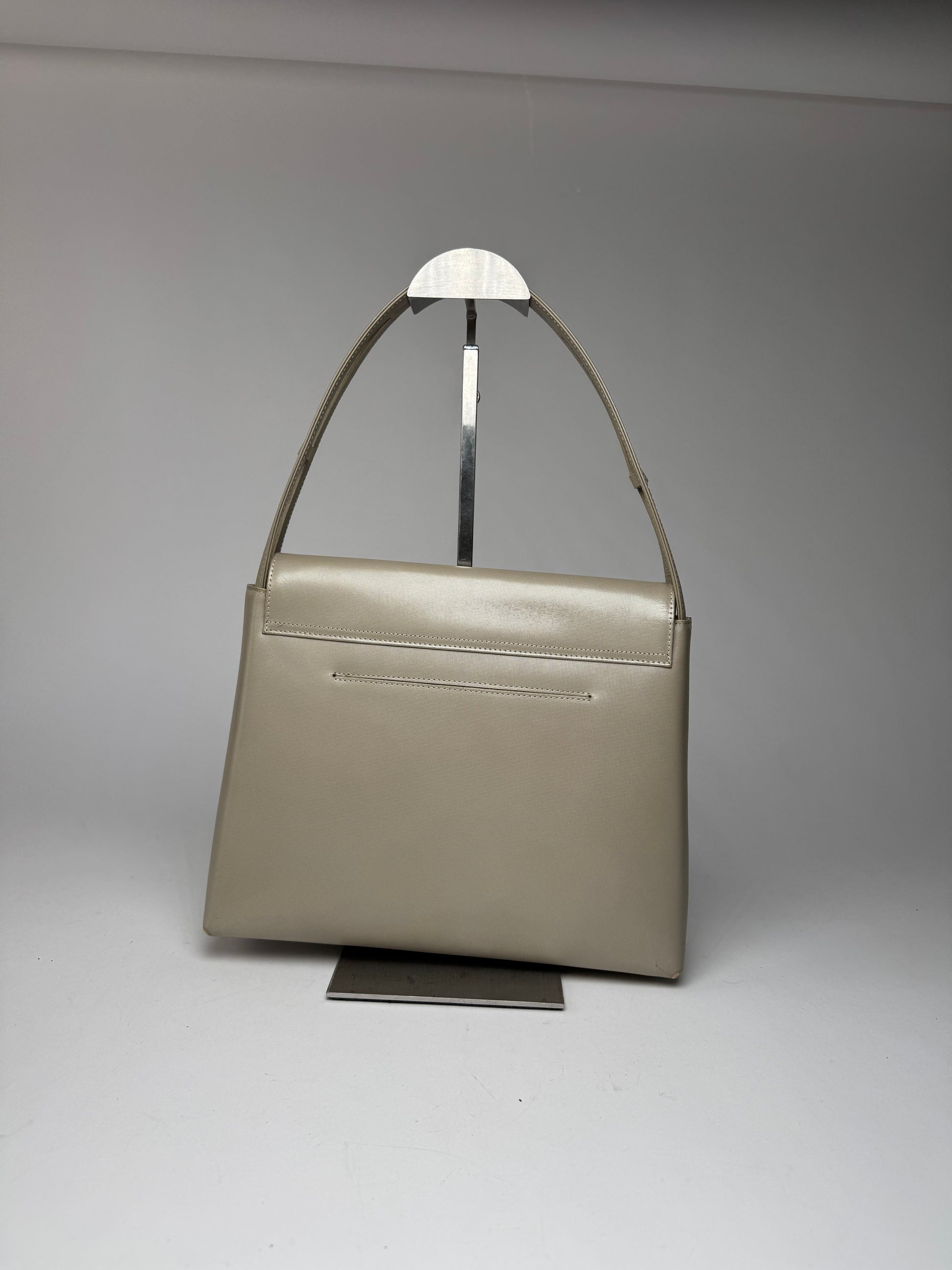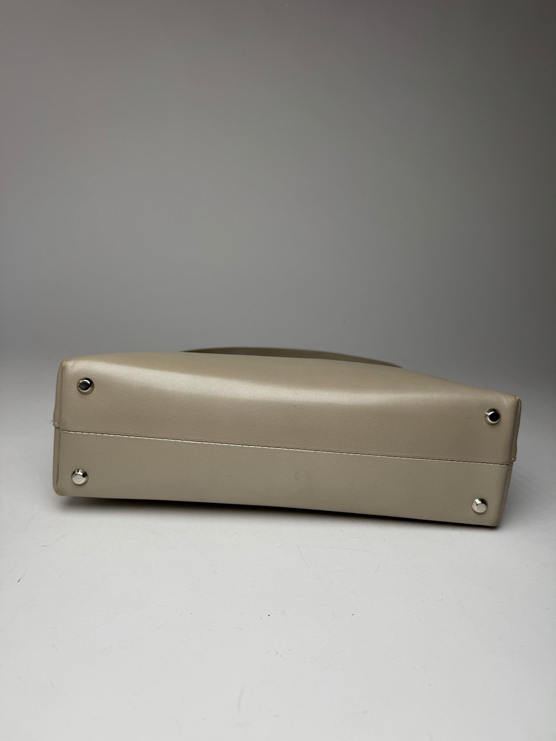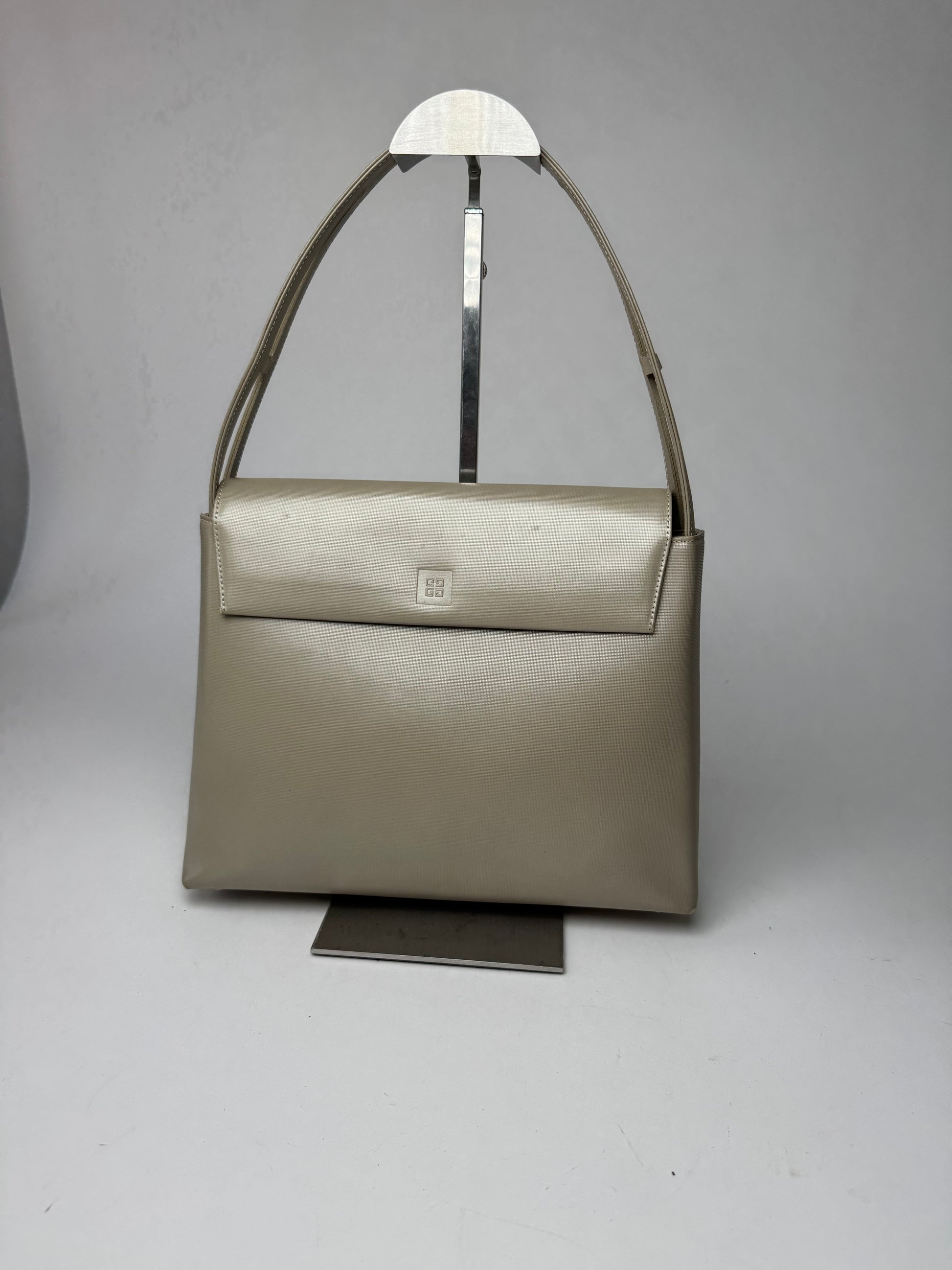 GIVENCHY 4G Vintage Handbag. This chic handbag is finely crafted of grey patent leather. The bag features a top handle, a magnetic snap closure, and silver-toned steel hardware. The interior is lined in beige canvas.