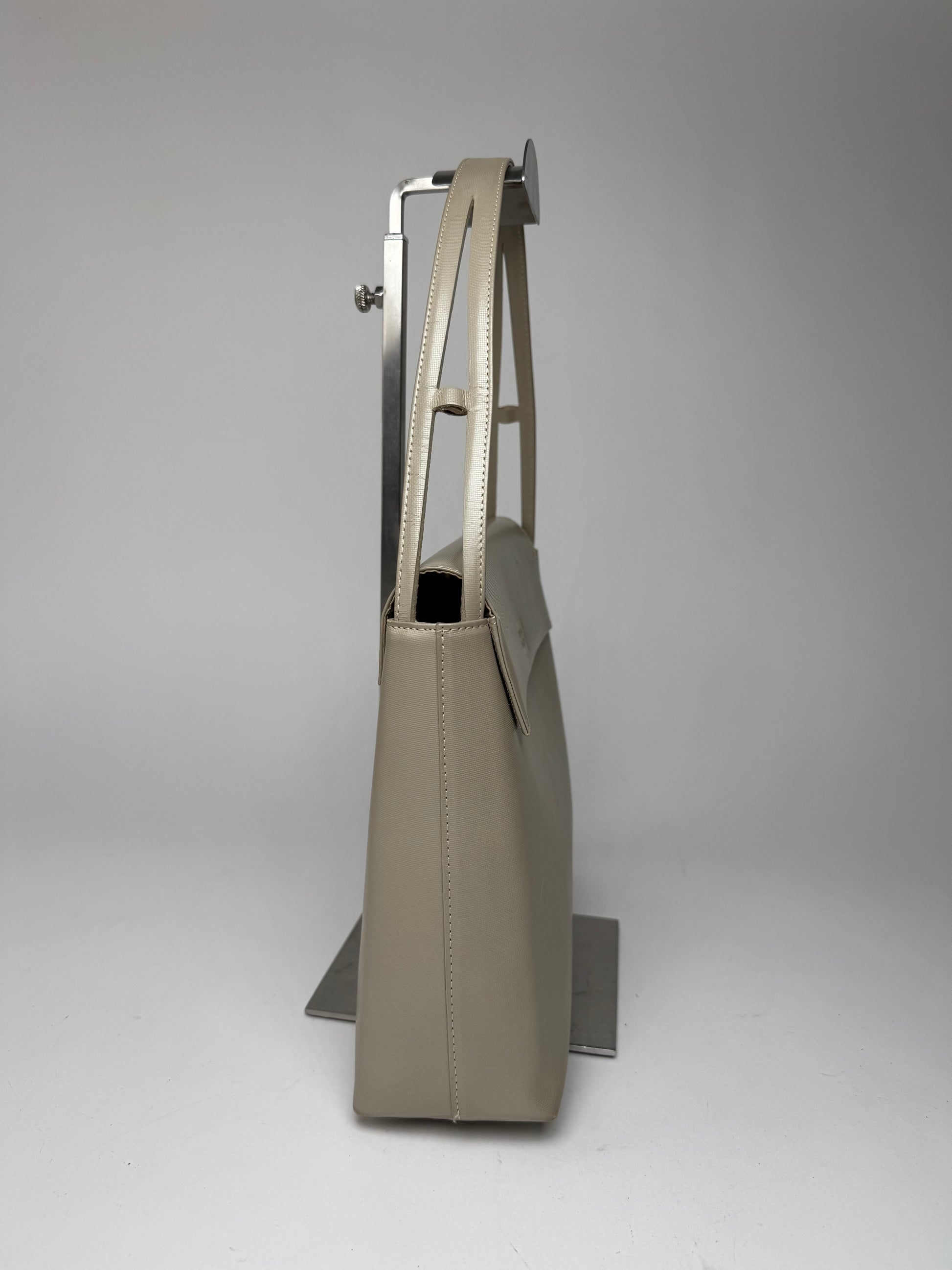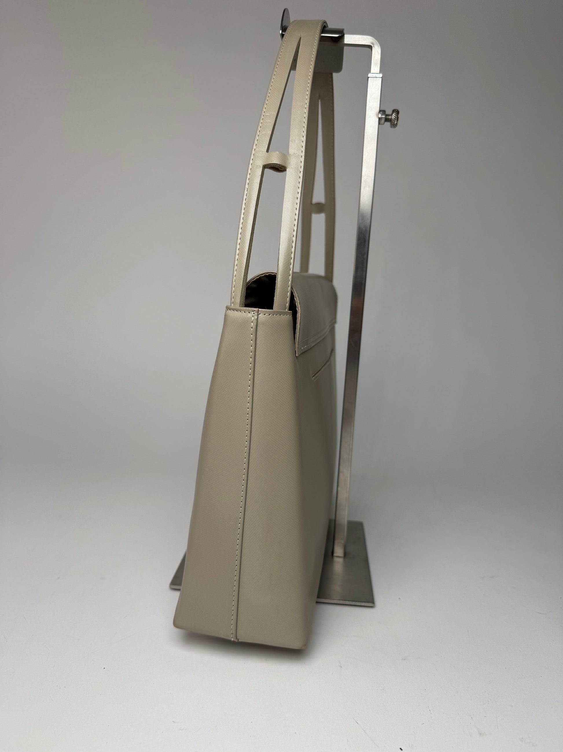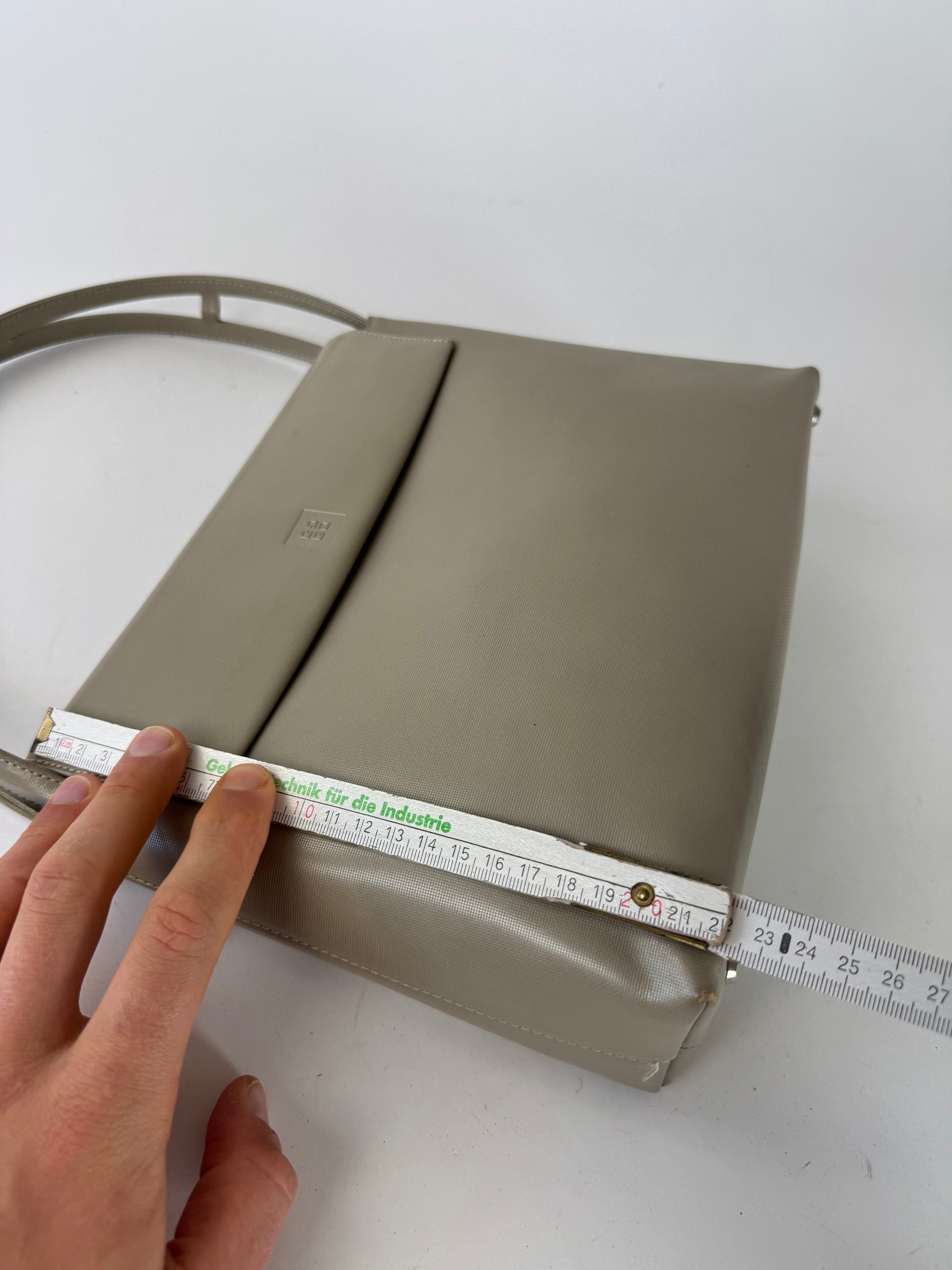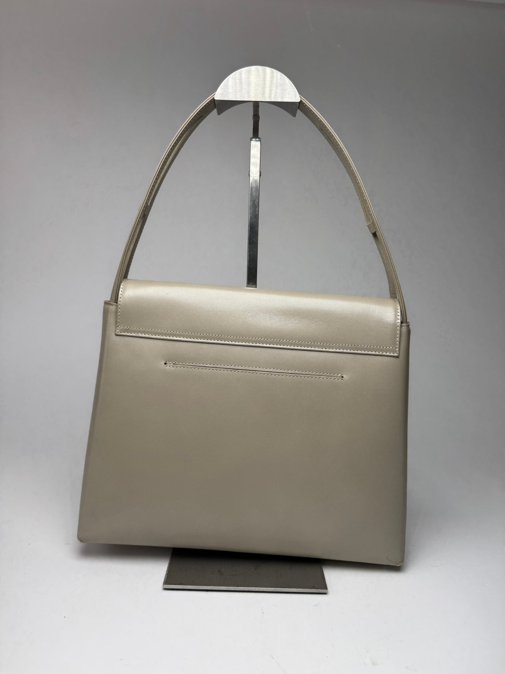 GIVENCHY 4G Vintage Handbag. This chic handbag is finely crafted of grey patent leather. The bag features a top handle, a magnetic snap closure, and silver-toned steel hardware. The interior is lined in beige canvas.
