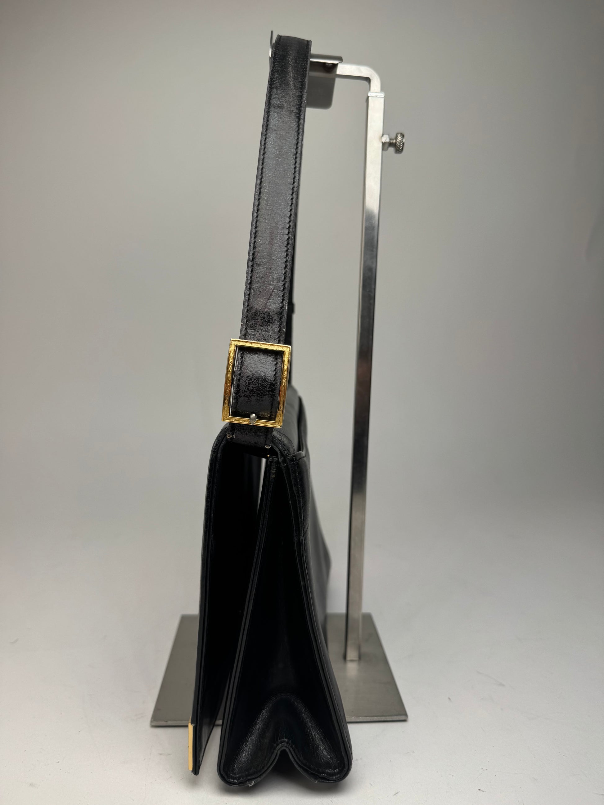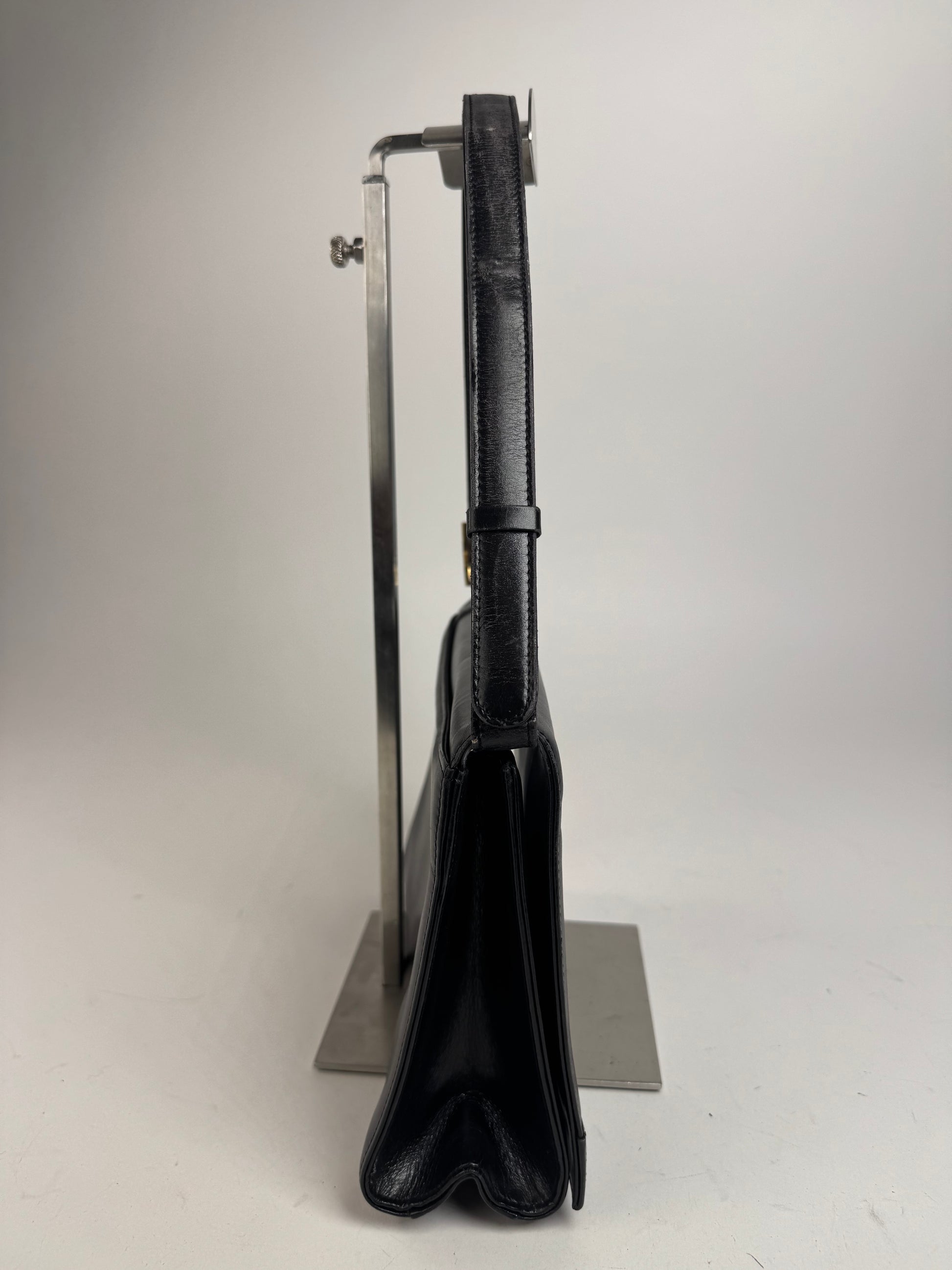 This elegant vintage handbag is crafted from smooth black leather and features a refined silhouette with a gold-tone steel Givenchy logo positioned at the lower right corner on the front. Founded in 1952 by Hubert de Givenchy, the house is renowned for its timeless Parisian elegance and clean, architectural lines, which are beautifully reflected in this classic design. The bag can be worn as a top-handle bag or as a shoulder bag and closes with a magnetic fastening. The interior is lined with soft black velour leather. Made in Japan, this piece combines luxury craftsmanship with understated sophistication.