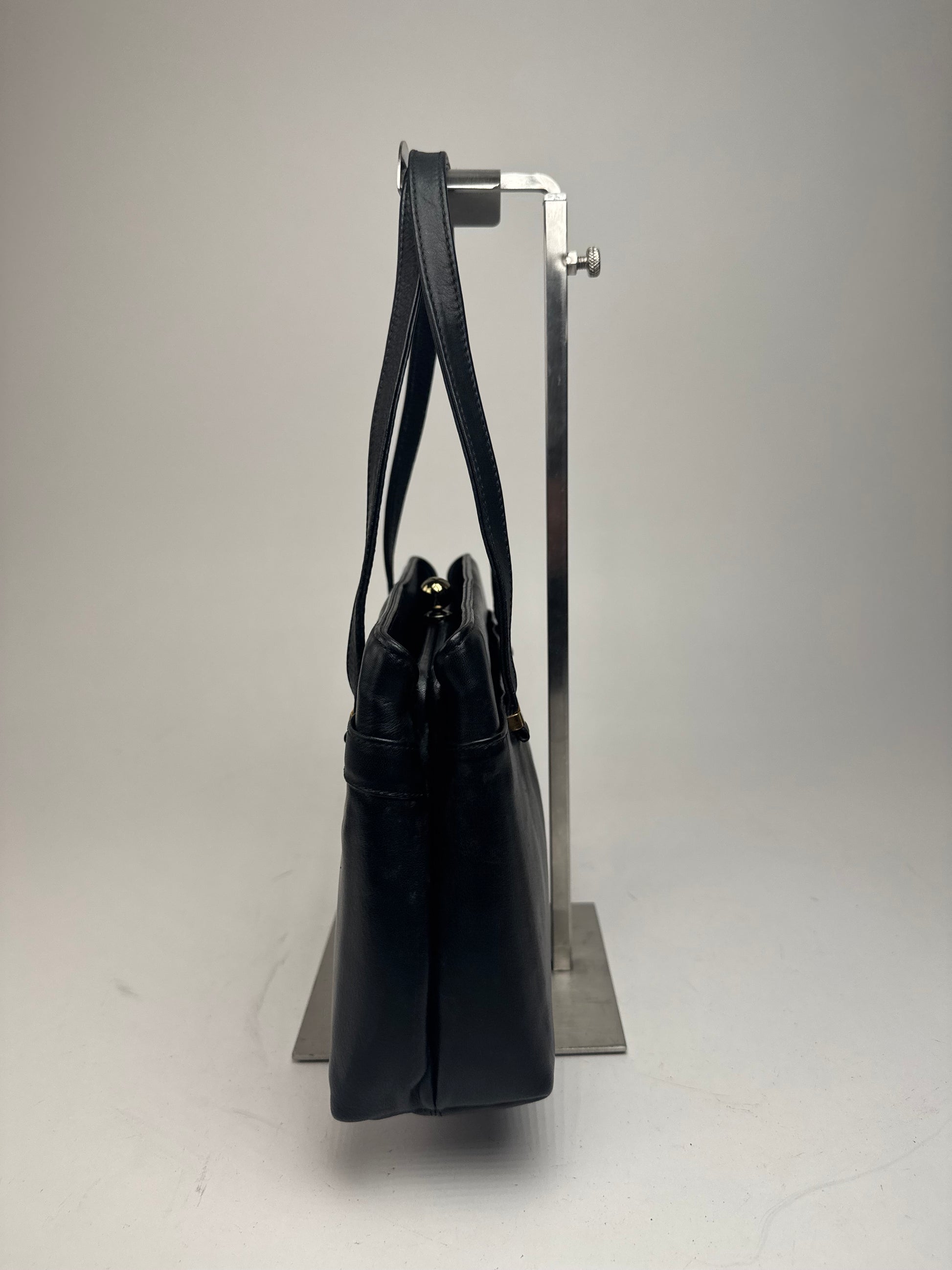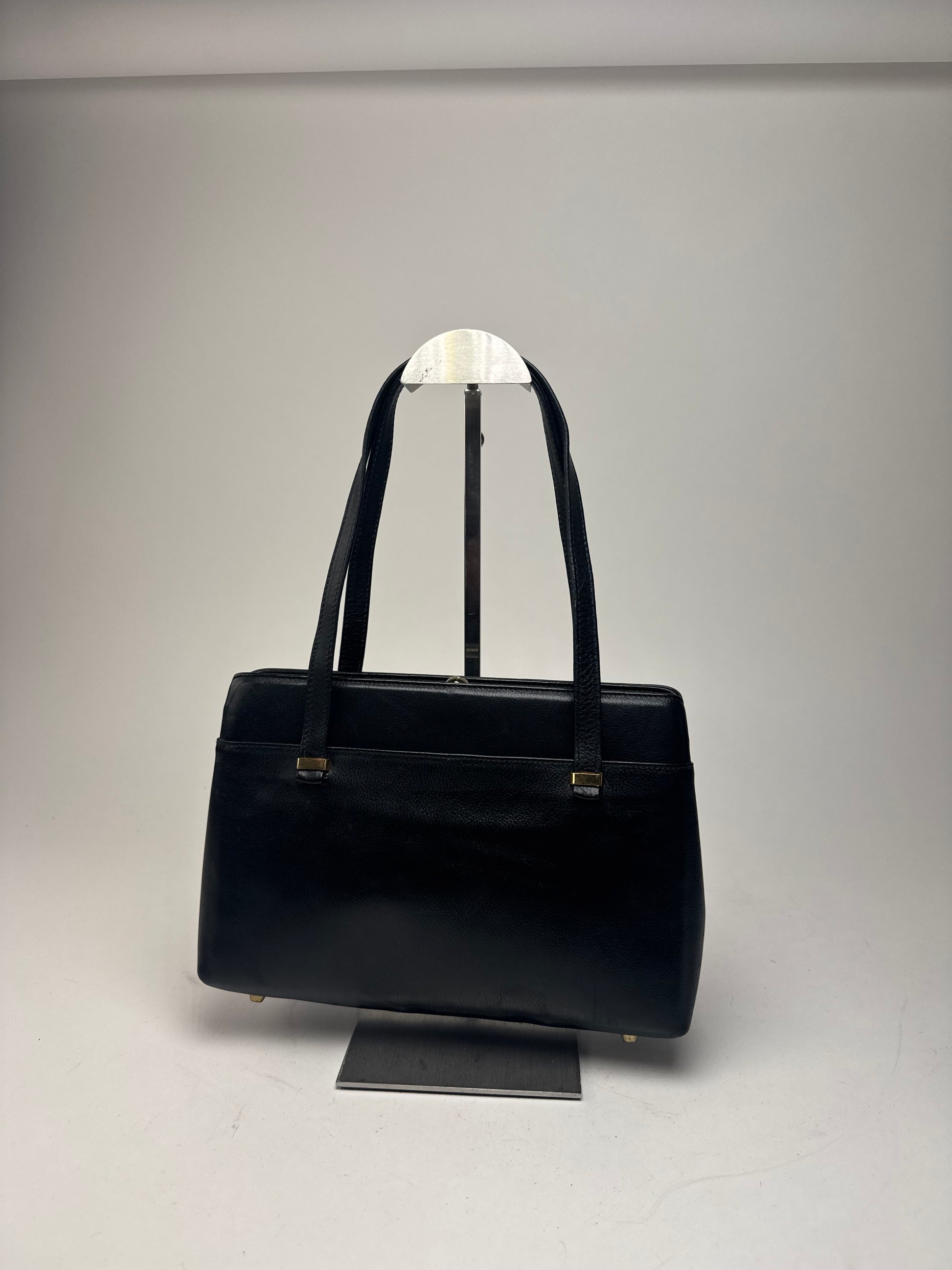 This elegant vintage handbag is finely crafted of black textured leather and features the signature GIVENCHY logo in polished gold-tone steel on the front — a symbol of the brand’s Parisian sophistication and timeless style, established under Hubert de Givenchy’s creative vision in the mid-20th century. The bag offers three compartments, one secured with a flap closure, and two medium-length handles for easy carrying. Likely from the 1990s, it embodies the understated luxury characteristic of that era.