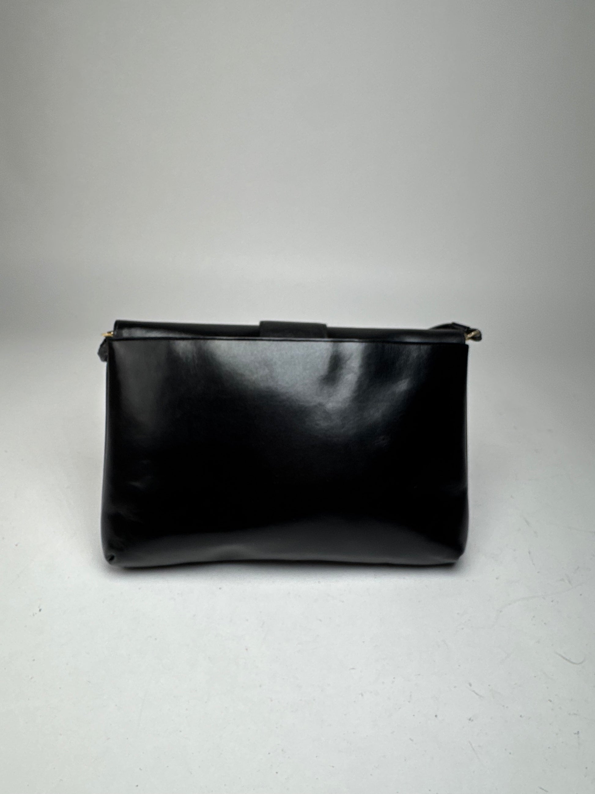 This elegant vintage shoulder bag is crafted from glossy black leather and features a magnetic closure with the Givenchy logo embossed on the lower right corner of the front. The interior is lined with black polyester featuring a coated finish. Made in Japan, the bag combines minimalist sophistication with the refined craftsmanship that defines Givenchy’s timeless Parisian style.