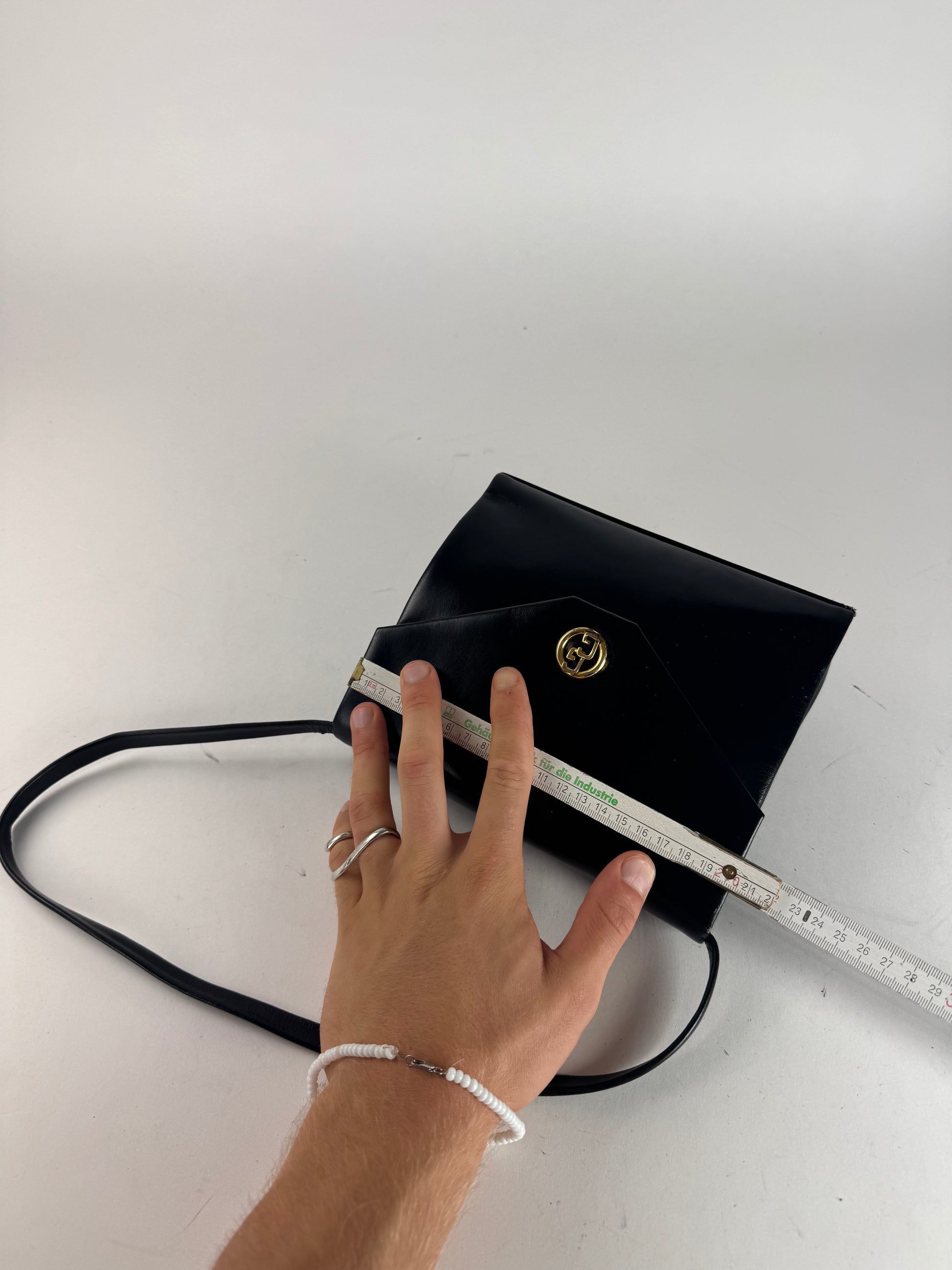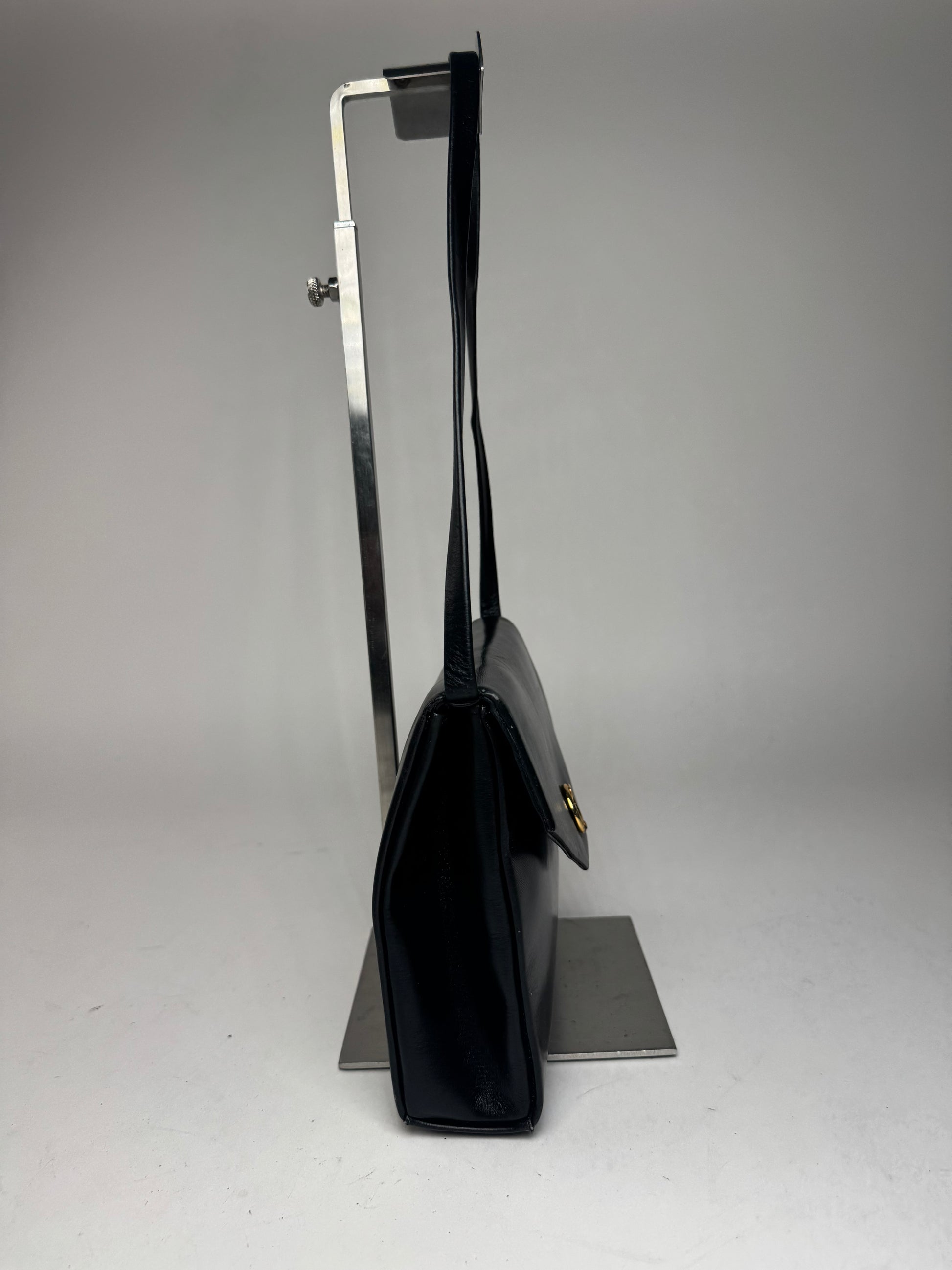 This chic handbag is finely crafted of black leather. The shoulder bag features a medium-length strap and a polished gold-tone steel GG logo on the front. The bag is made in France and opens with a snap button closure.