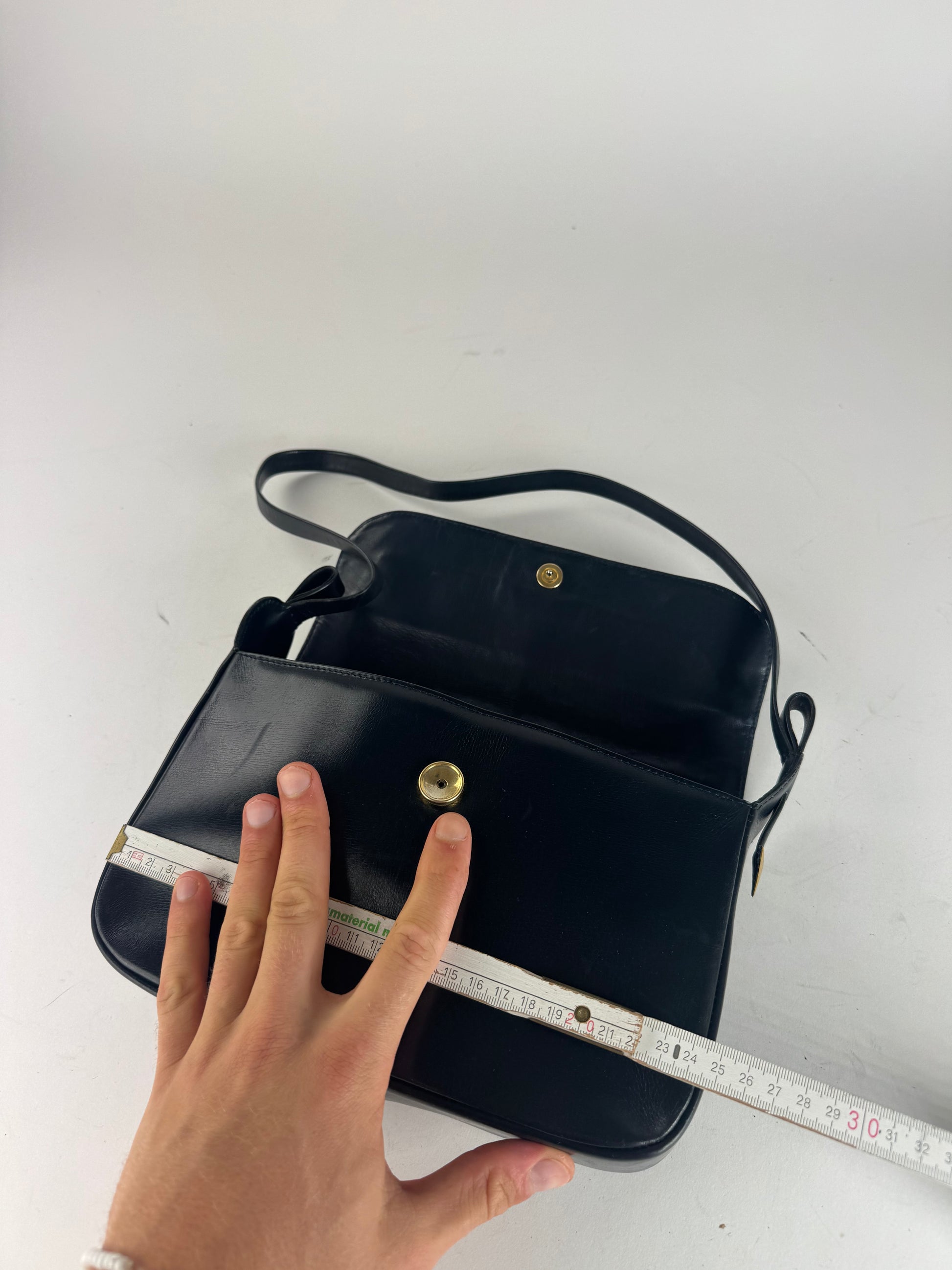 This chic handbag is finely crafted of navy blue leather. The bag features a flap with a snap button closure and gold-tone steel hardware. The interior is lined with matching navy leather. Made in France.