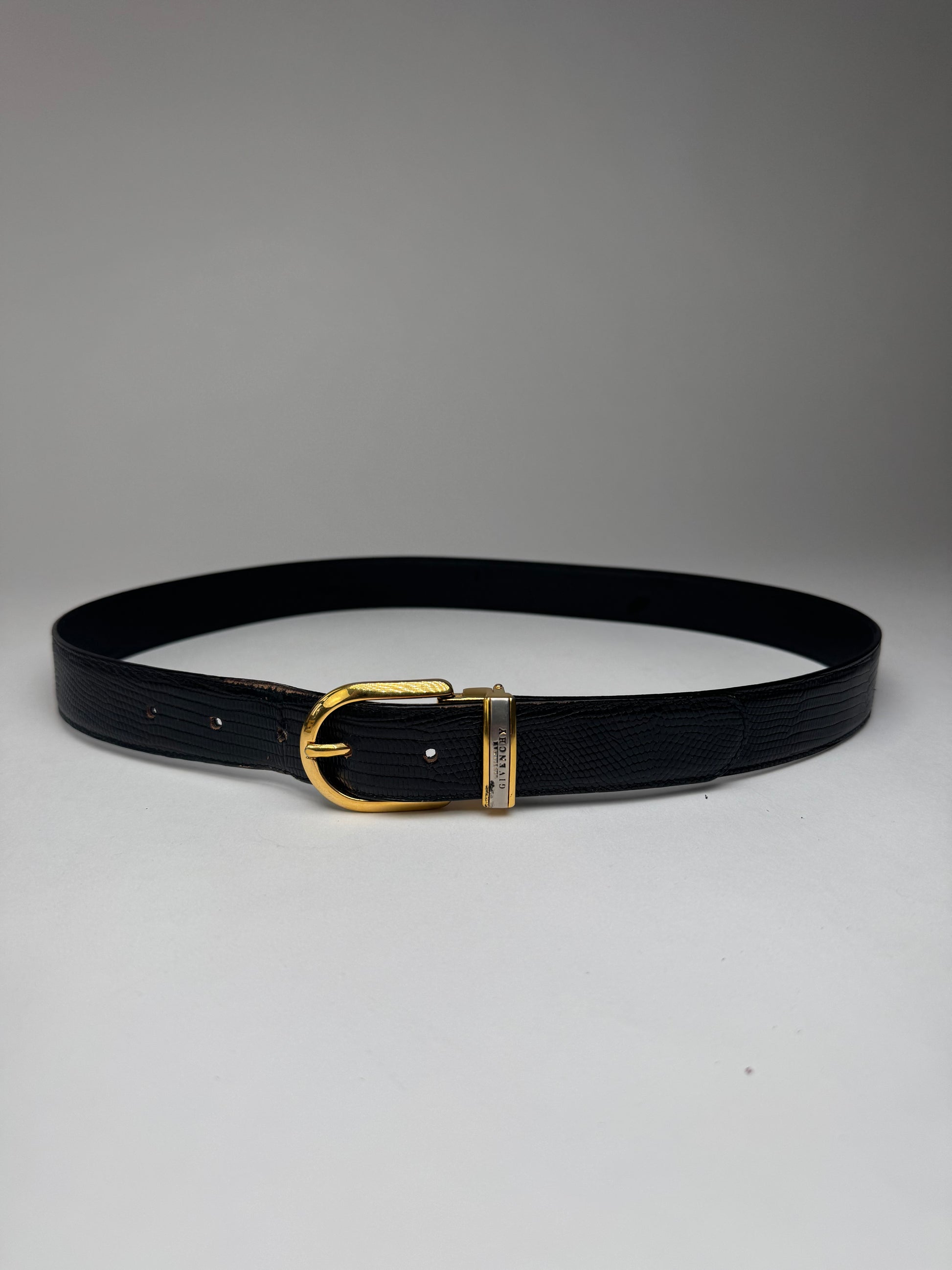 This sophisticated vintage belt is finely crafted from black snakeskin-embossed leather with a gold-tone steel buckle. Its timeless design makes it a versatile unisex accessory.