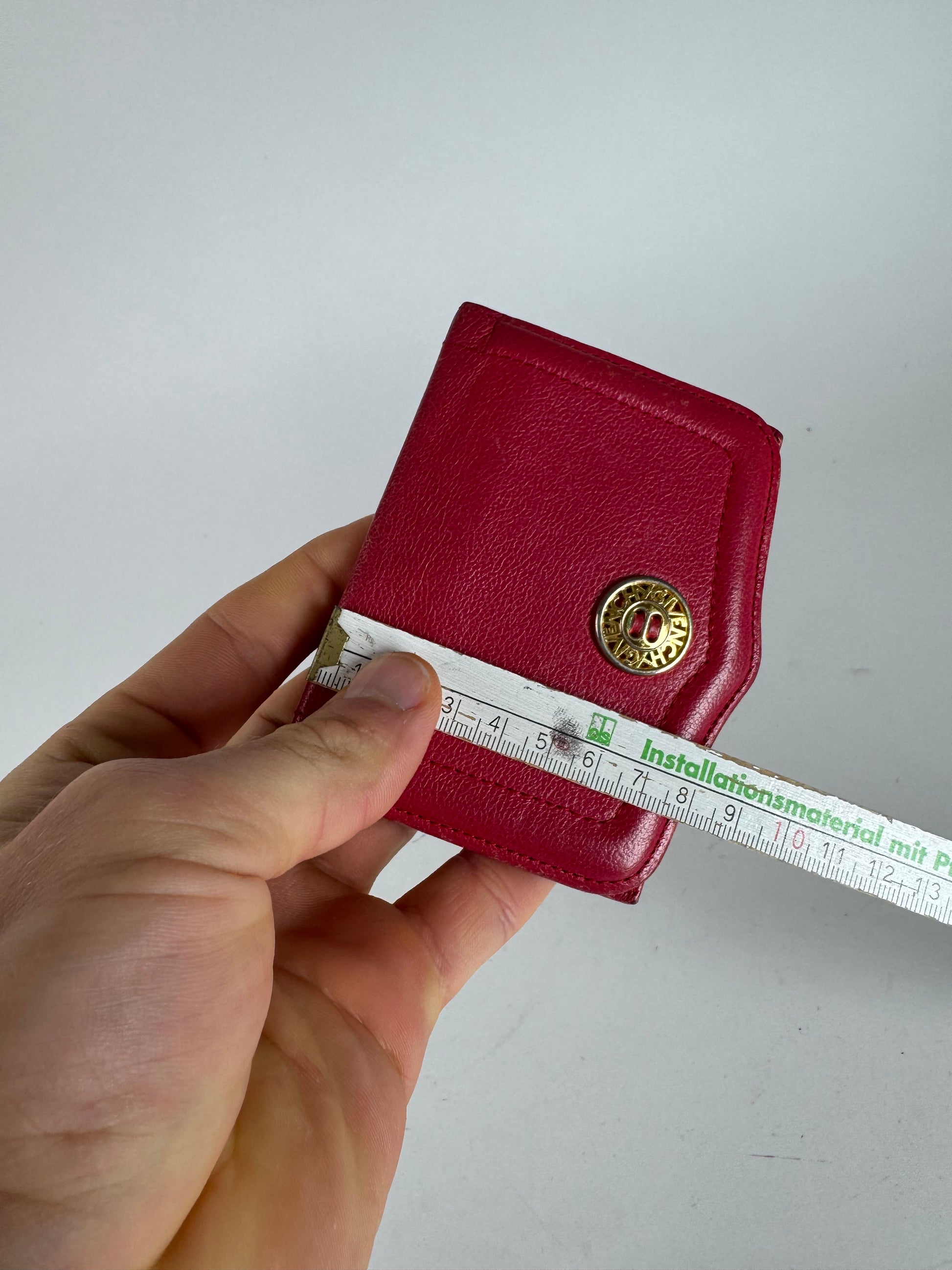 This vintage card holder is crafted from elegant red leather, featuring a timeless and functional design. The gold-toned steel hardware adds a refined touch. It includes a transparent PVC compartment on the back and an additional one inside for added practicality.