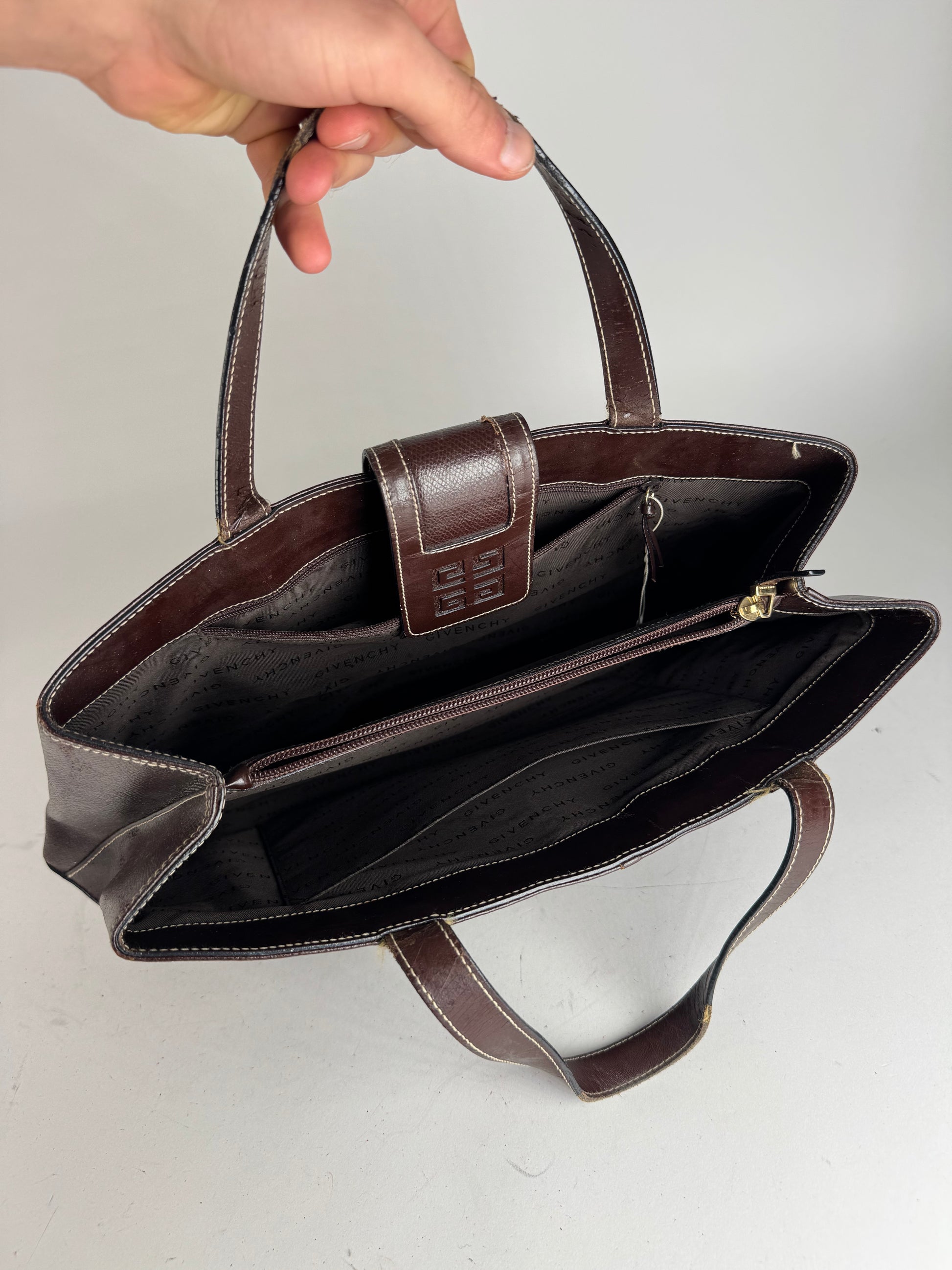 This elegant vintage handbag is finely crafted of brown leather with white stitching and gold-tone steel hardware. Givenchy, founded in 1952 by Hubert de Givenchy, is renowned for its refined Parisian elegance and timeless luxury design. The bag features a magnetic closure embossed with the Givenchy logo and a well-organized interior with five compartments. The interior is lined in brown canvas with Givenchy lettering.