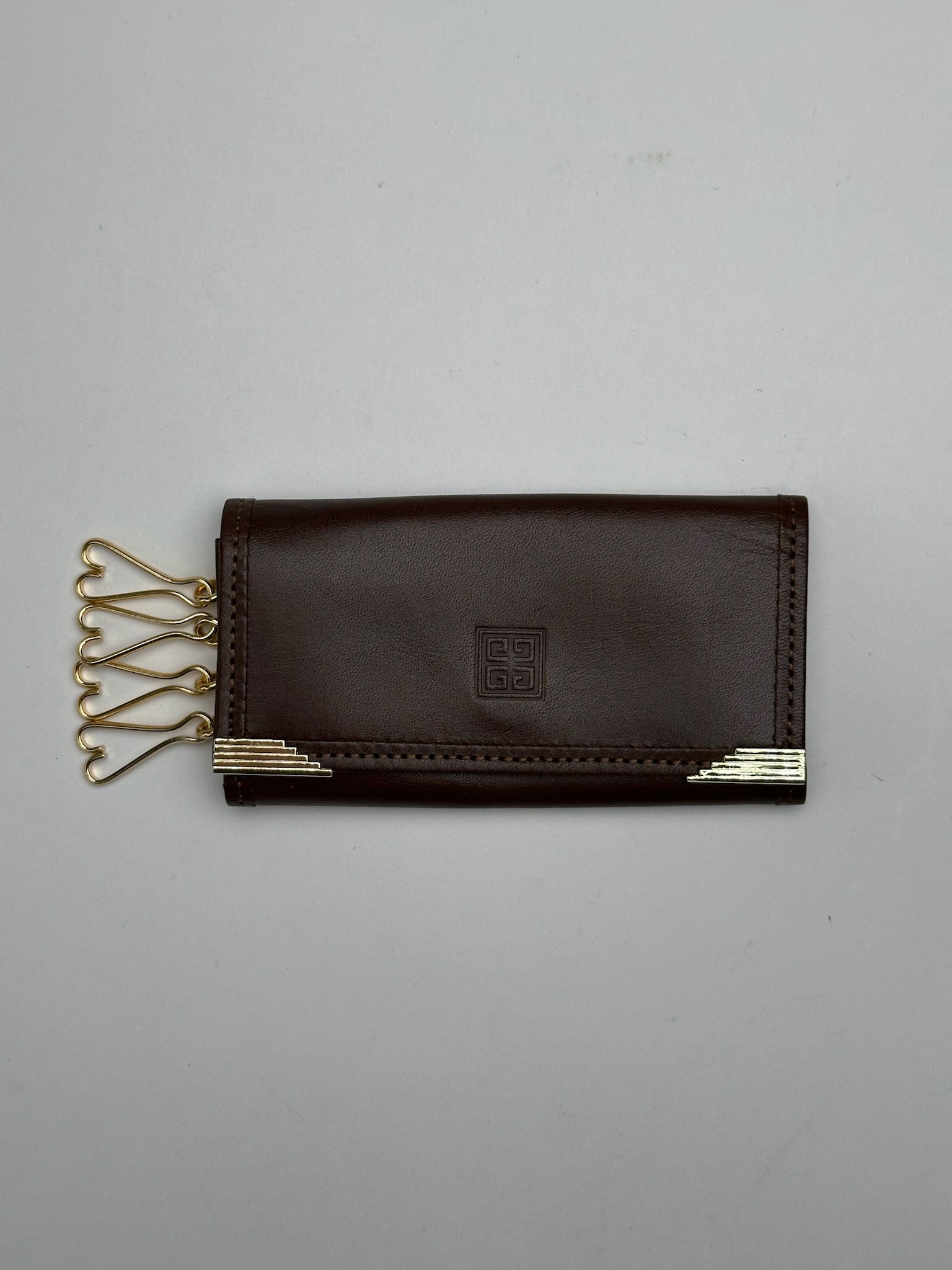 GIVENCHY Vintage Key Holder. This chic accessory is finely crafted of brown leather and features gold-tone steel hardware. It offers space for at least five keys, combining functionality with timeless style.
