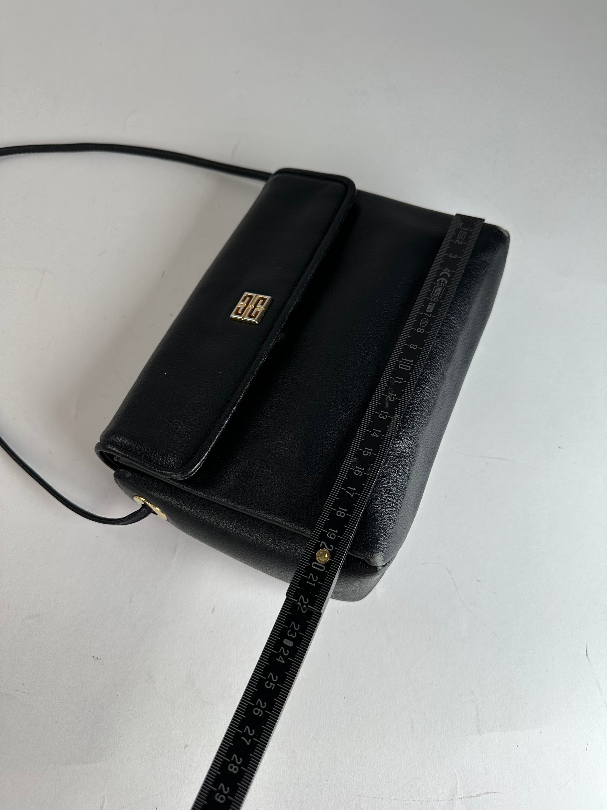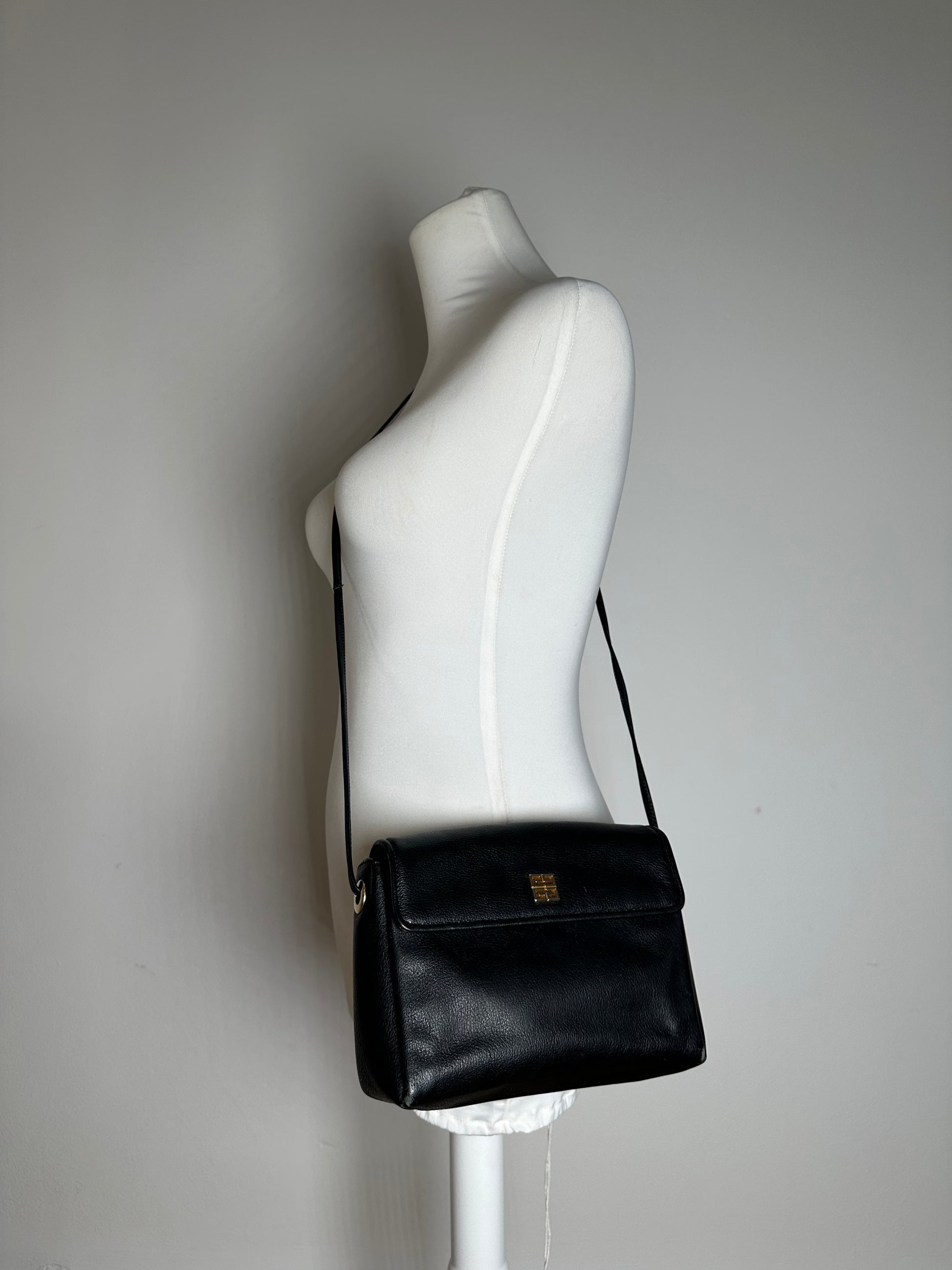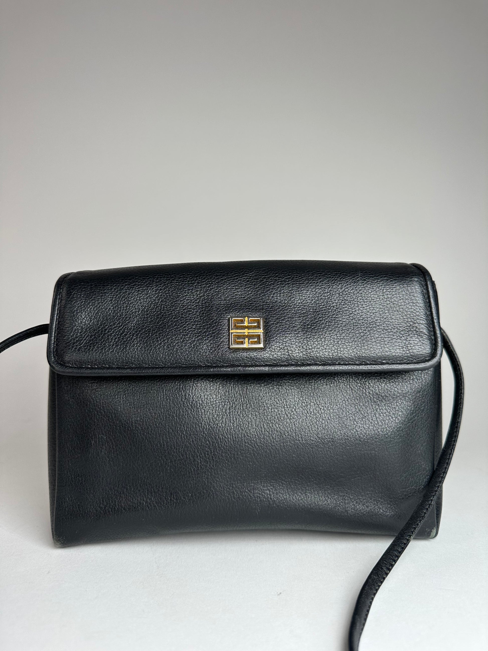 GIVENCHY Vintage Shoulder Bag. This elegant shoulder bag is crafted of black leather and features the Givenchy logo in gold-tone steel on the front. The design includes a magnetic closure and gold-tone steel hardware. The interior opens to black leather lining with three compartments for organized storage.