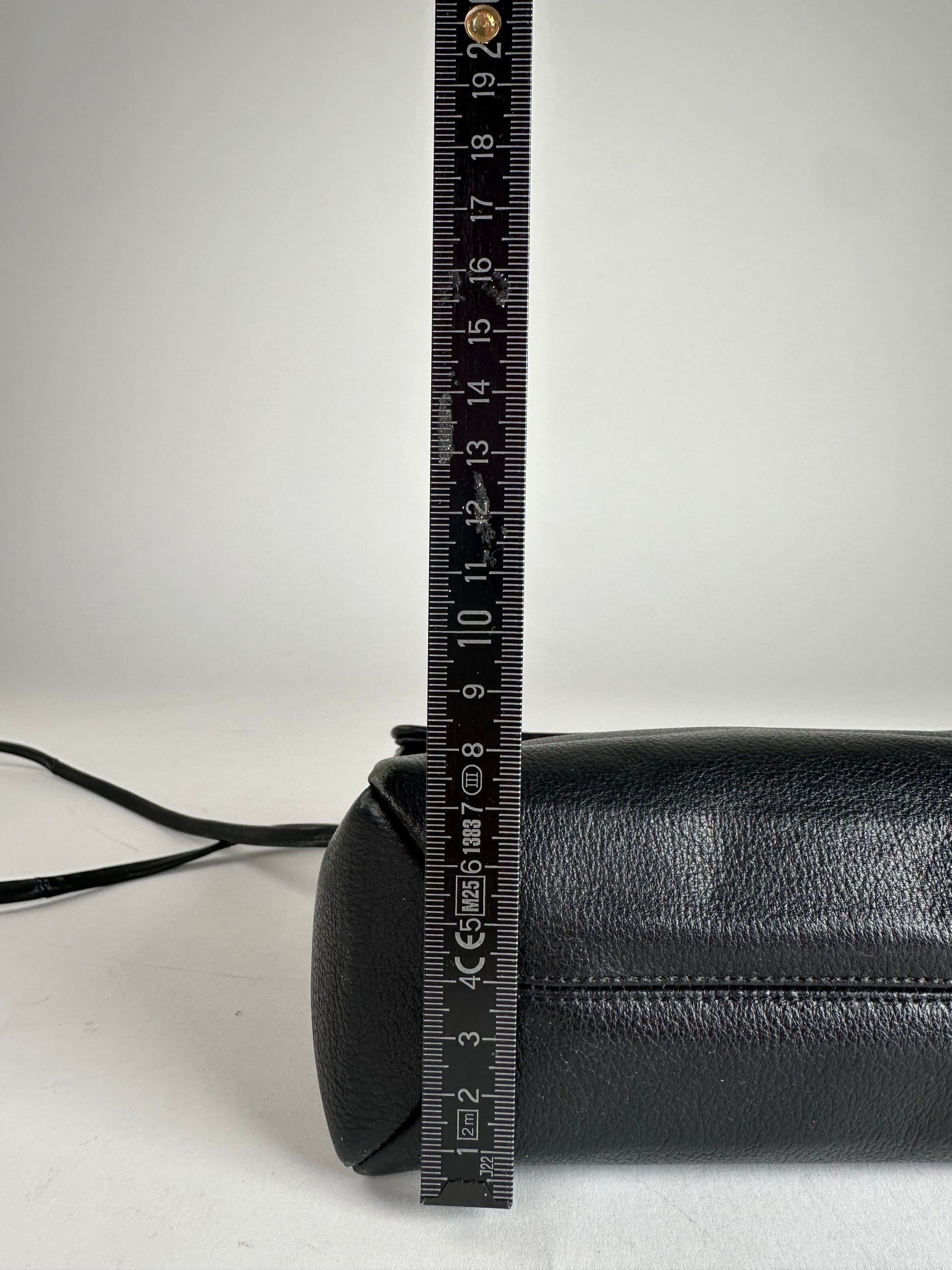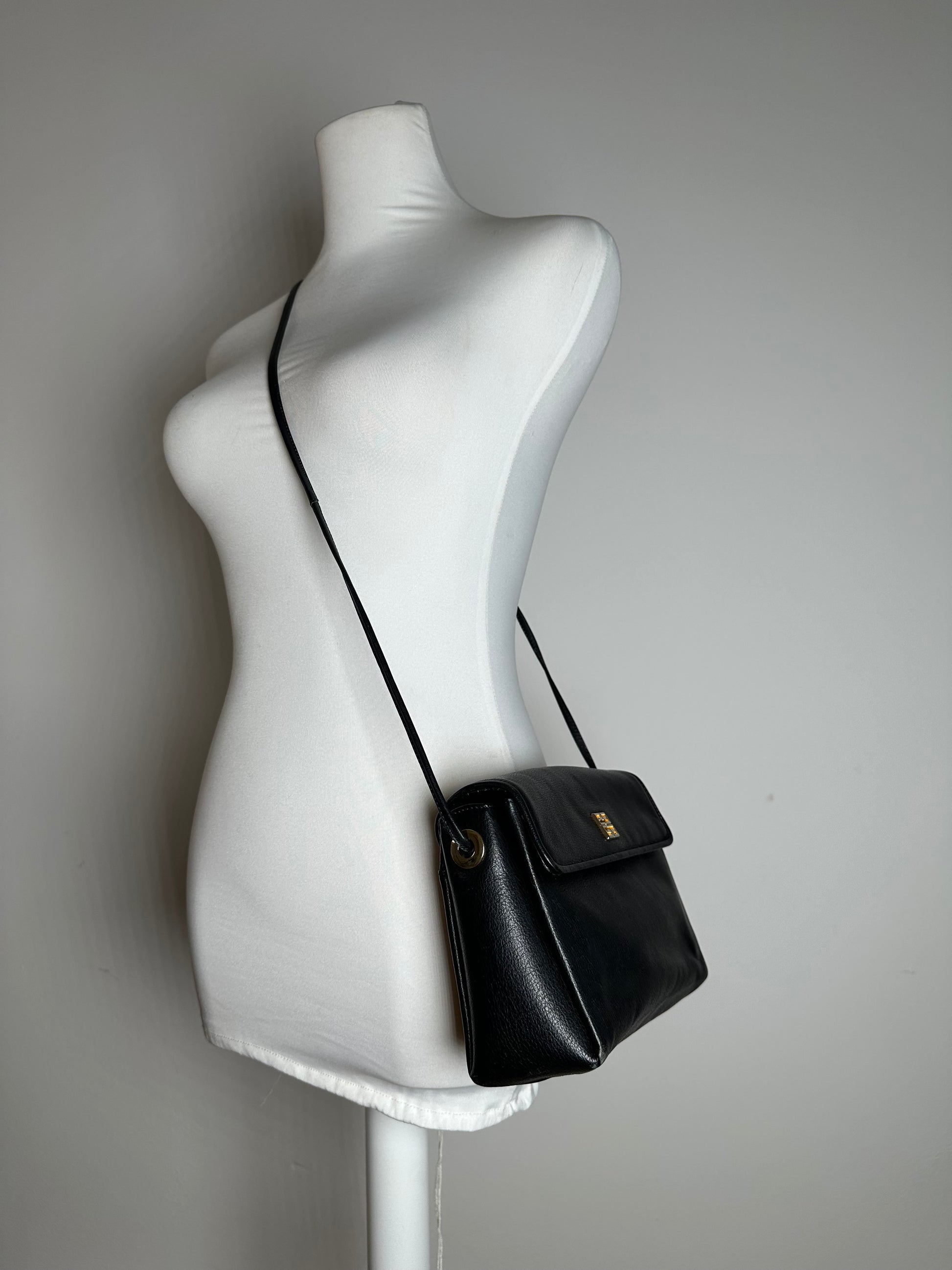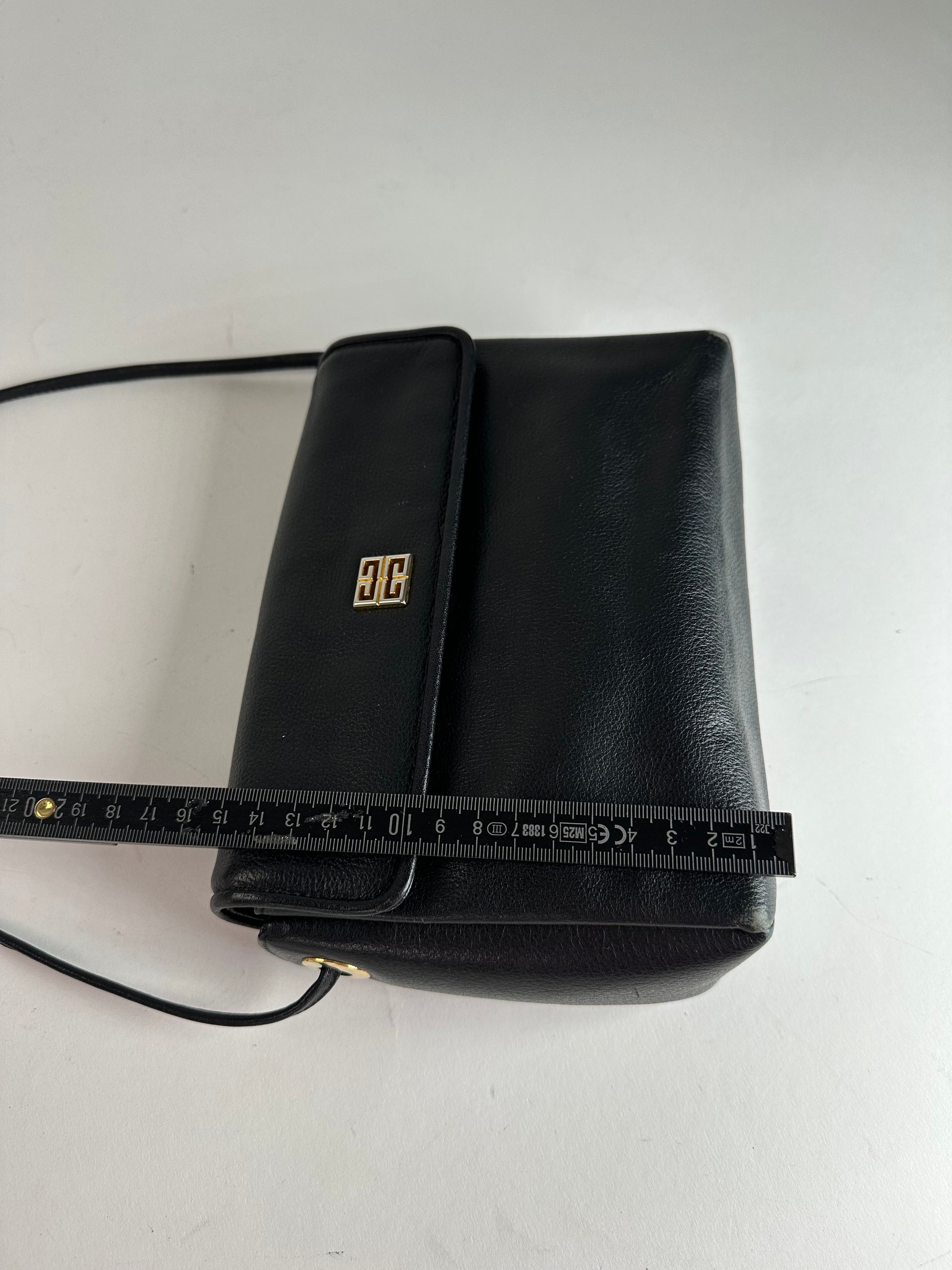 GIVENCHY Vintage Shoulder Bag. This elegant shoulder bag is crafted of black leather and features the Givenchy logo in gold-tone steel on the front. The design includes a magnetic closure and gold-tone steel hardware. The interior opens to black leather lining with three compartments for organized storage.