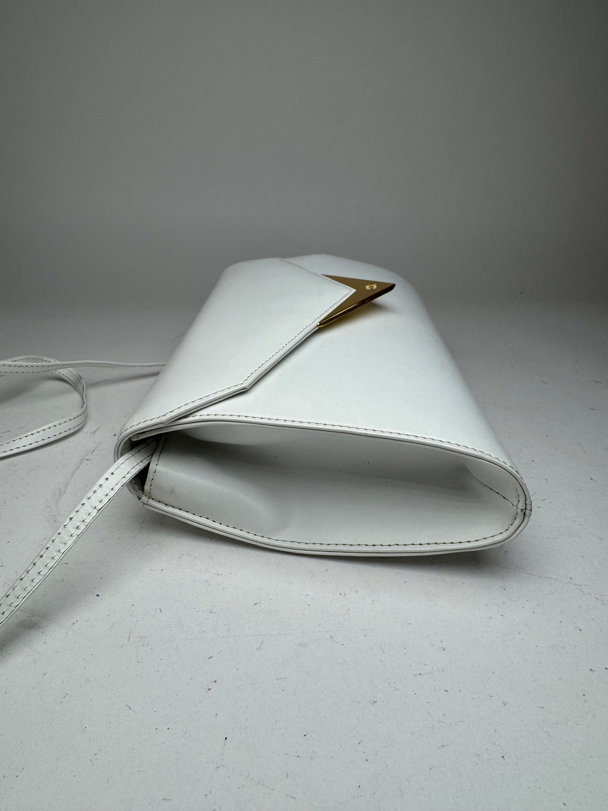 This refined vintage shoulder bag is finely crafted from smooth, structured white leather and features gold-tone steel hardware. The design includes a magnetic closure and a distinctive sculptural silhouette that highlights Givenchy’s elegant minimalist aesthetic. The interior is lined with beige canvas, and the bag is suitable for unisex wear.
