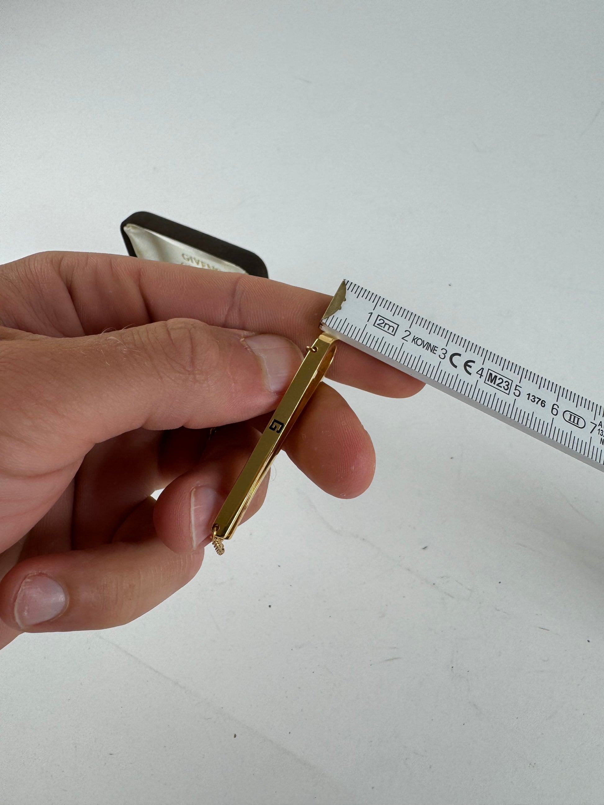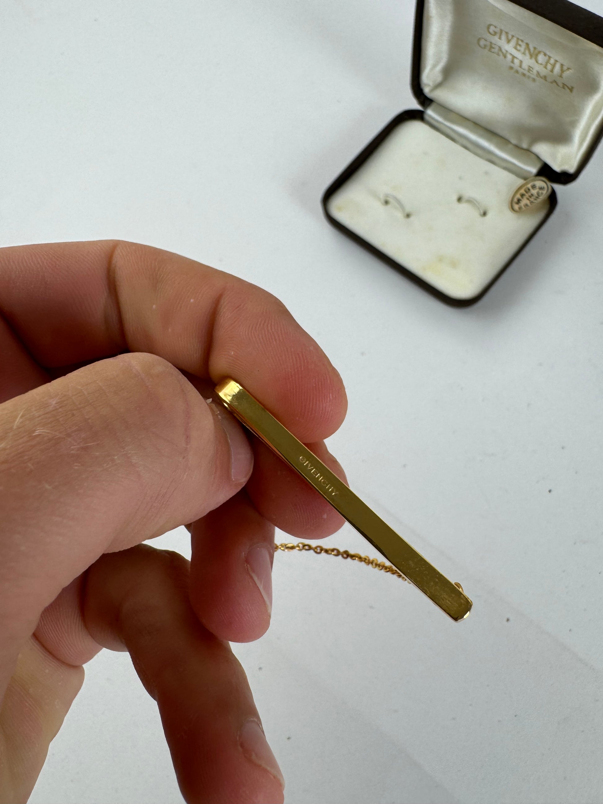 GIVENCHY Gold-Tone Tie Clip. This elegant tie clip is crafted from gold-tone steel and features a fine gold chain detail. A timeless accessory, likely from the 1980s. Made in France.