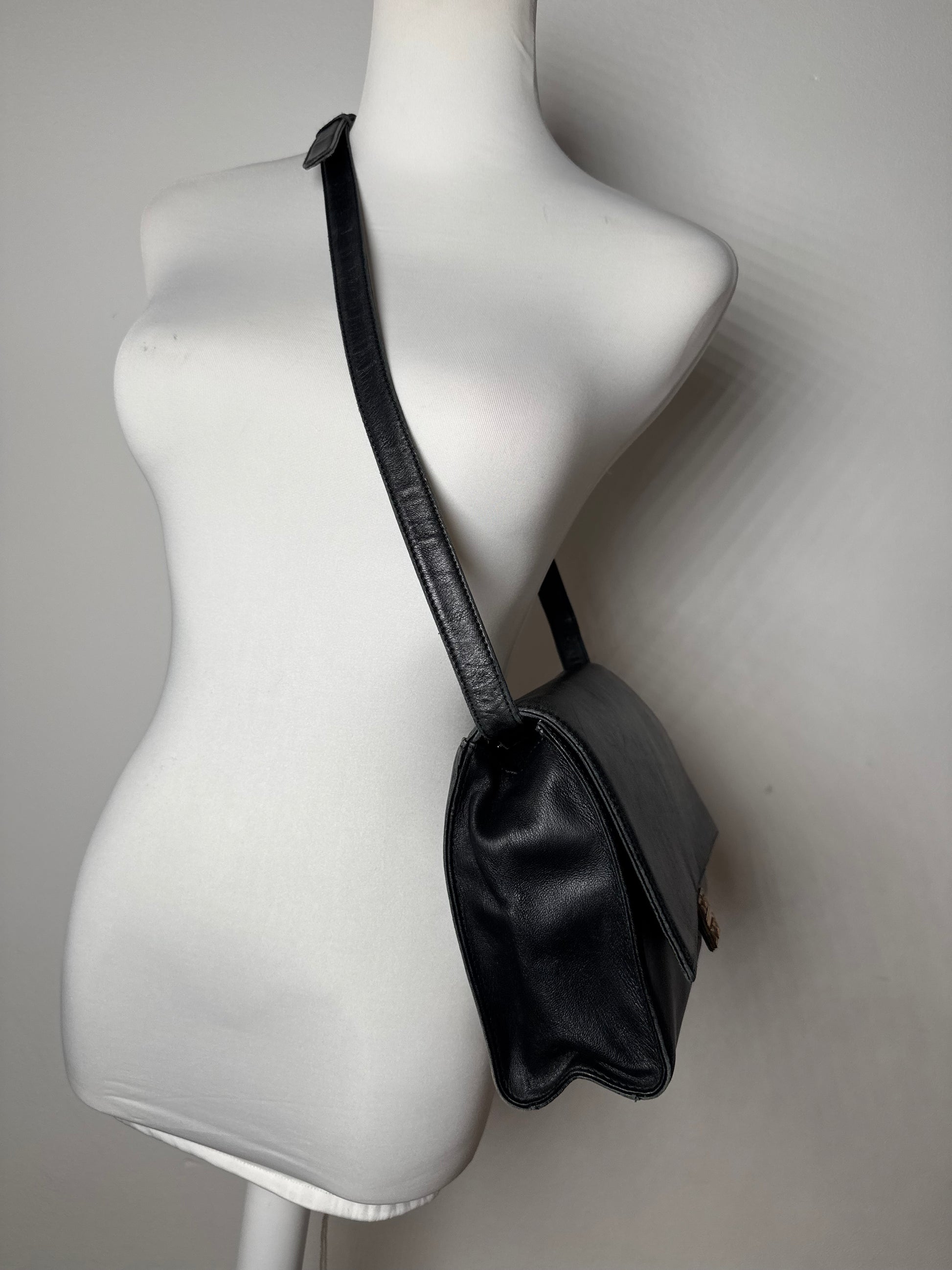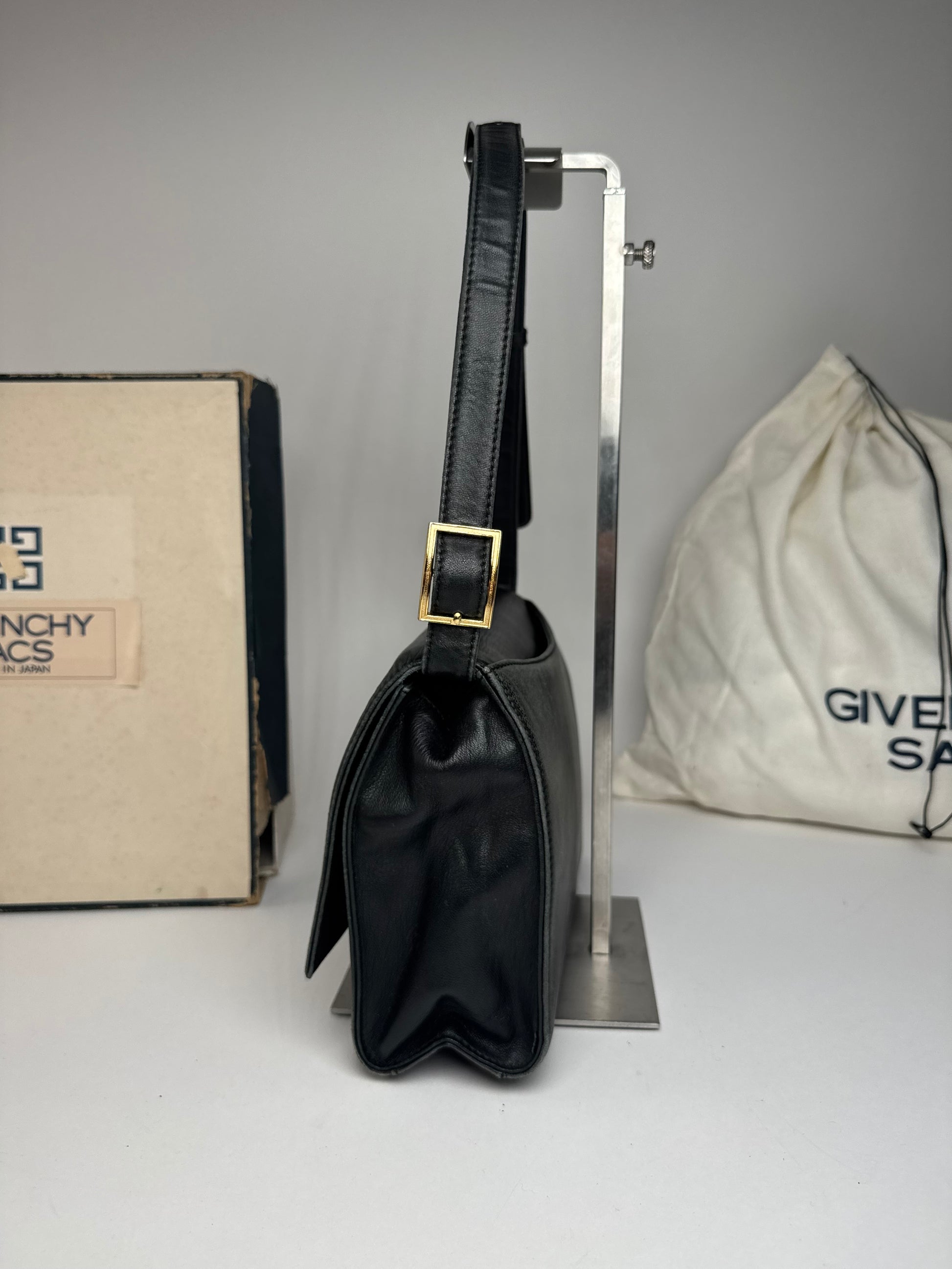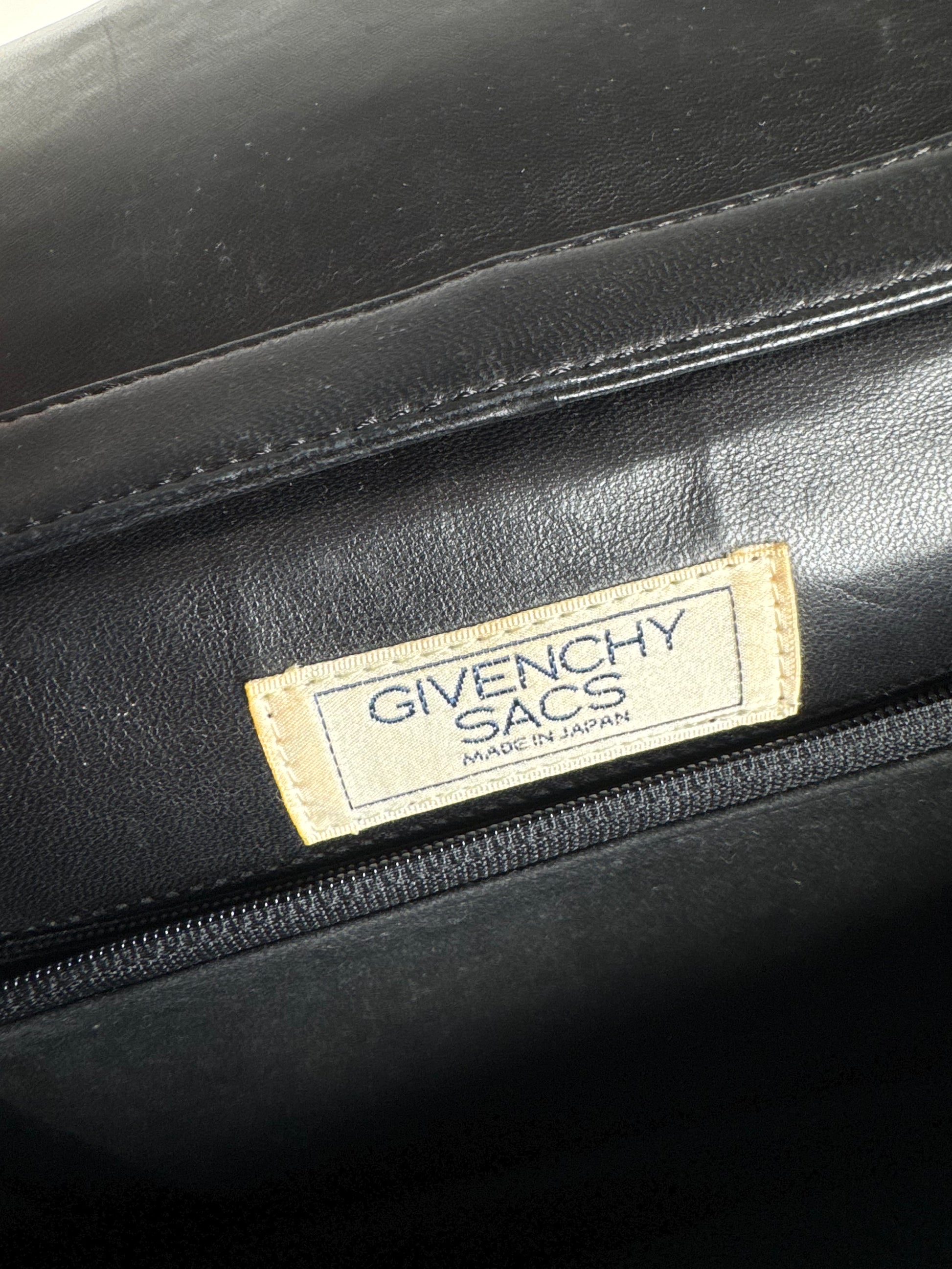 This chic handbag is finely crafted of smooth black leather with a gold- and steel-tone Givenchy logo on the front. The house of Givenchy, founded in 1952 by Hubert de Givenchy, is celebrated for its elegant Parisian design language and timeless accessories. This multiway design features an adjustable strap, allowing it to be worn as a handheld bag or as a shoulder crossbody. The interior is lined in black canvas.