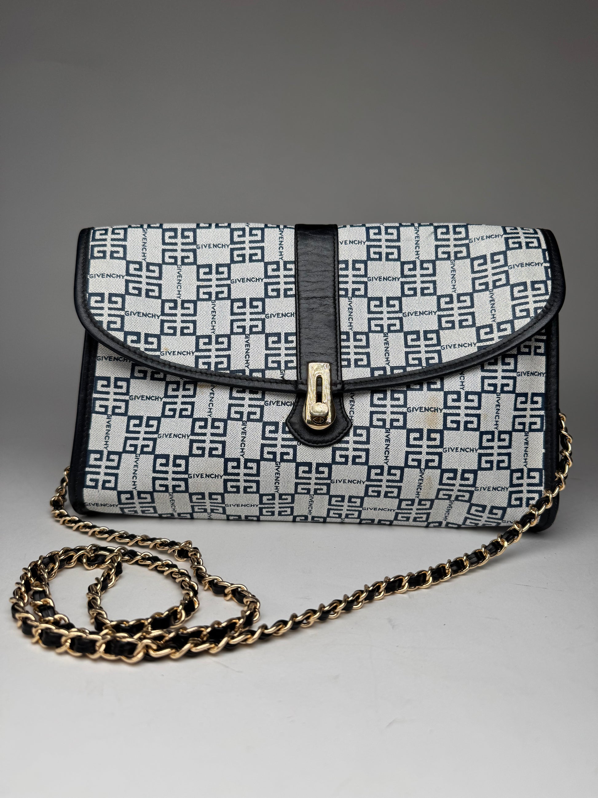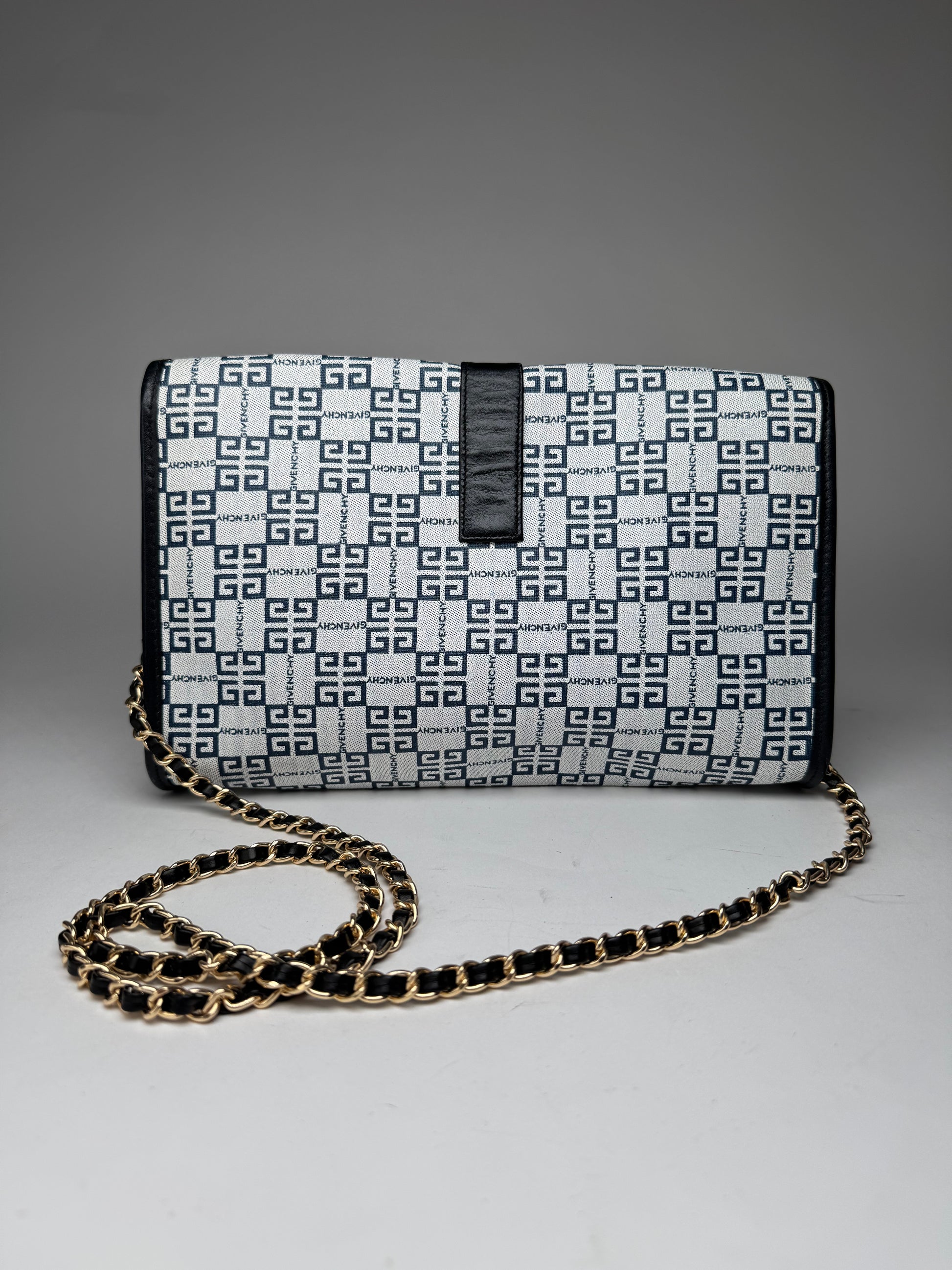 This vintage handbag is finely crafted from black, white, and navy Givenchy monogram canvas. The design features gold-tone steel hardware and a non-original, later-attached shoulder strap. The interior is lined with black leather, offering a refined and durable finish. A timeless unisex piece.