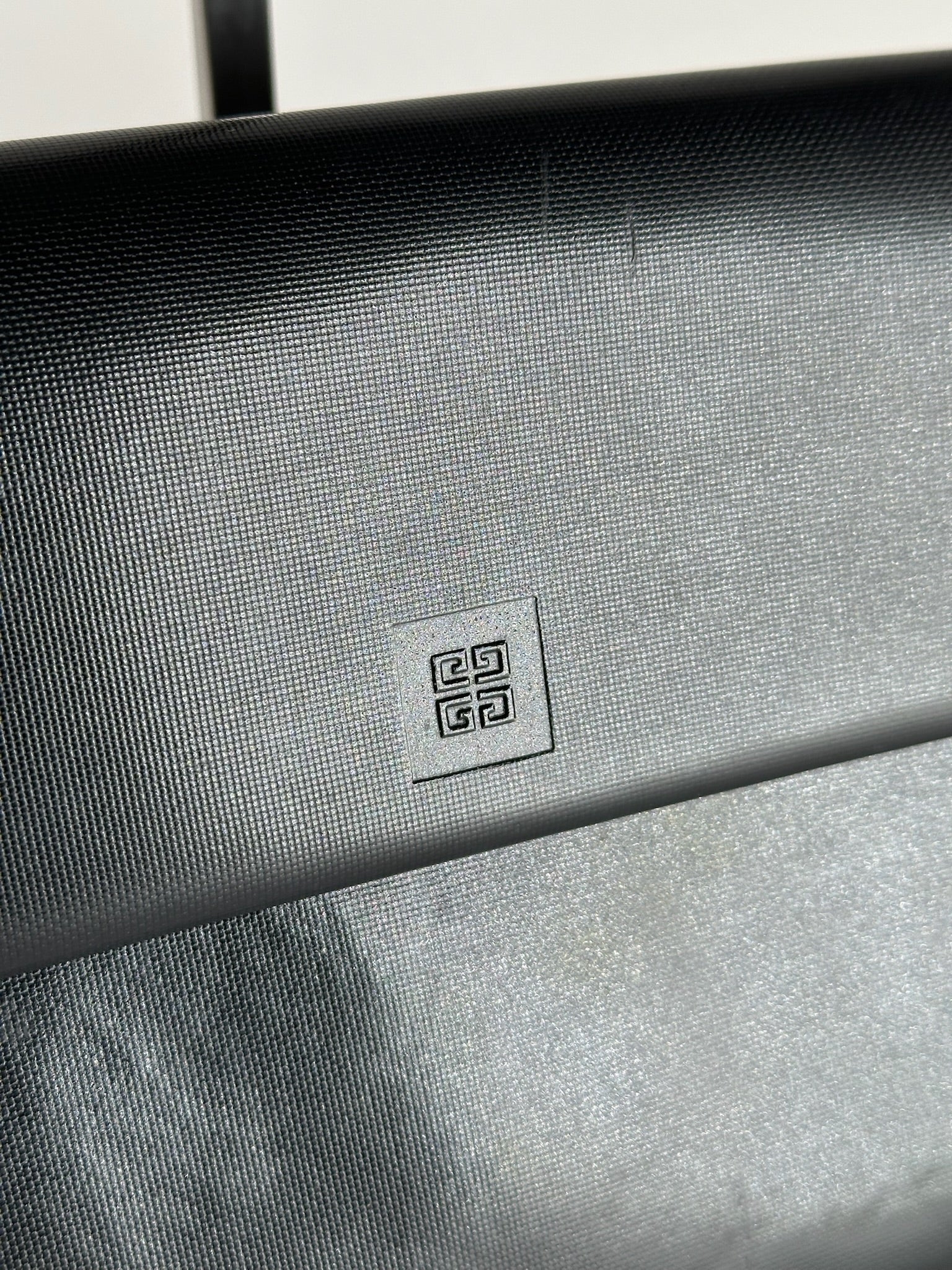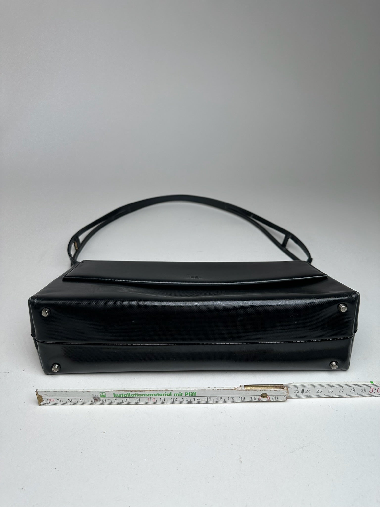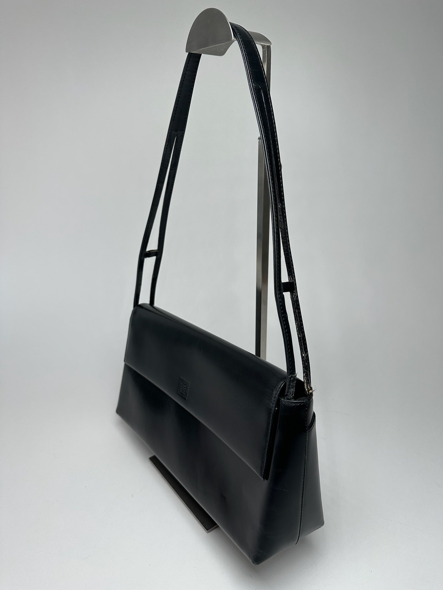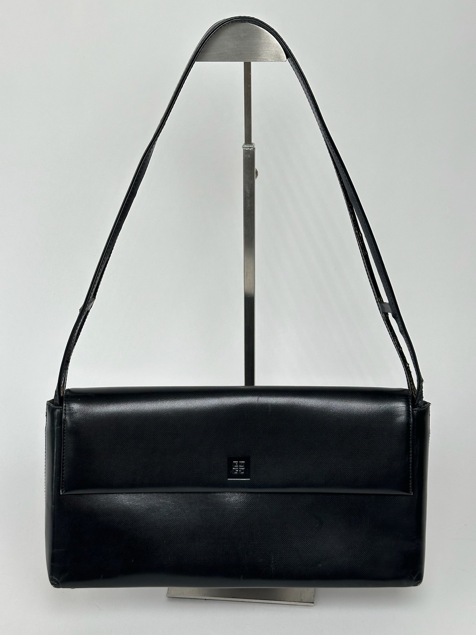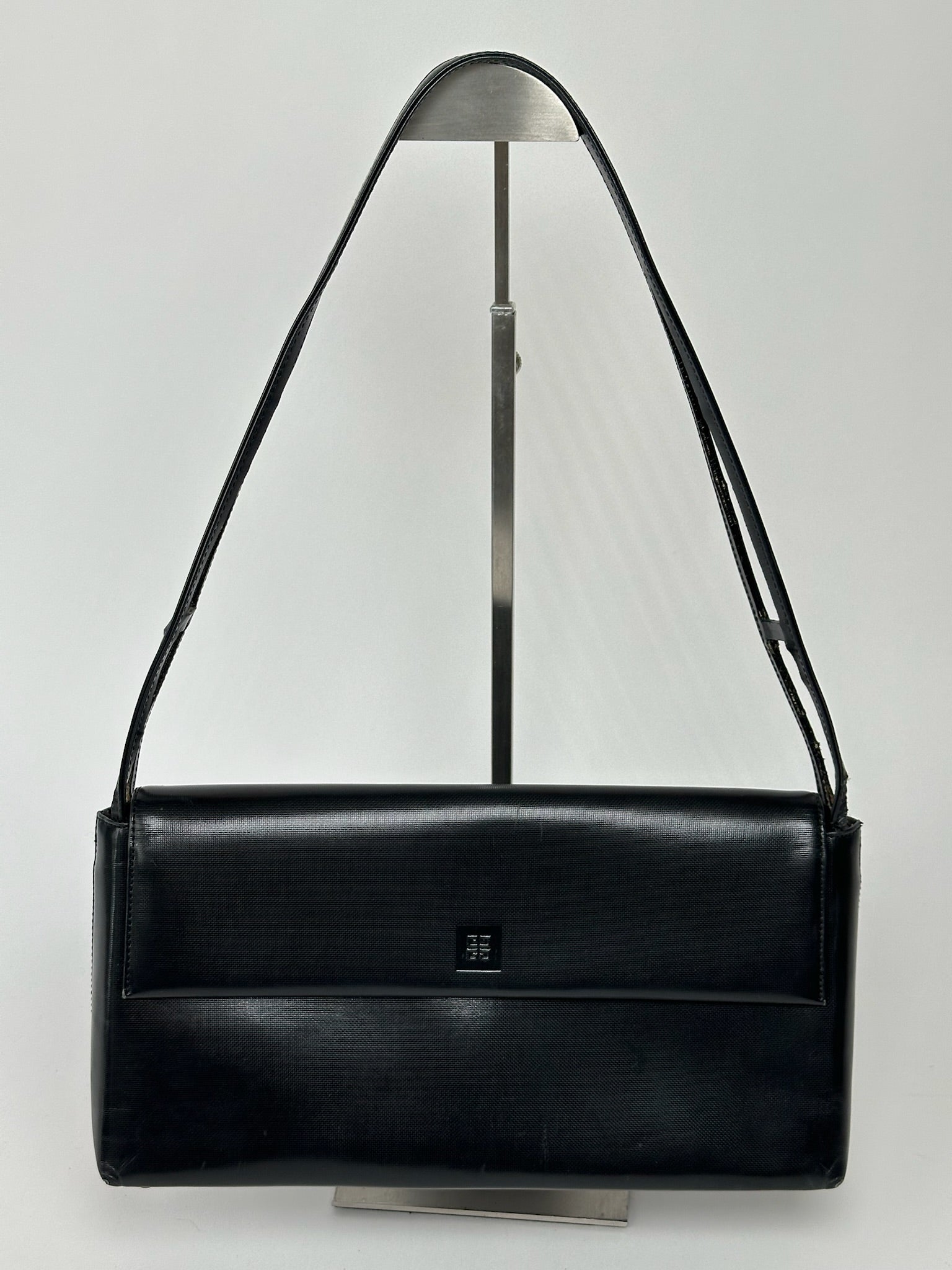 GIVENCHY 4G Vintage Handbag. This chic handbag is finely crafted of black patent leather and features silver-tone steel hardware. It has a structured silhouette with a magnetic closure for easy access.