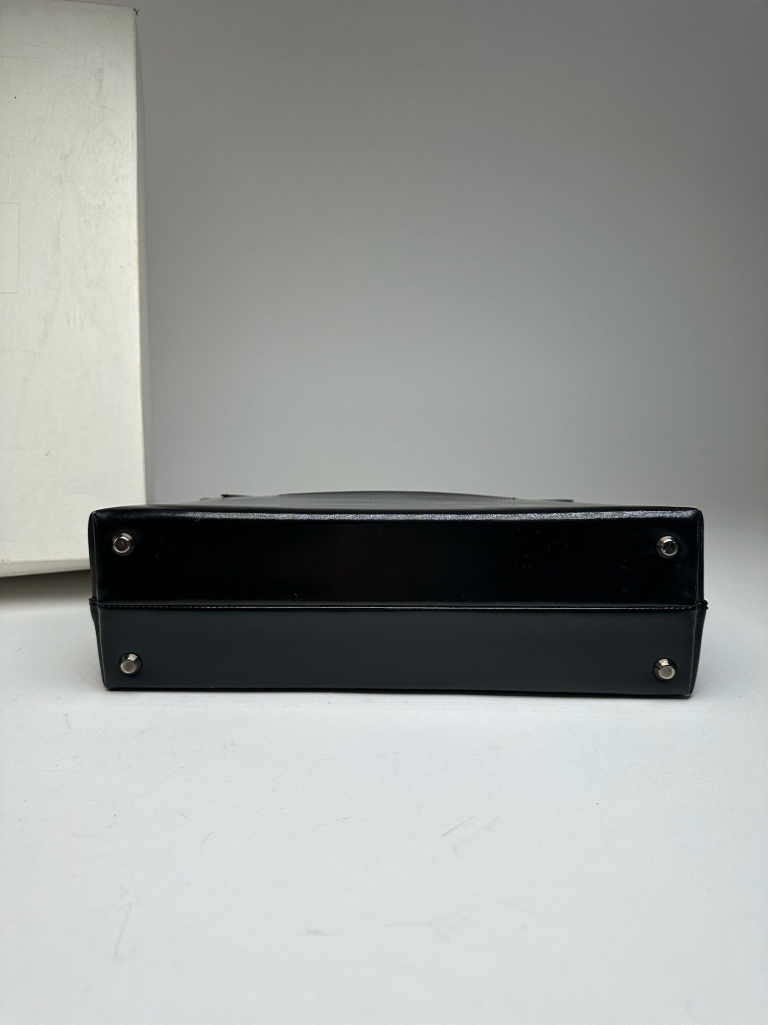 GIVENCHY Vintage Patent Leather Handbag. This chic handbag is finely crafted of black patent leather with a matching medium-length handle. The front features an embossed GIVENCHY logo. First introduced in the 1970s, the Givenchy logo—with its distinctive interlocking "G"s—embodies the brand’s blend of Parisian elegance and modern graphic design. The bag features a magnetic snap closure and opens to a black canvas interior. It is also water-resistant.