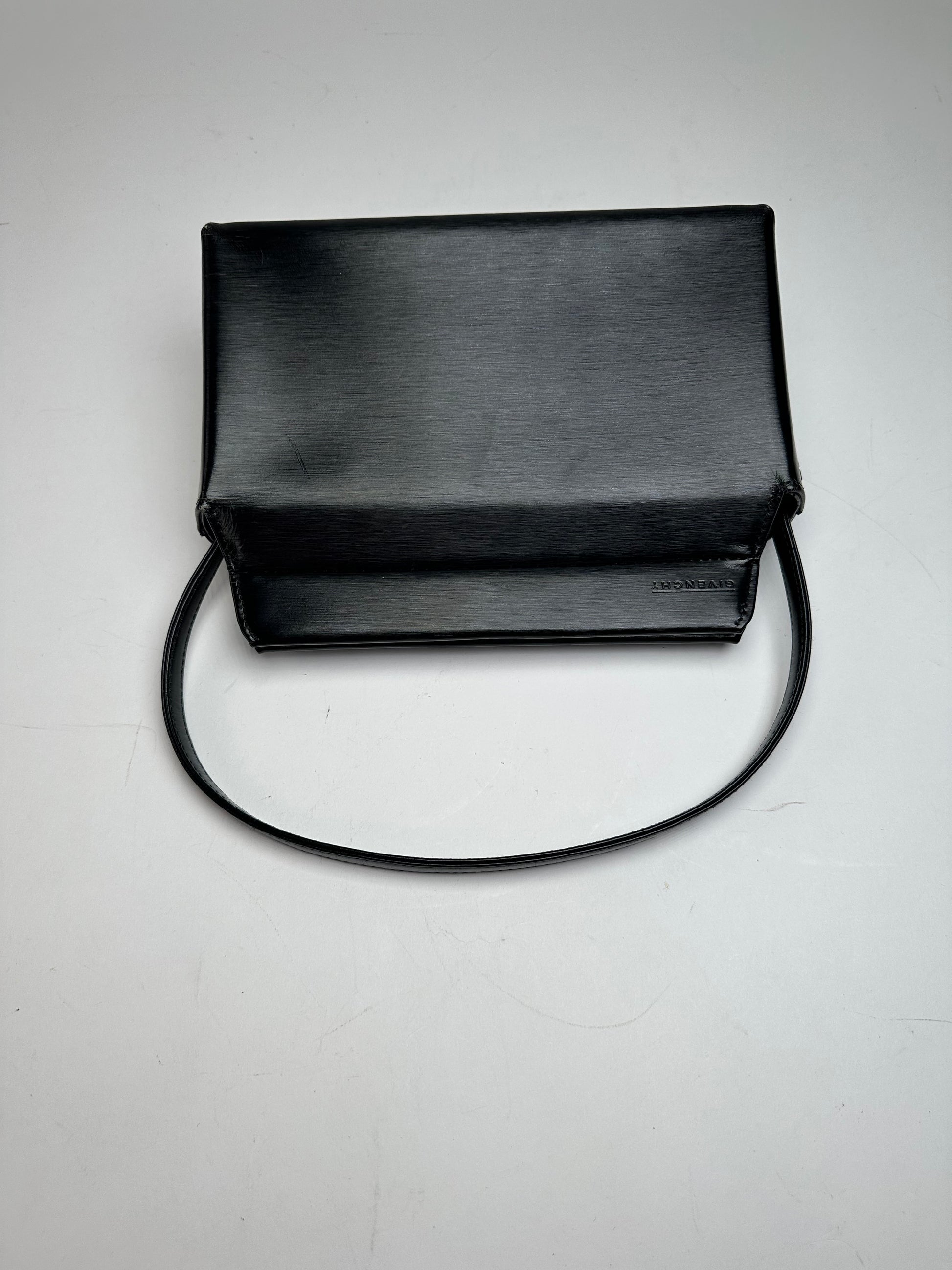 GIVENCHY Vintage Leather Handbag. This elegant vintage handbag is finely crafted of smooth black leather. The bag features a short top handle, silver-tone Givenchy appliqué details on the sides, and an embossed Givenchy logo on the front. The bag opens with a magnetic closure to a black canvas interior.