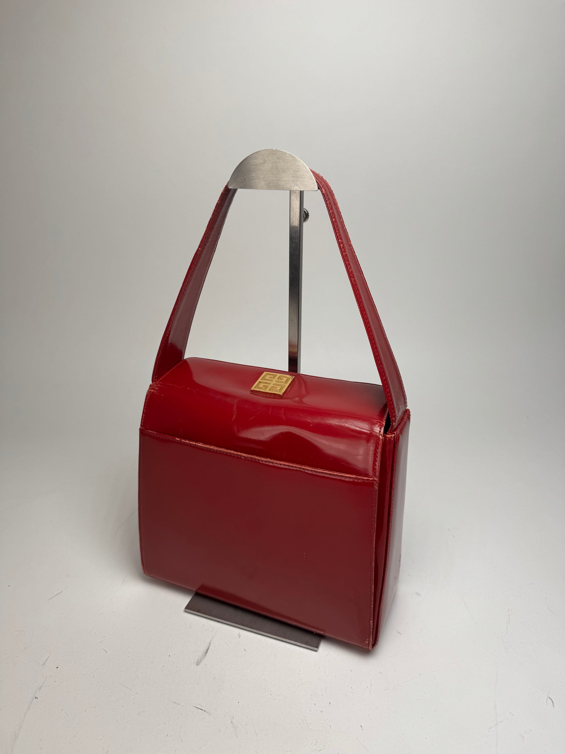 This vintage Givenchy handbag is crafted in red patent leather and features a structured silhouette with a flap-and-magnetic hybrid closure. The front is accented with a gold-tone steel Givenchy logo plaque. Designed with a mid-length handle that can be worn comfortably on the shoulder, the bag opens to a pink canvas interior. A chic and bold archival piece from the maison.