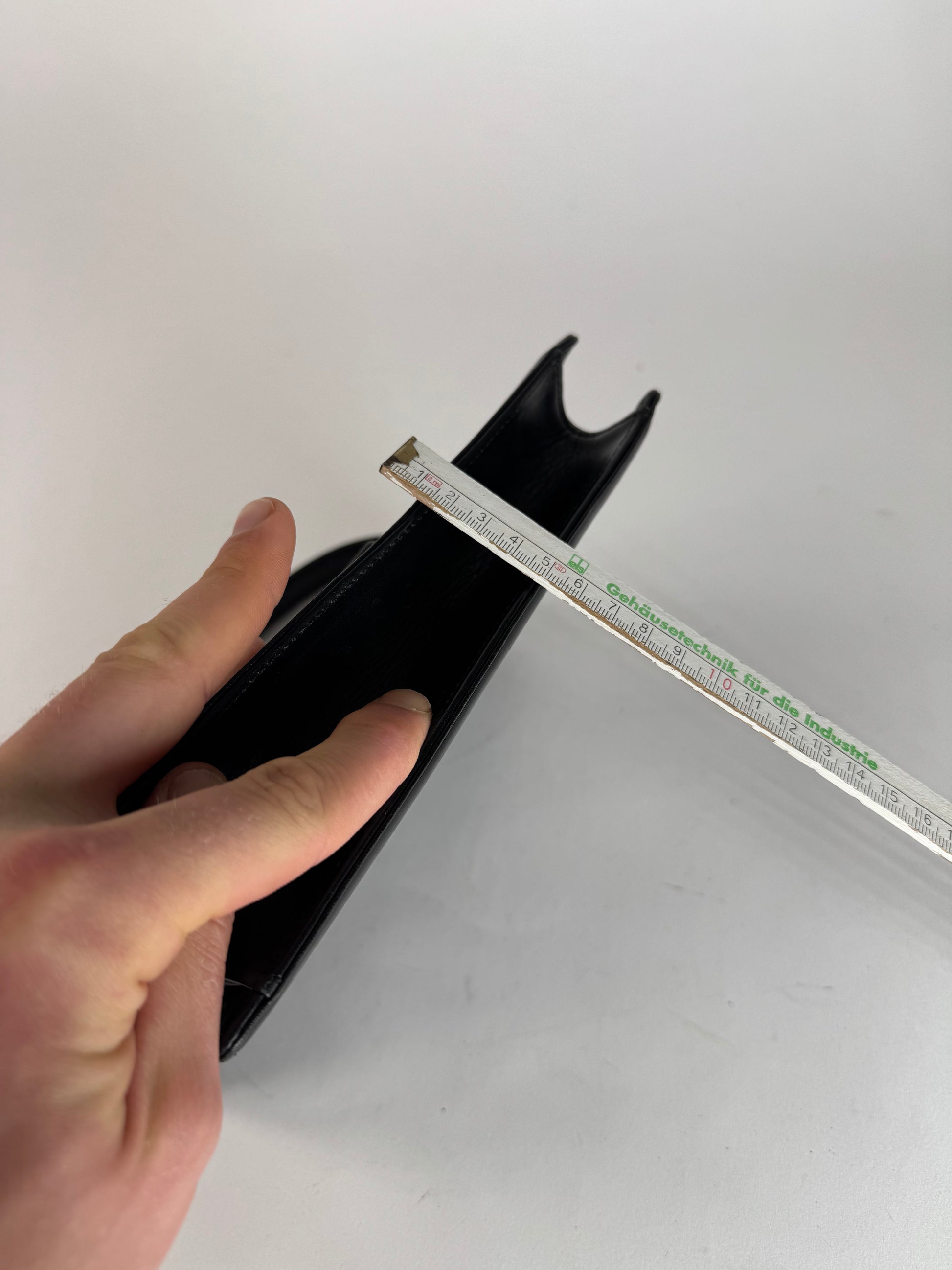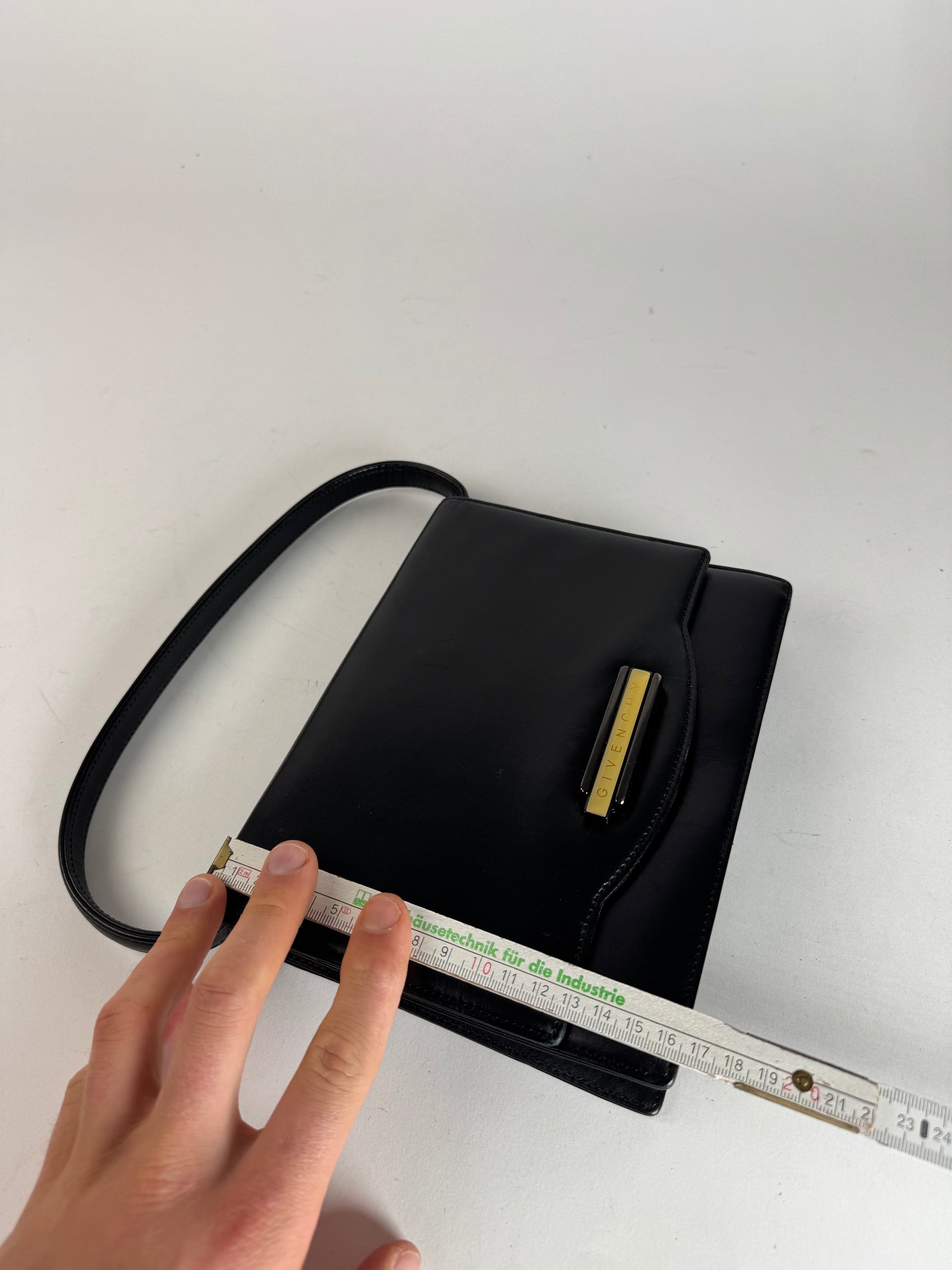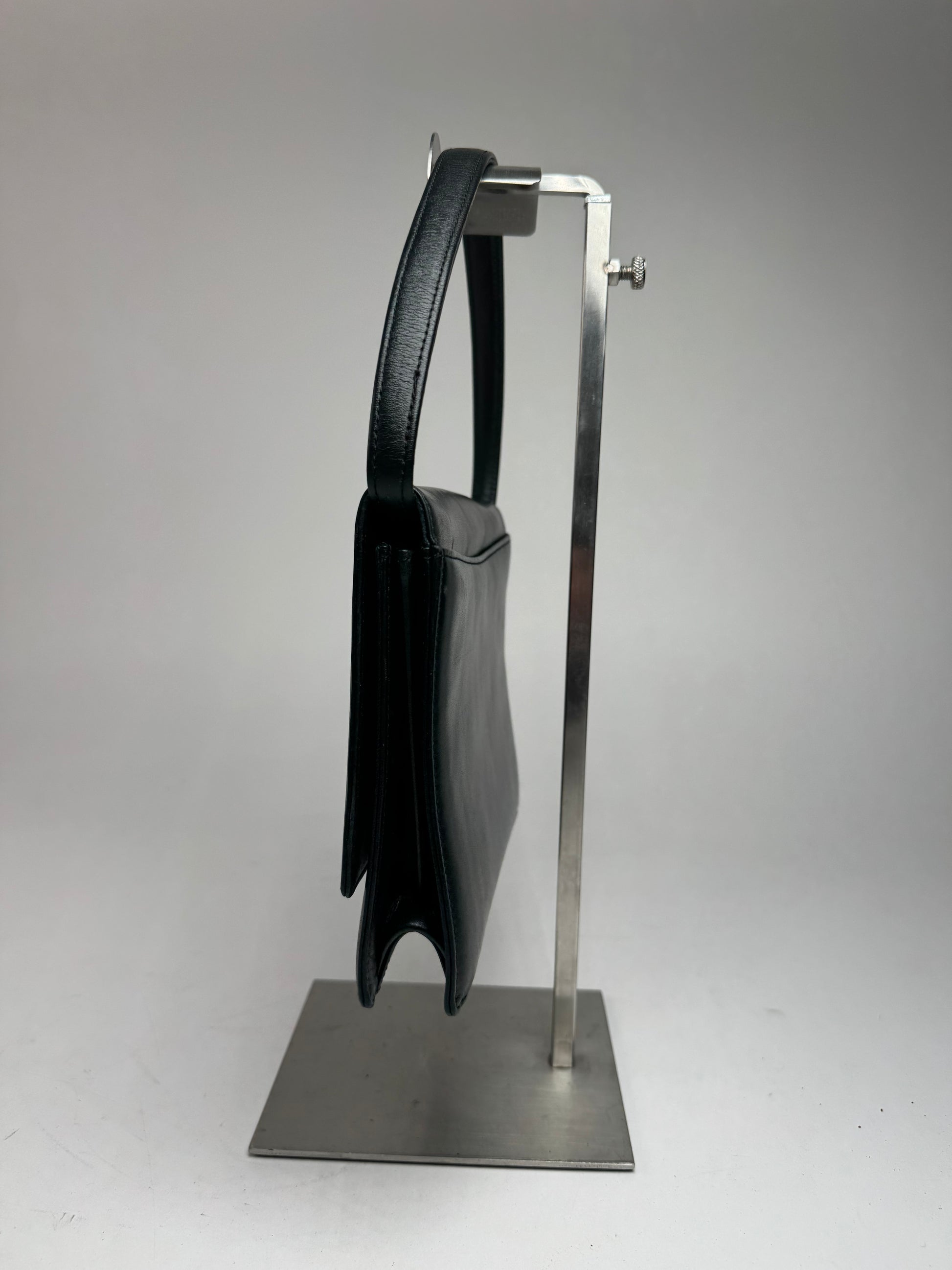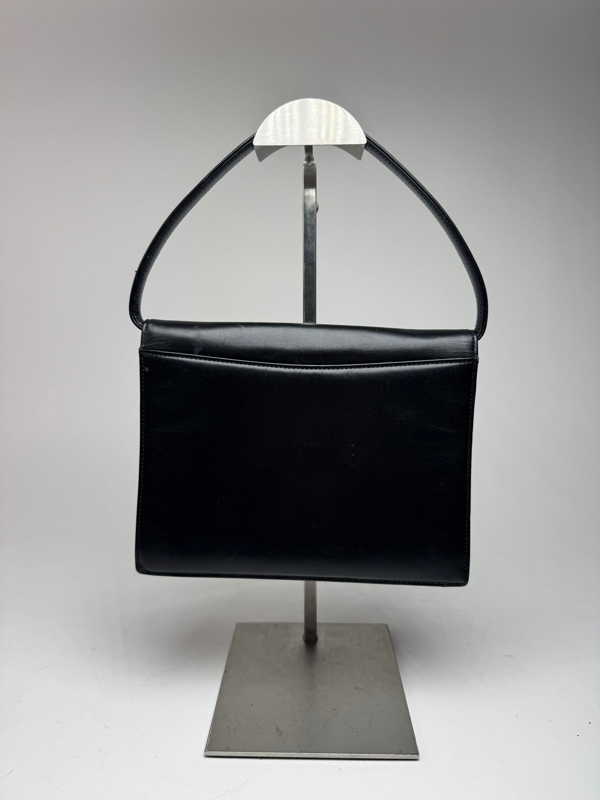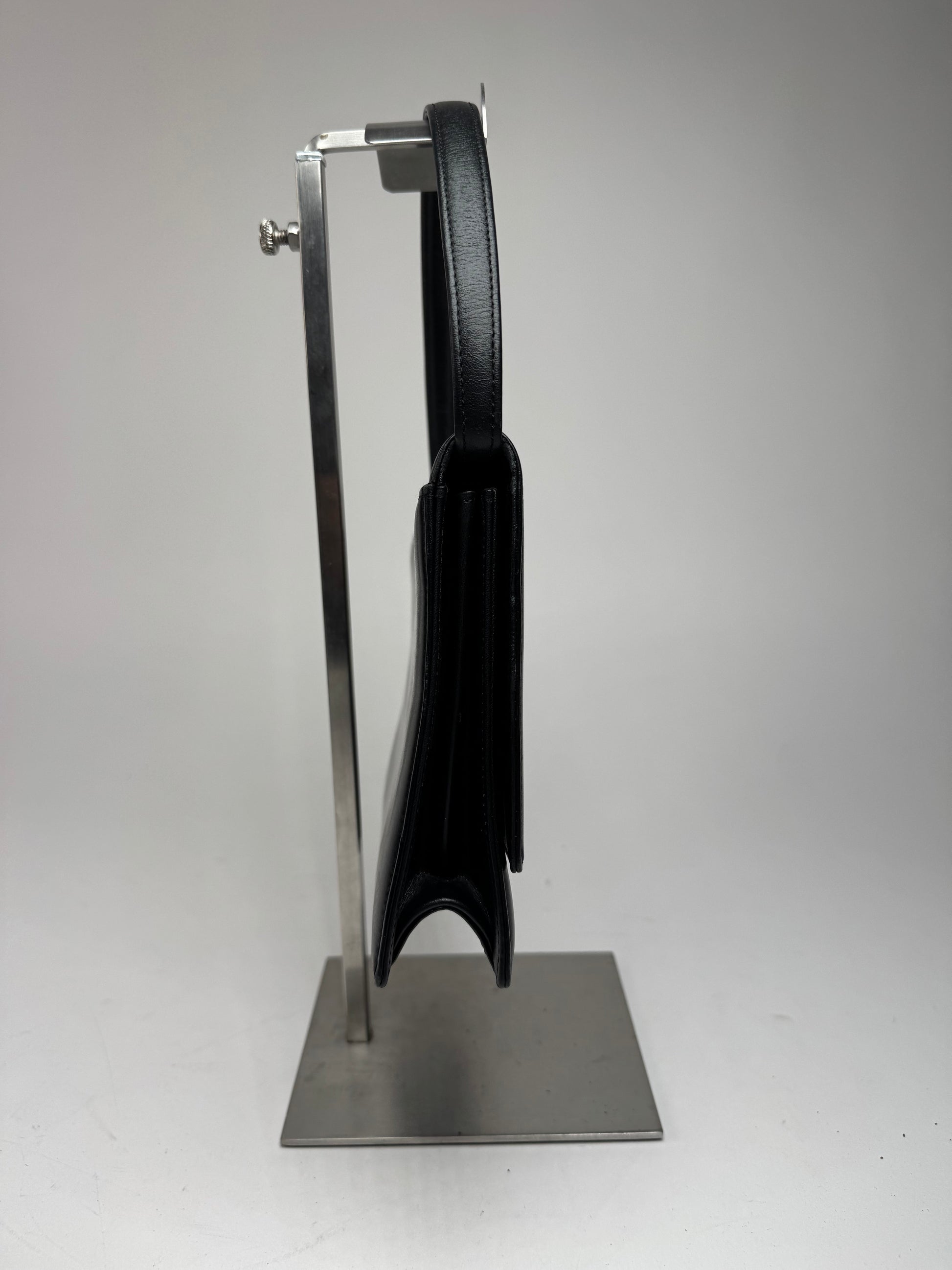 This vintage handbag is finely crafted from gold leather, featuring a relatively short handle and striking black hardware. The interior is lined with black leather, complementing its elegant design. It secures with a magnetic closure for easy access. Despite some scratches, the overall condition remains very good. A timeless and sophisticated piece from Givenchy’s Whip collection.