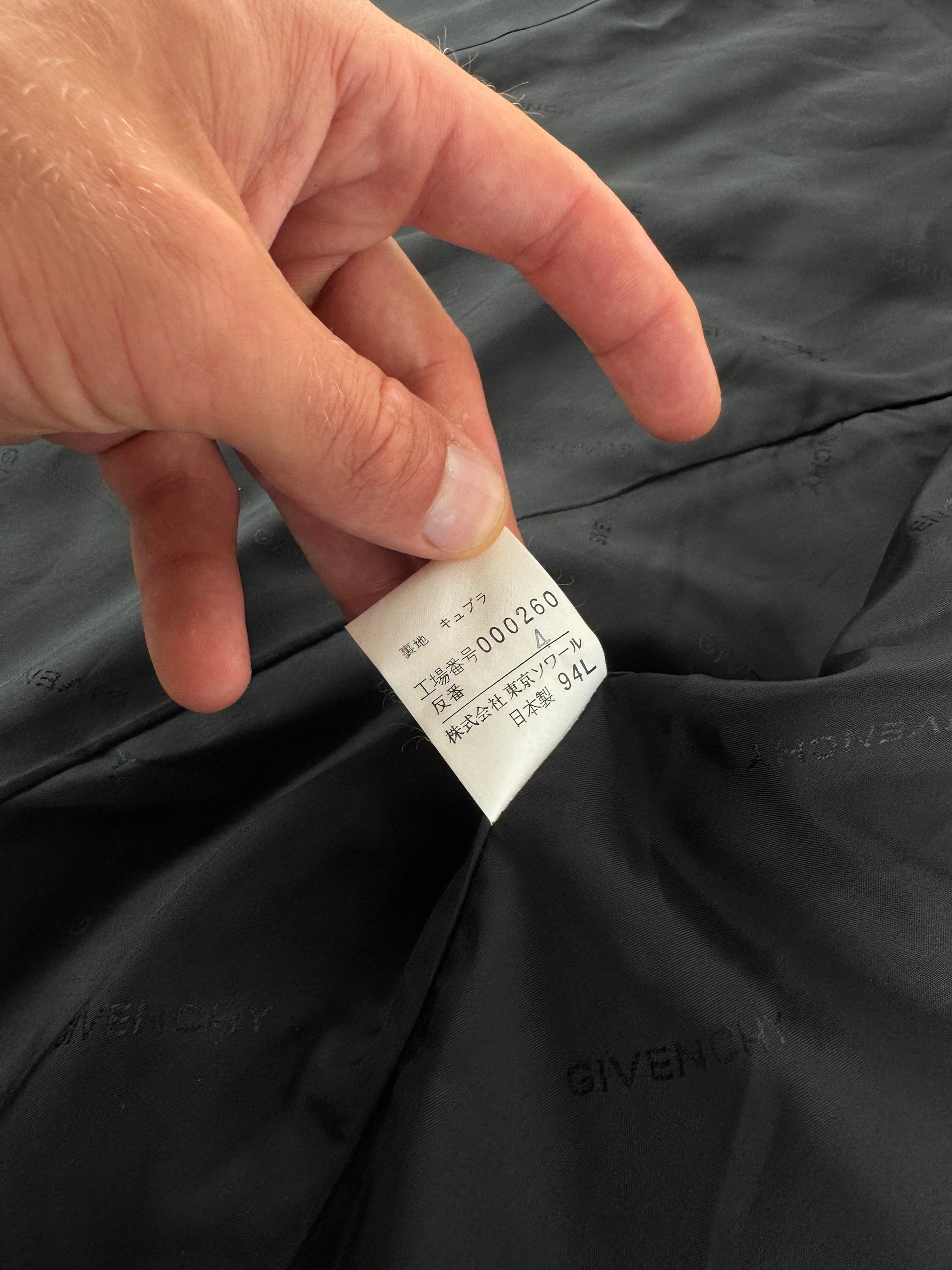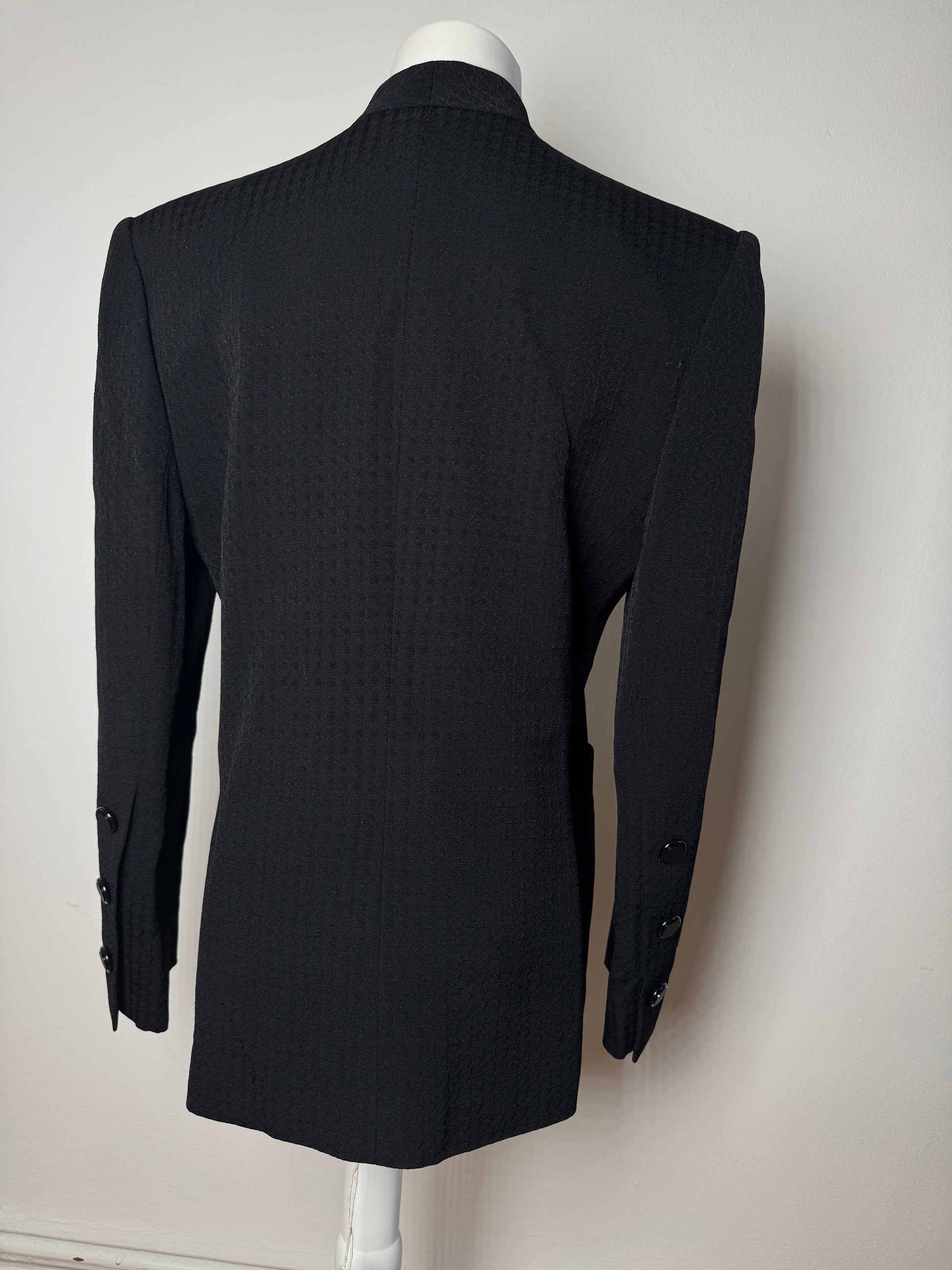 This structured vintage blazer is finely crafted of black fabric made from 65% triacetate and 35% viscose. It features a distinctive collar design, padded shoulders, and black plastic buttons. The interior is lined with grey fabric printed with black Givenchy logos.