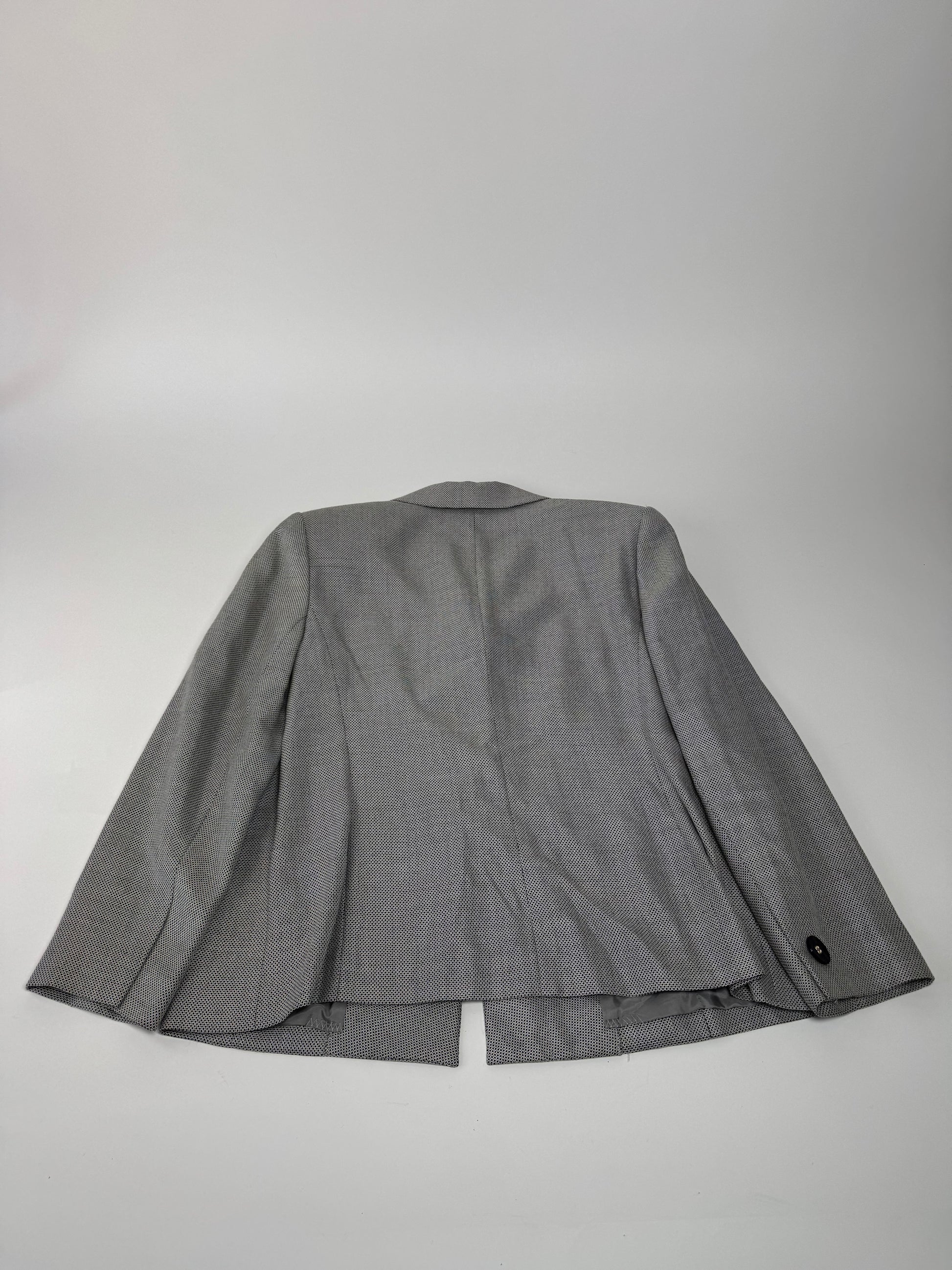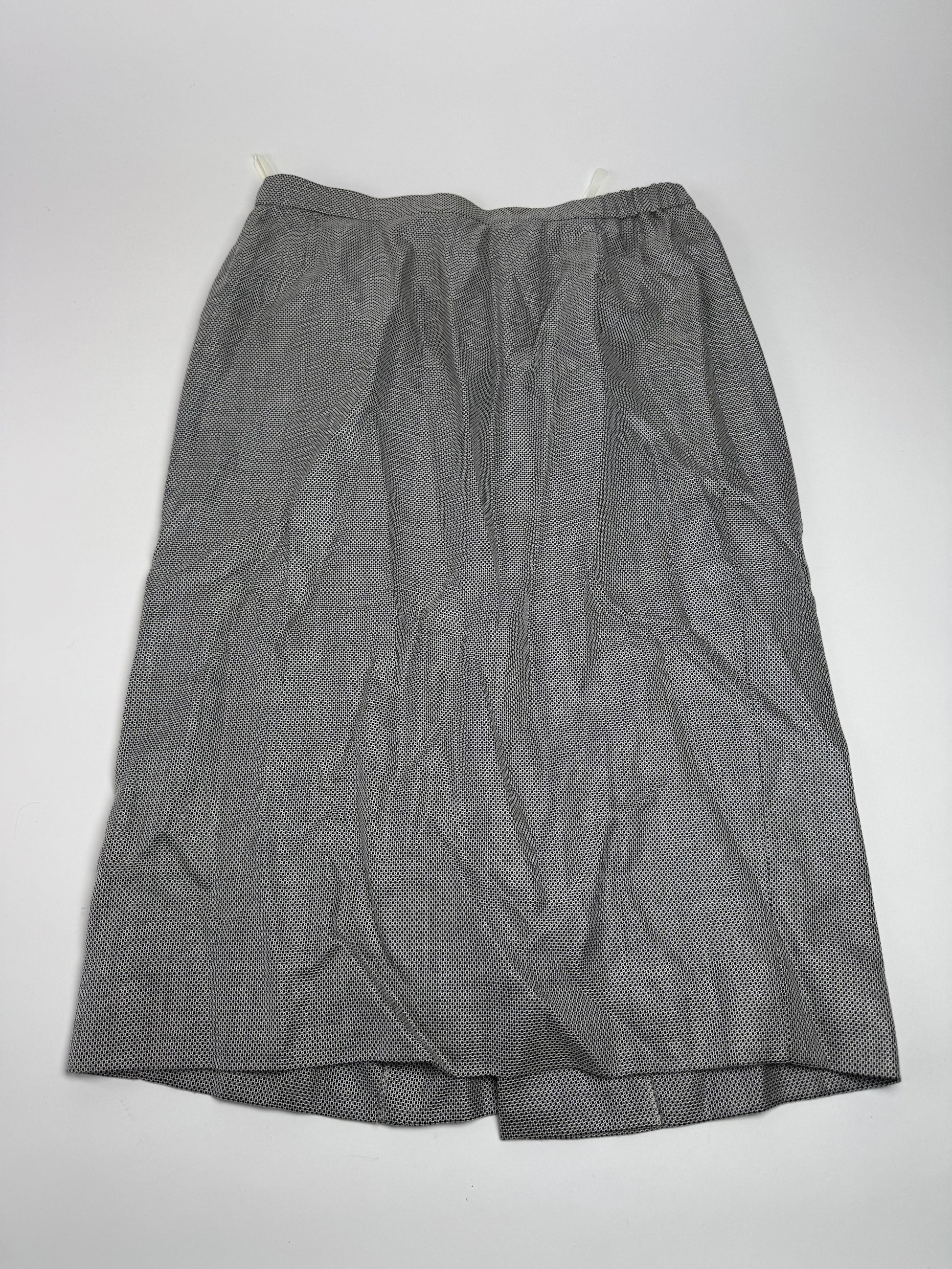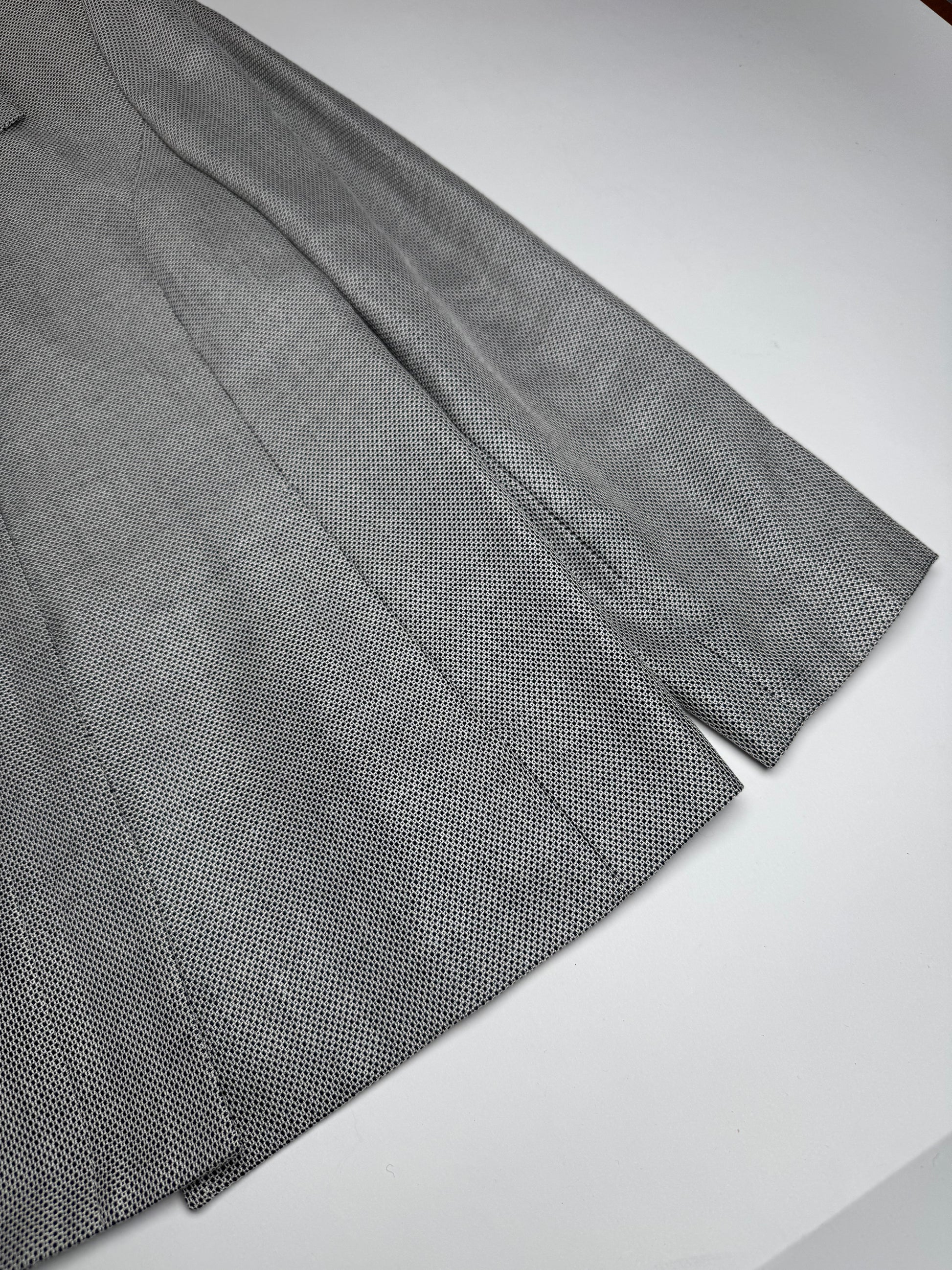 GIVENCHY Vintage Twin Set. This sophisticated vintage twin set from Givenchy features a chic grey and black polka dot pattern. The ensemble includes a structured blazer with shoulder pads and a high-waisted skirt, creating a timeless and elegant silhouette. Crafted from a luxurious wool and polyester blend, this set offers both style and comfort.