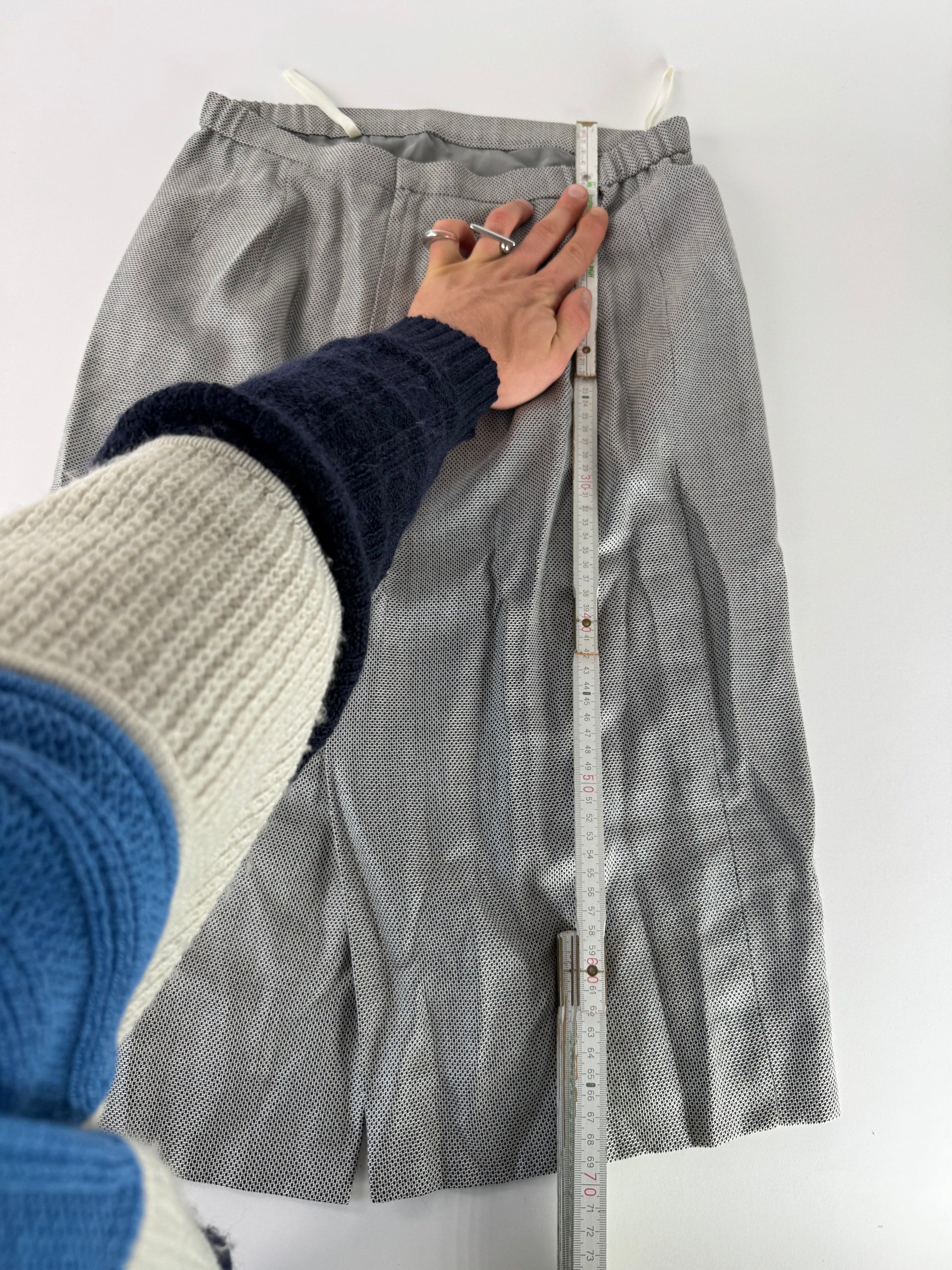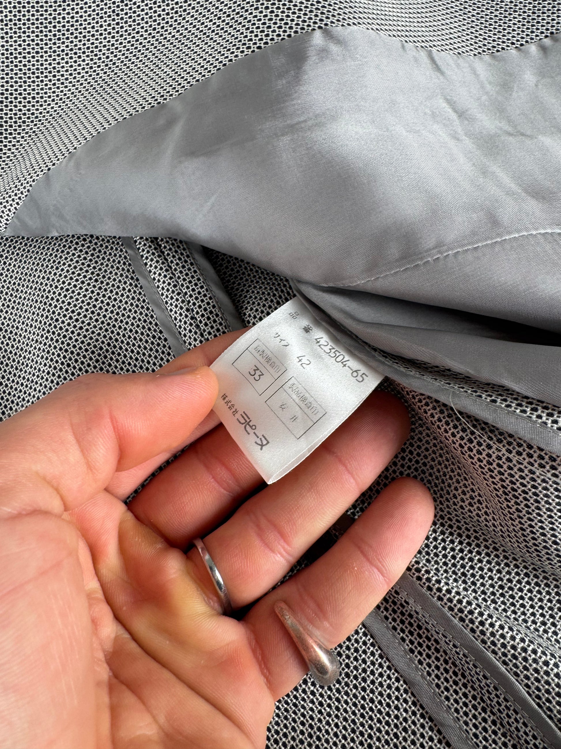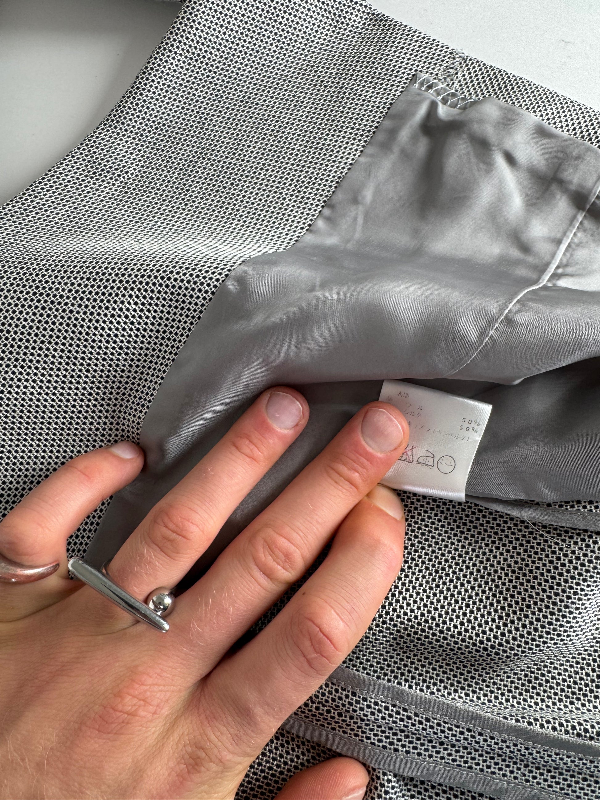GIVENCHY Vintage Twin Set. This sophisticated vintage twin set from Givenchy features a chic grey and black polka dot pattern. The ensemble includes a structured blazer with shoulder pads and a high-waisted skirt, creating a timeless and elegant silhouette. Crafted from a luxurious wool and polyester blend, this set offers both style and comfort.
