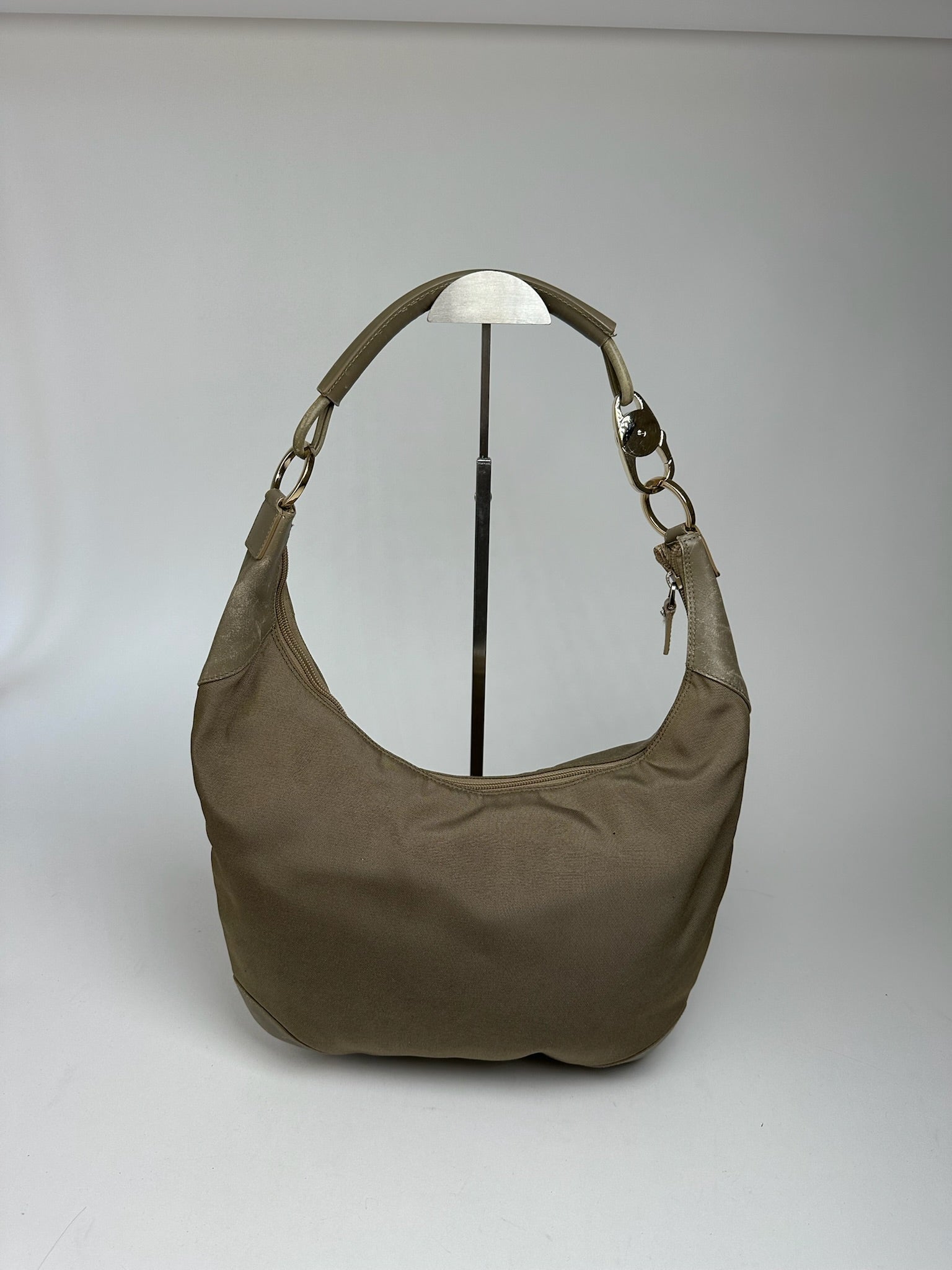 GUCCI Vintage Handbag. This chic handbag is finely crafted of brown canvas and features gold-tone steel hardware with a brown leather handle. The design is both elegant and practical, making it a timeless addition to any collection.