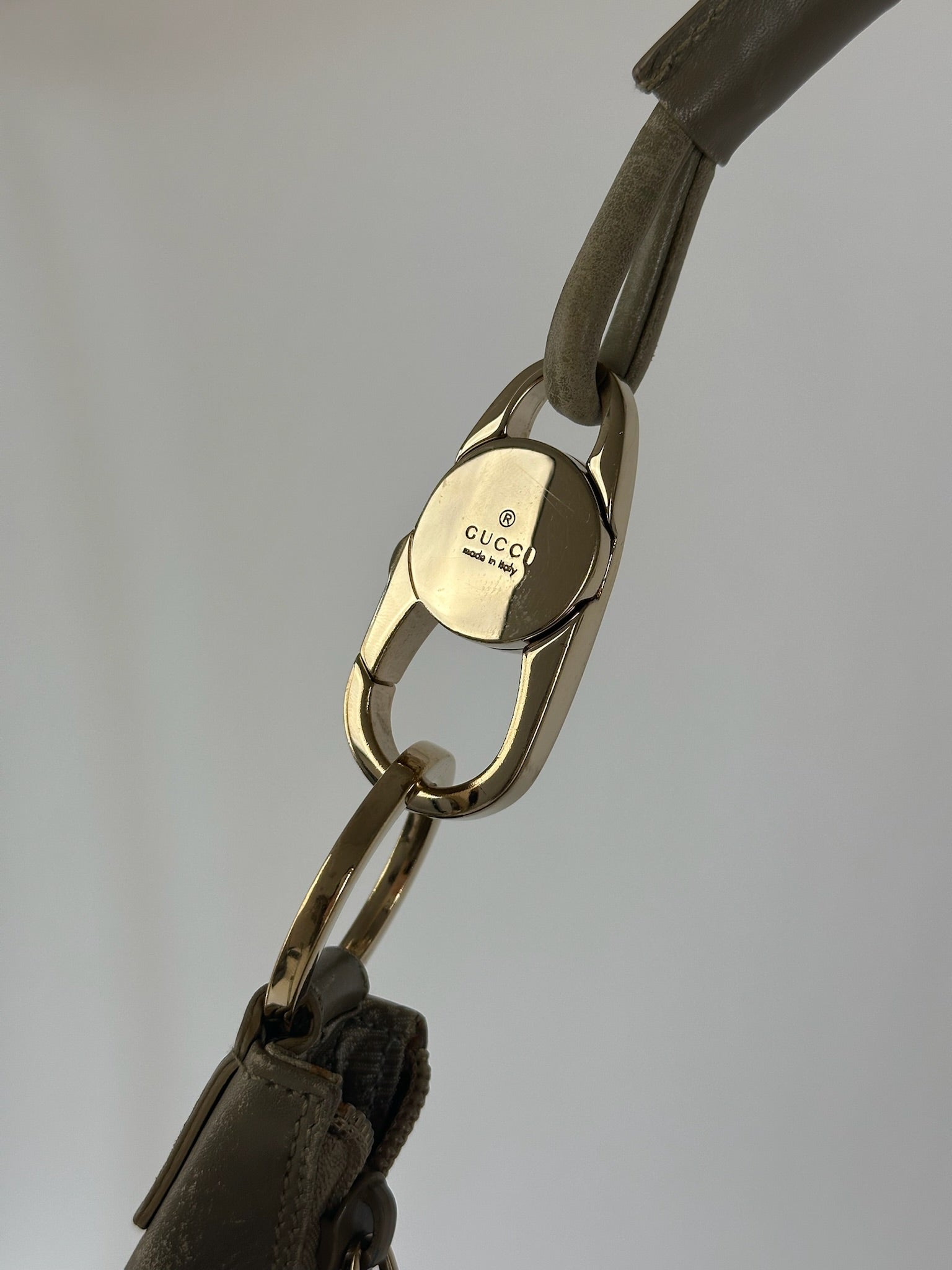 Condition Details: The exterior shows some stains and scratches but remains in very good overall condition. The hardware has minor surface wear. The interior is lined with gold-brown Gucci monogram canvas and is clean and well-maintained.