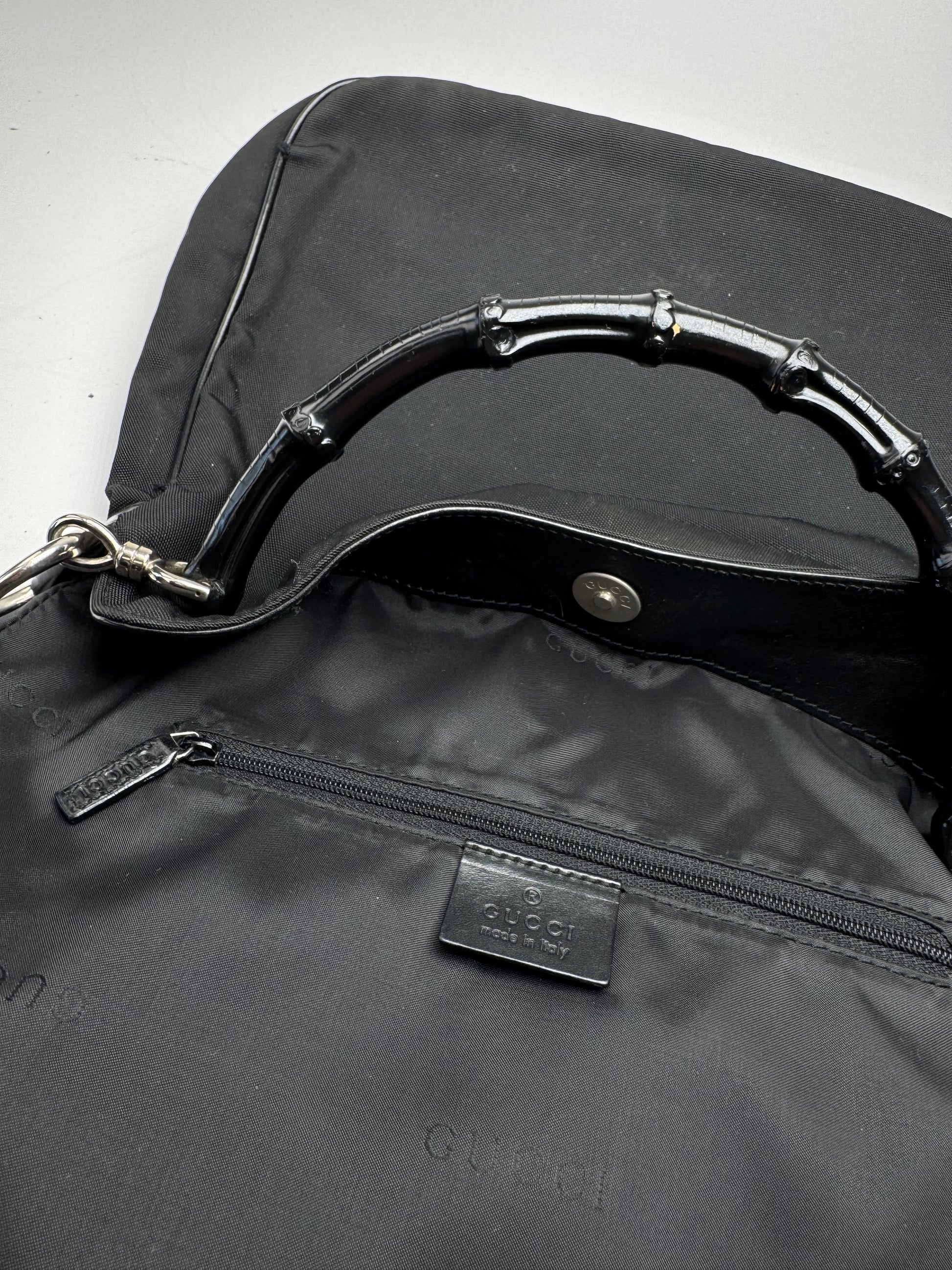 GUCCI Vintage Bamboo Top Handle Bag. This elegant vintage handbag is crafted from black canvas and features a signature black bamboo handle, complemented by silver-tone steel hardware for a refined look.