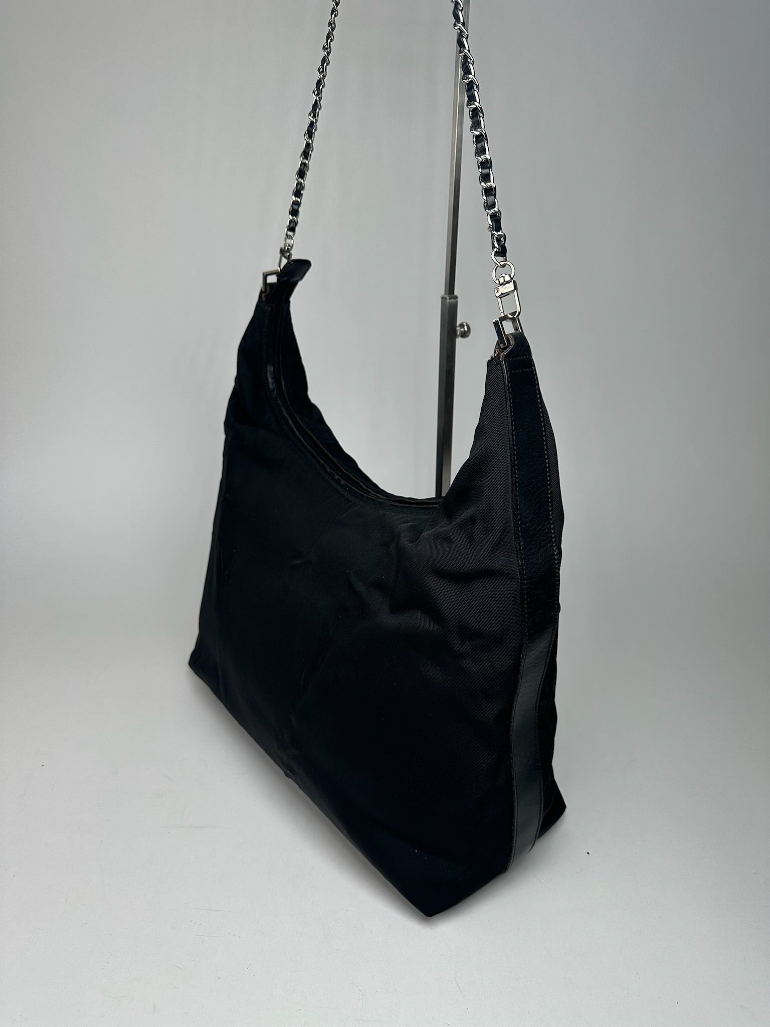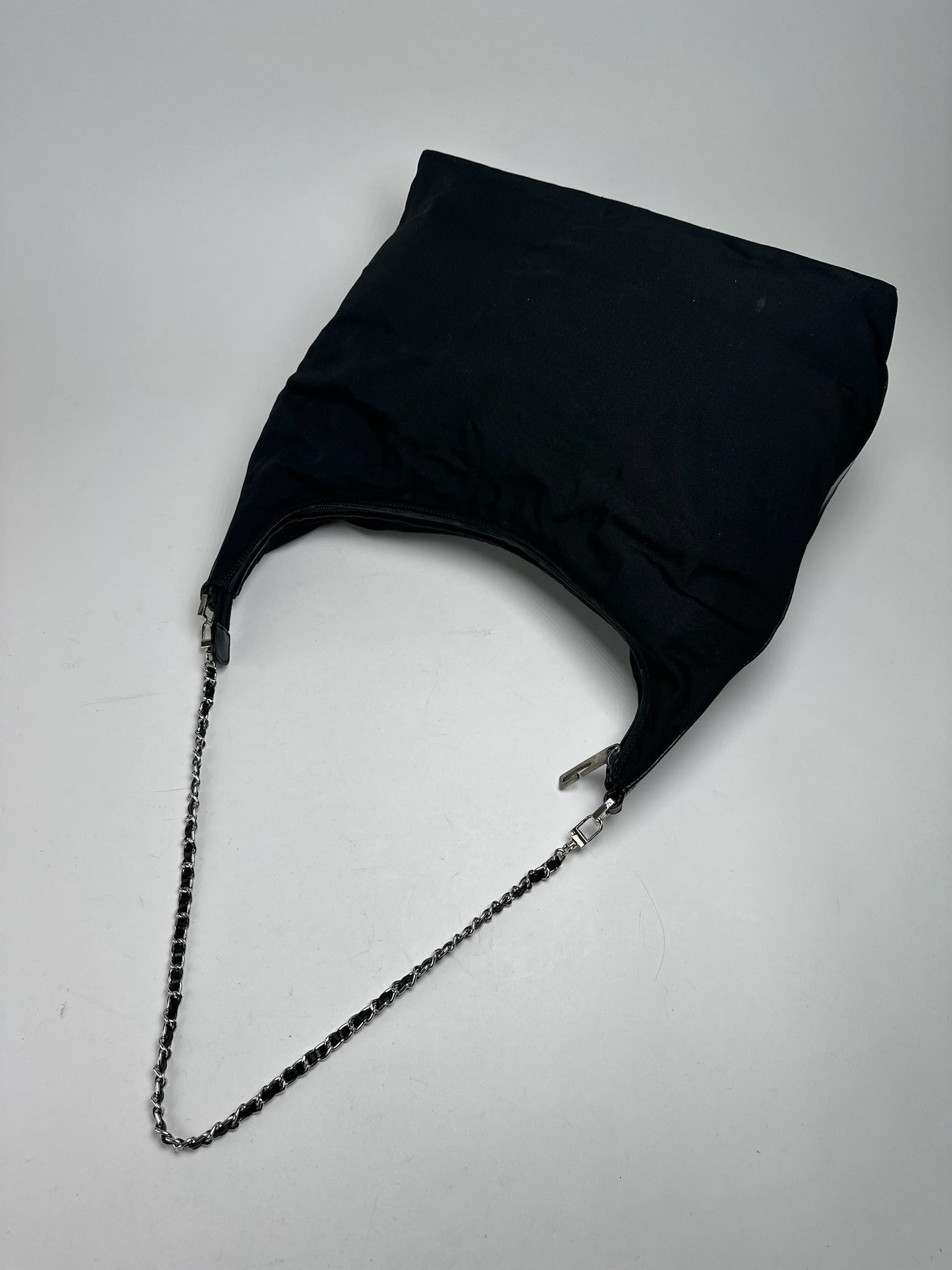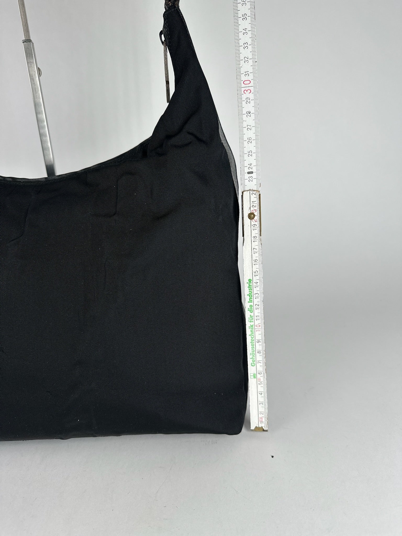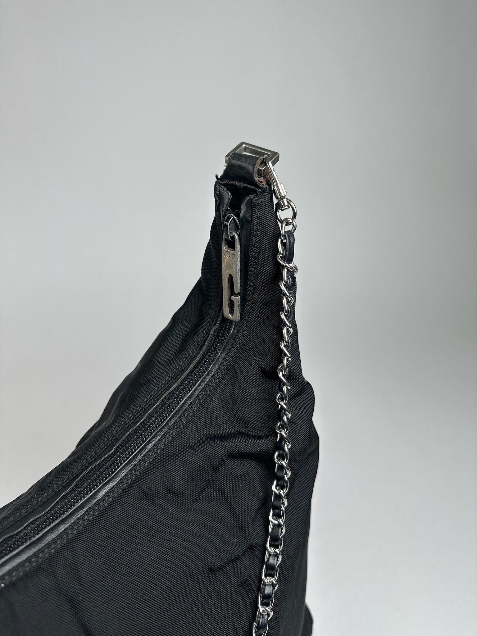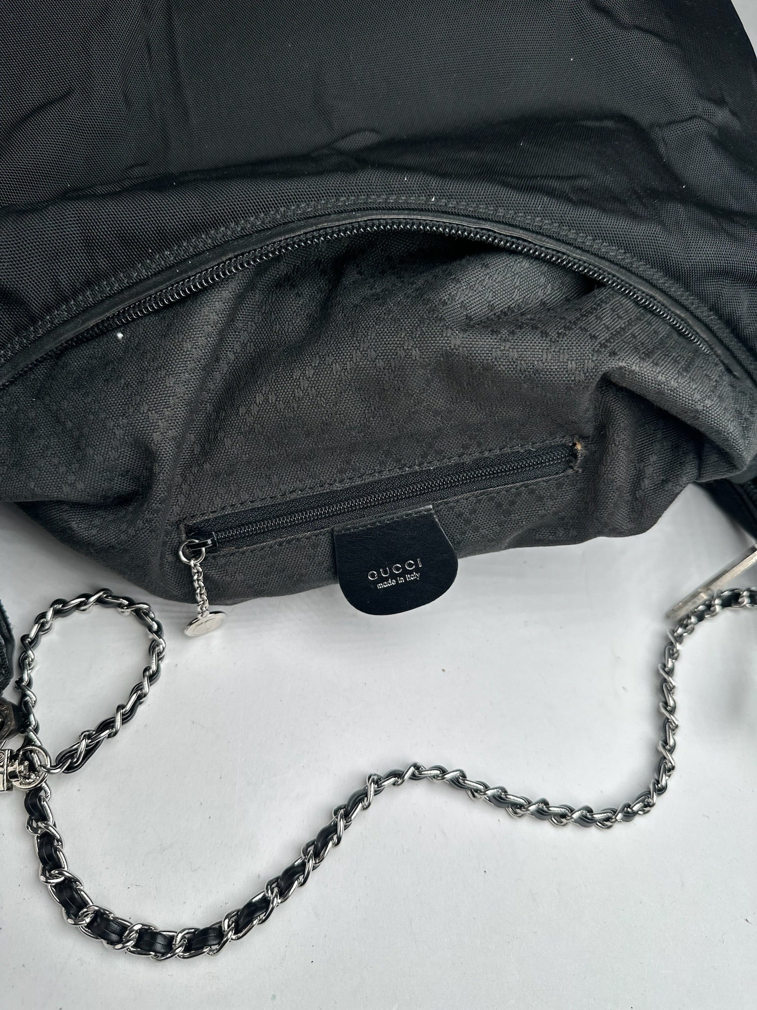 GUCCI Vintage Canvas Shoulder Bag. This chic shoulder bag is finely crafted of black canvas with leather accents. The bag features a top zipper closure and silver-tone steel hardware. The interior is lined in black Gucci monogram canvas.