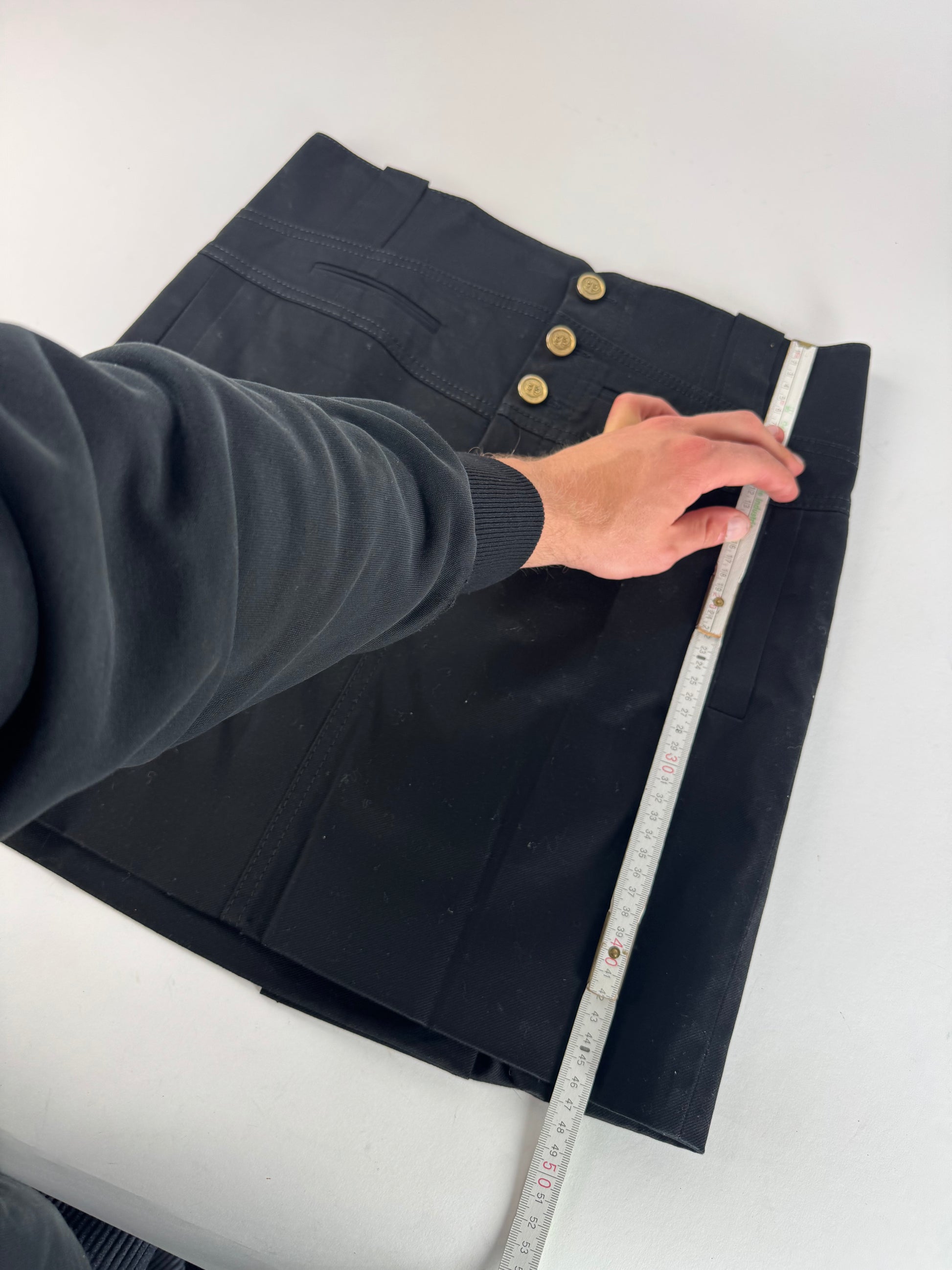 GUCCI Vintage Skirt. This elegant vintage skirt is crafted of sturdy black cotton. The skirt features three gold-tone metal buttons on the front with an anchor-style GG logo detail. The anchor-inspired motif is a signature nod to Gucci’s historic nautical influences, often seen in the brand’s heritage designs and symbolizing classic Italian seaside elegance with the iconic GG twist. Made in Italy.
