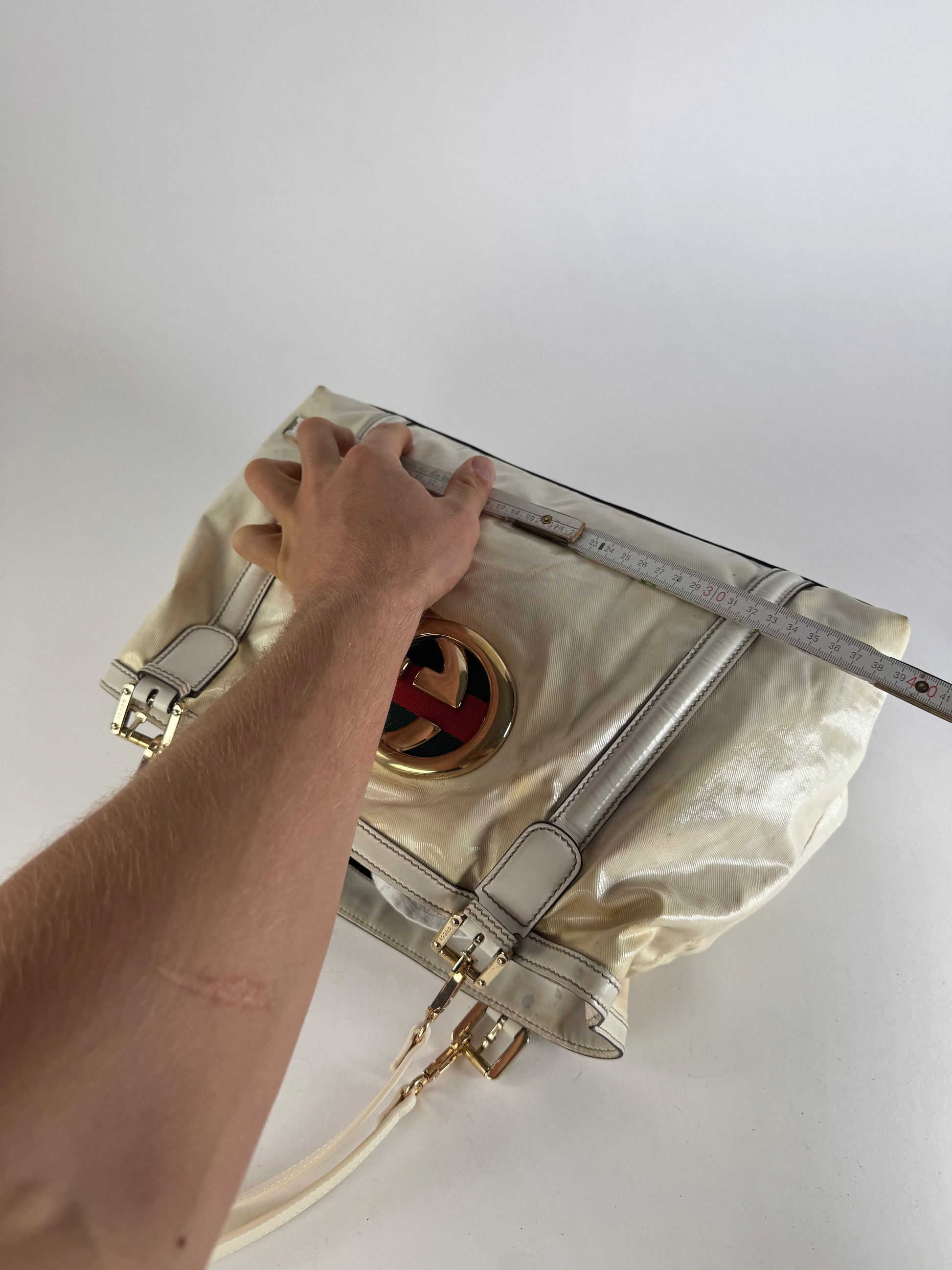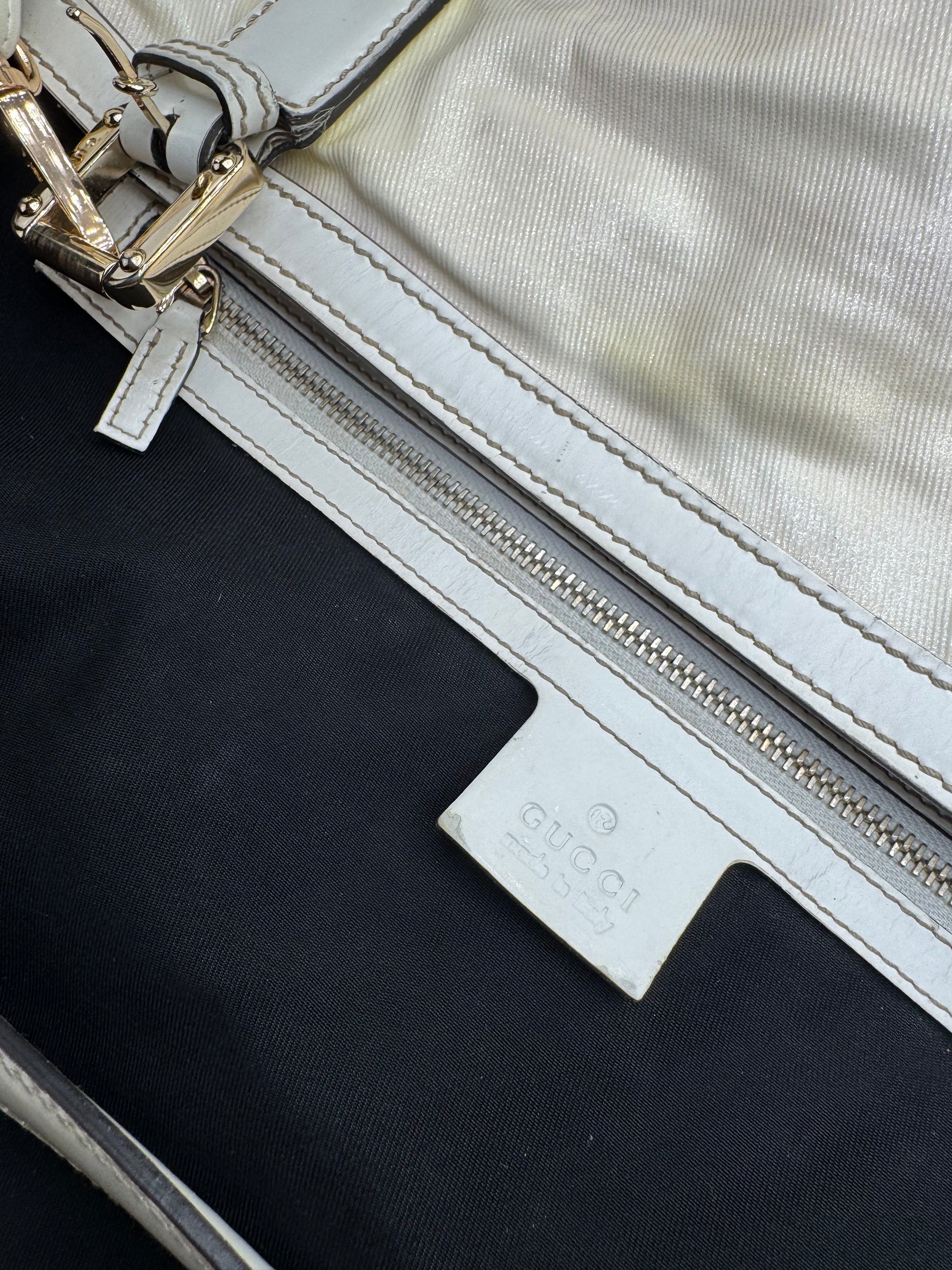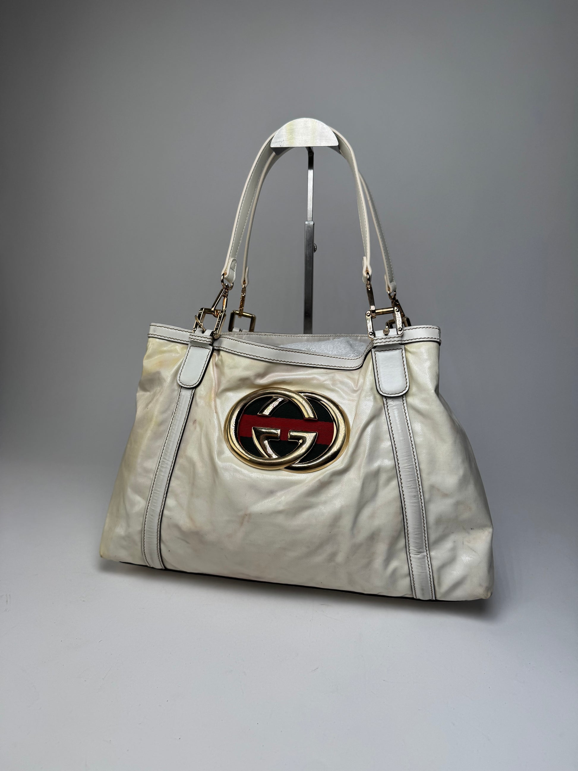 GUCCI Vintage Tote Bag. This chic tote bag is finely crafted of white leather and white vegan leather. The handbag features dual top handles, a signature GG logo in gold-tone steel on the front, and the iconic green-red web stripe detail. The top opens to a black canvas interior lining.