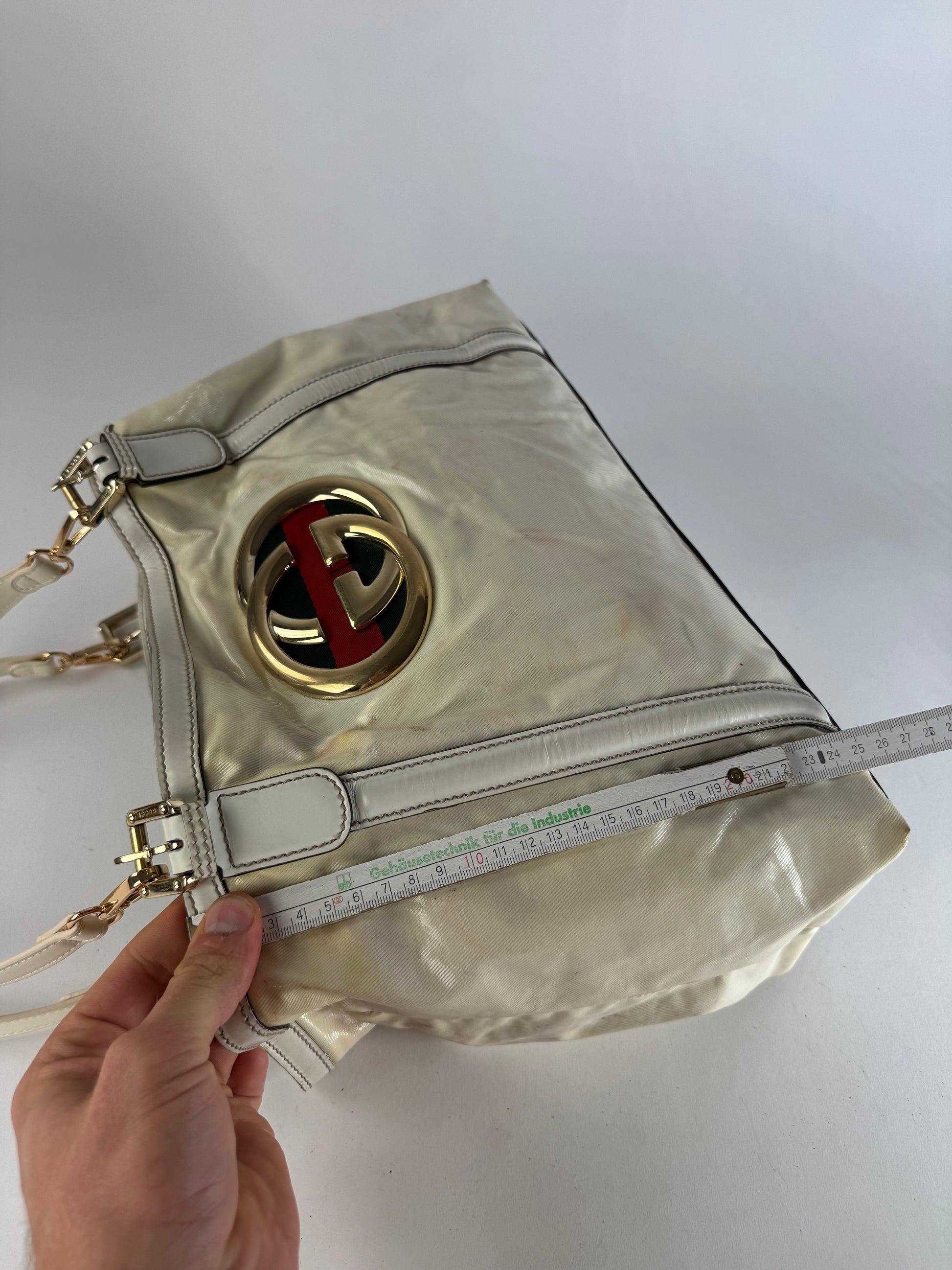 Condition Details: The exterior is in good condition with a large stain on the back and light discoloration throughout. One of the original handles is missing, therefore two new replacement handles (not Gucci) were purchased to attach. The hardware is bright and crisp with hairline scratches. Serial number reads: 1620942133317.
