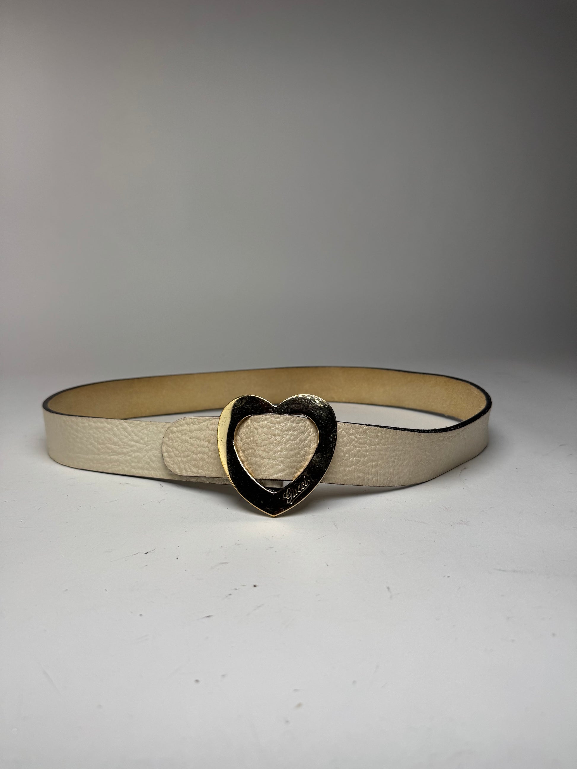 GUCCI Heart Buckle Leather Belt. This vintage belt is crafted from white leather and features a gold-tone steel buckle with a cut-out heart design and engraved Gucci logo. The interior is lined with soft suede for added comfort. This piece is made in Italy and carries the serial number 2113316534.