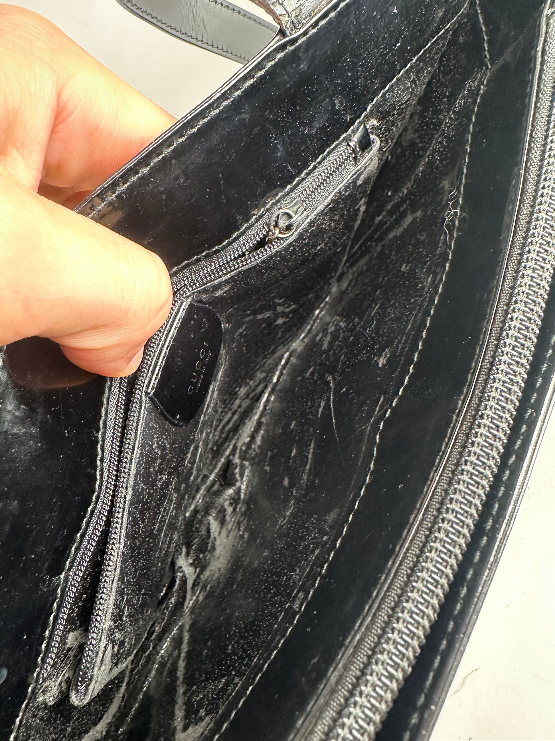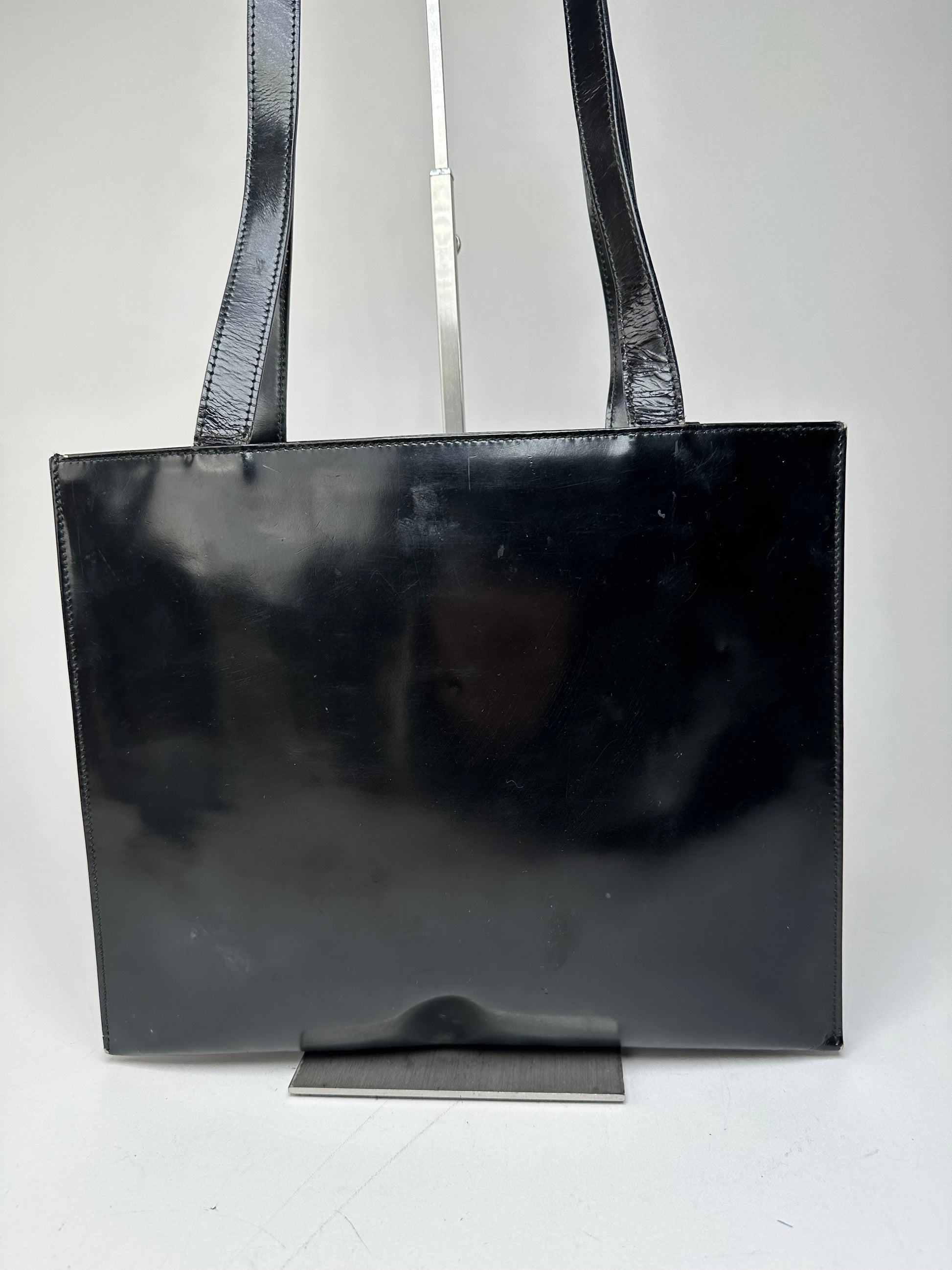 Condition Details: The exterior patent leather is clean and beautiful in good condition with light signs of wear. The interior lining is heavily damaged and may require cleaning or replacement. The silver-tone and black-tone hardware remains bright with surface scratches. Authenticity code reads: 00219980341.
