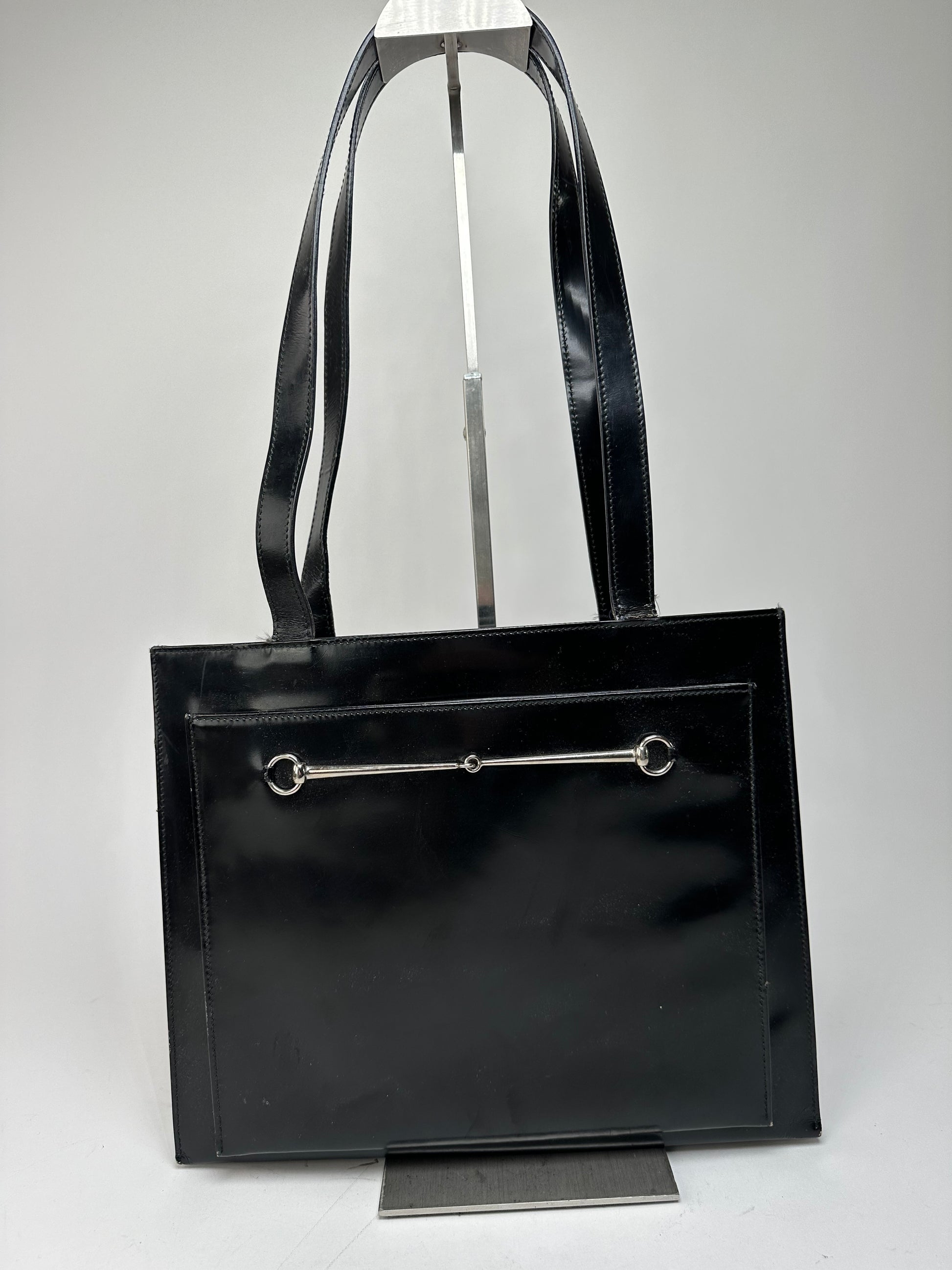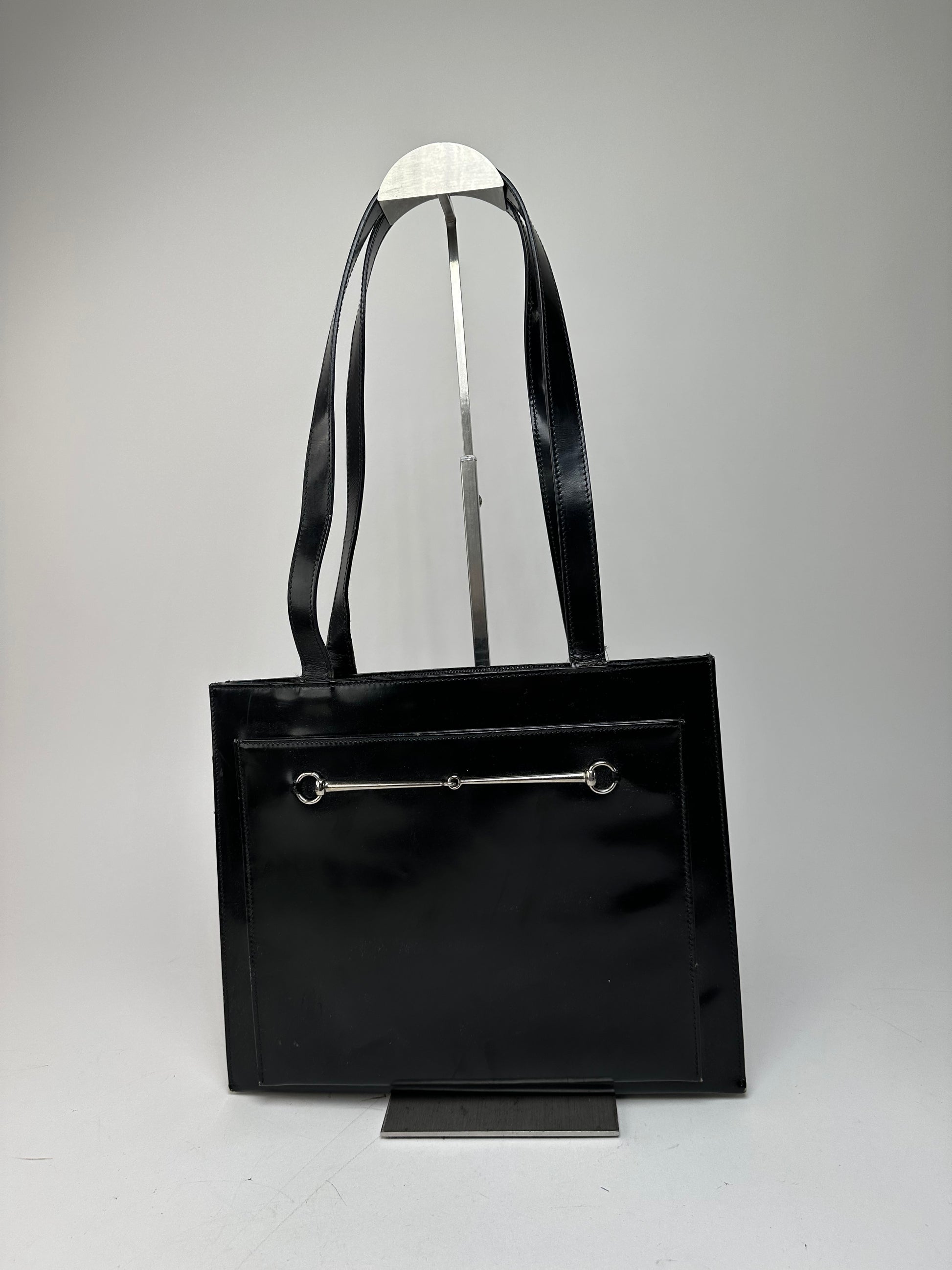 GUCCI Vintage Handbag. This elegant rectangular handbag is finely crafted of black patent leather and features the iconic Horsebit appliqué in silver-tone steel on the front. The bag is designed with two medium-length handles and multiple compartments including zipper, magnetic, and open sections for organized storage.