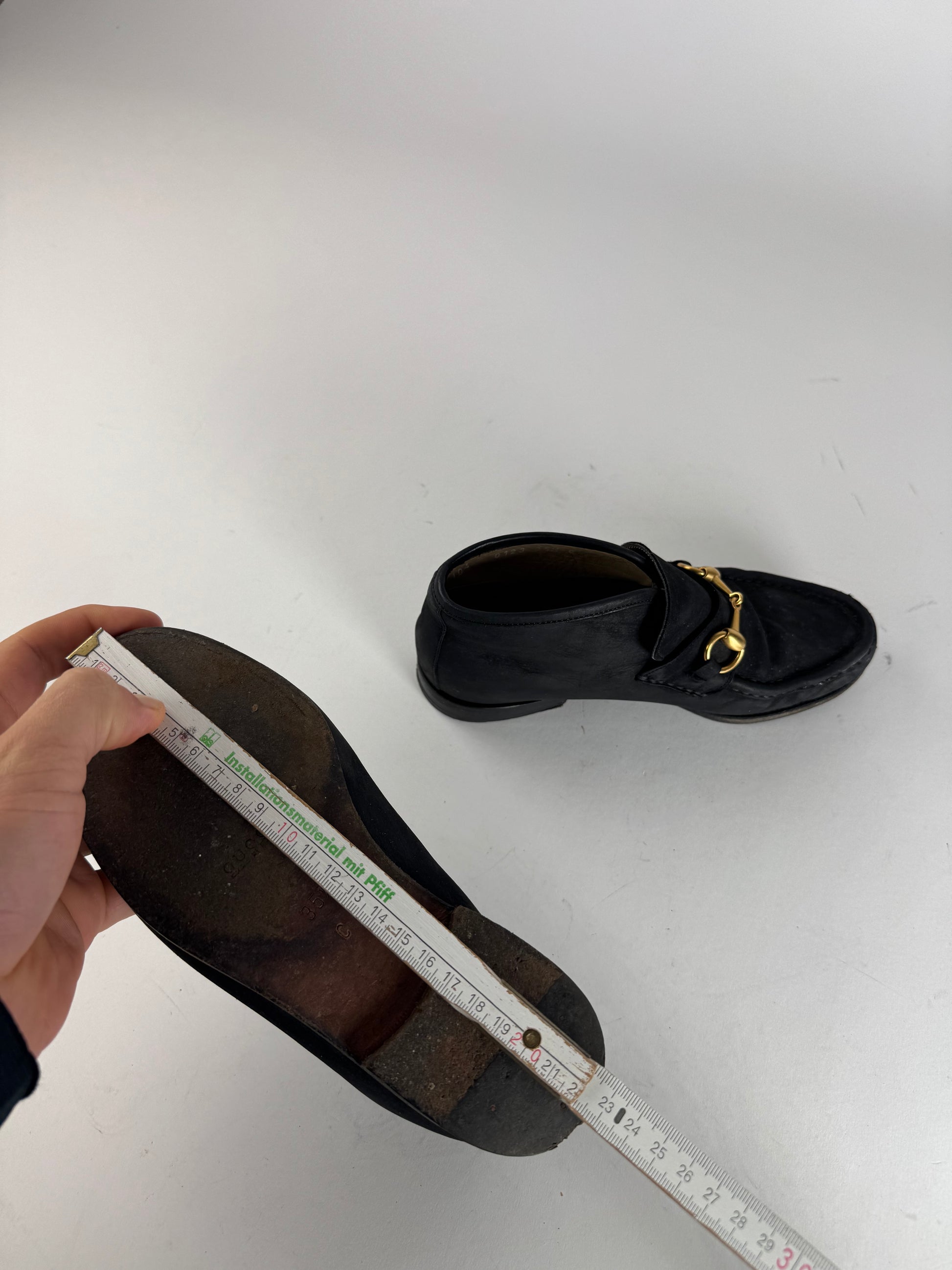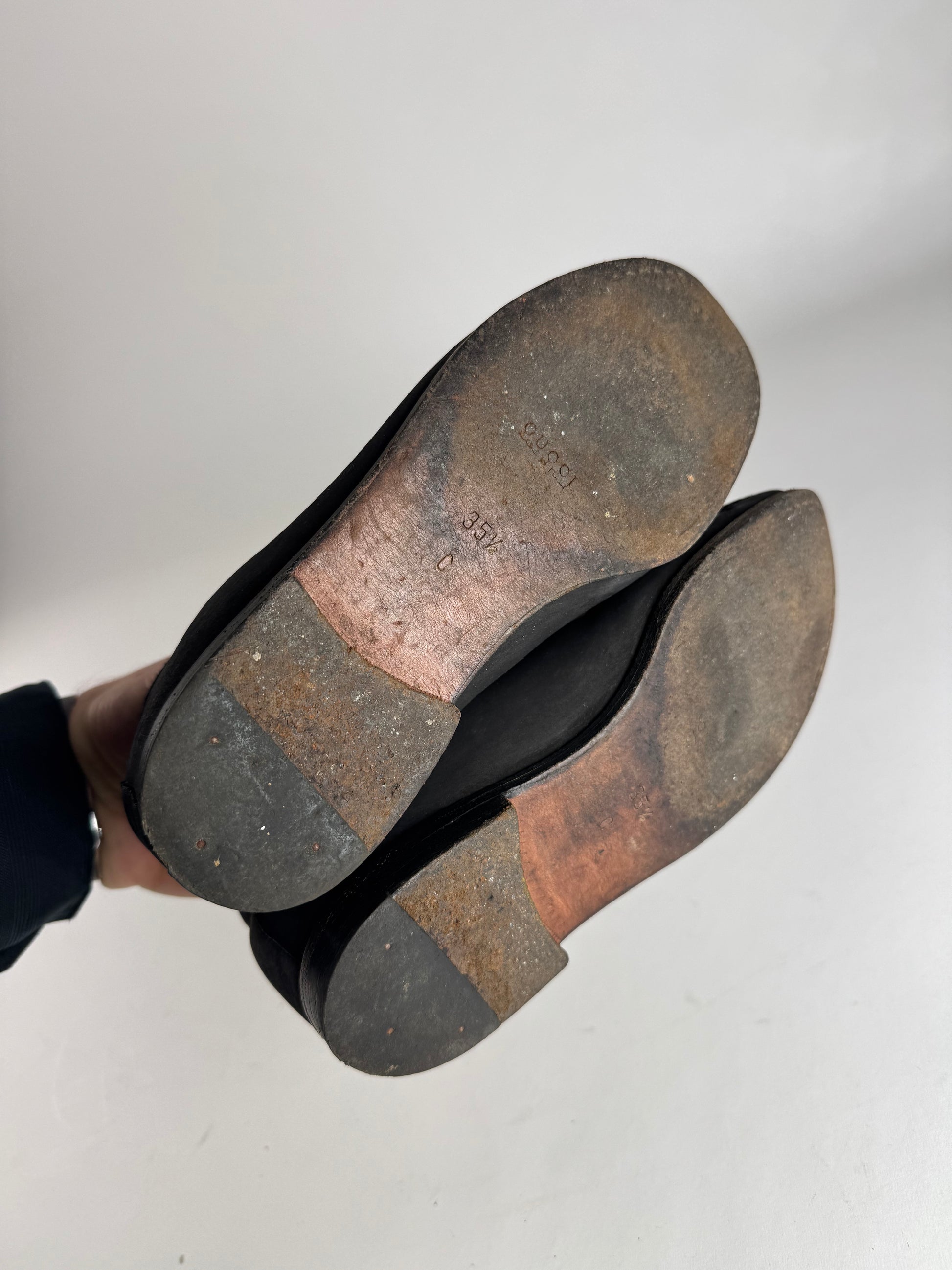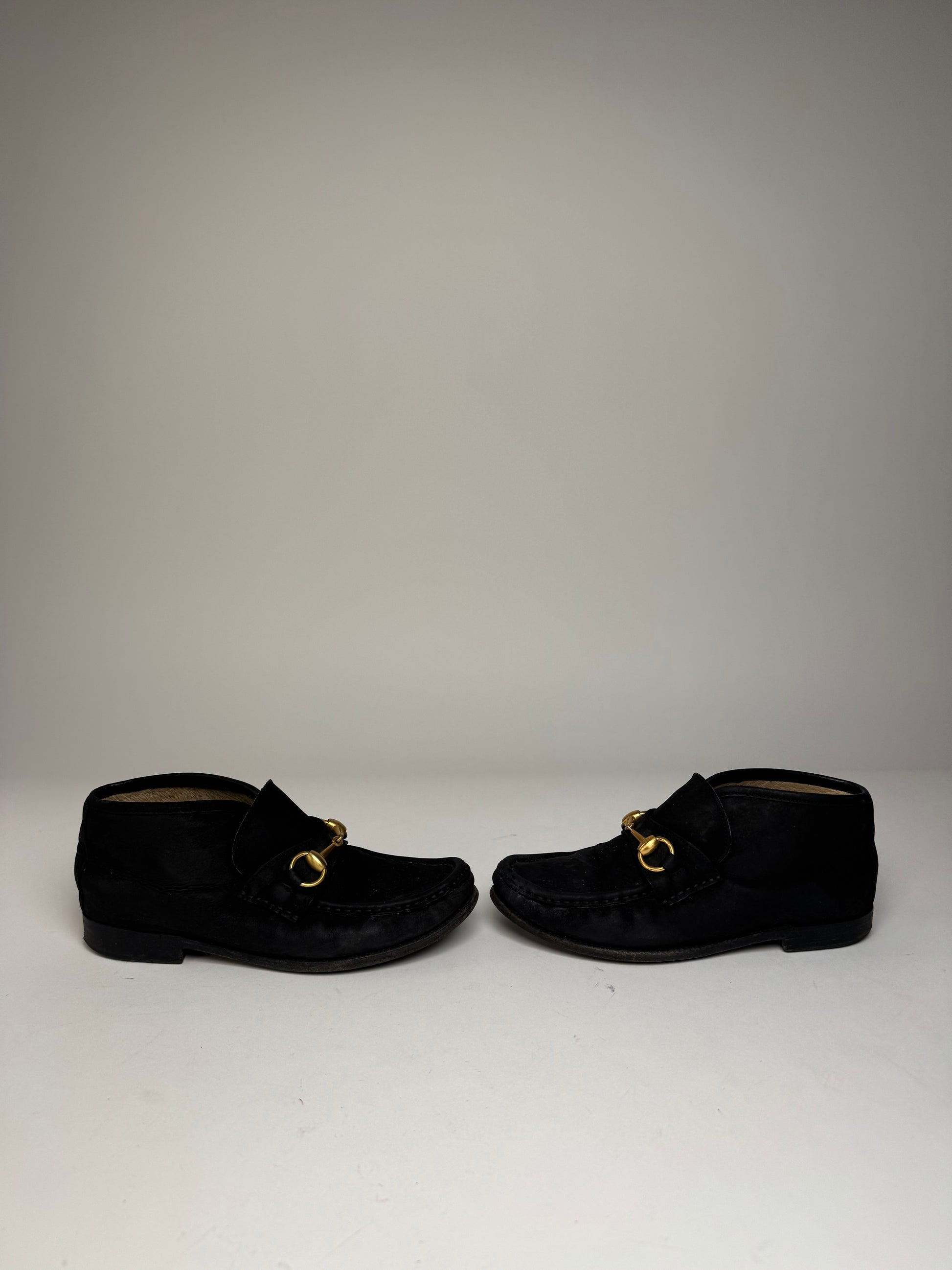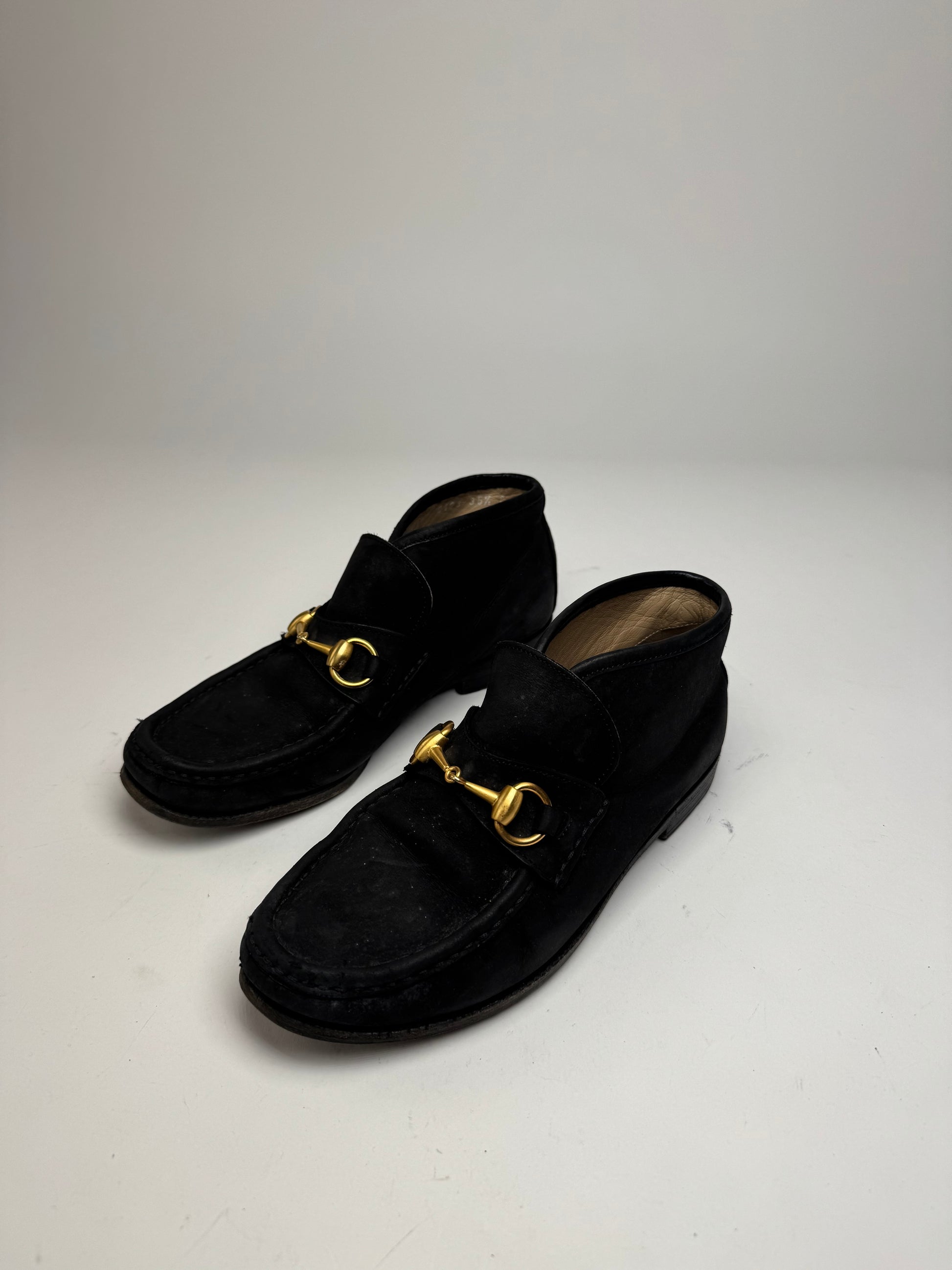 GUCCI Vintage Suede Horsebit Boots. These iconic boots are finely crafted of black suede and feature the signature Gucci Horsebit detail in polished gold-tone steel across the instep. Introduced in the 1950s, the Horsebit became one of Gucci’s most recognizable house symbols, inspired by equestrian heritage and still celebrated as a timeless signature detail today. The boots are finished with a sturdy wood and rubber sole, combining elegance with everyday durability.